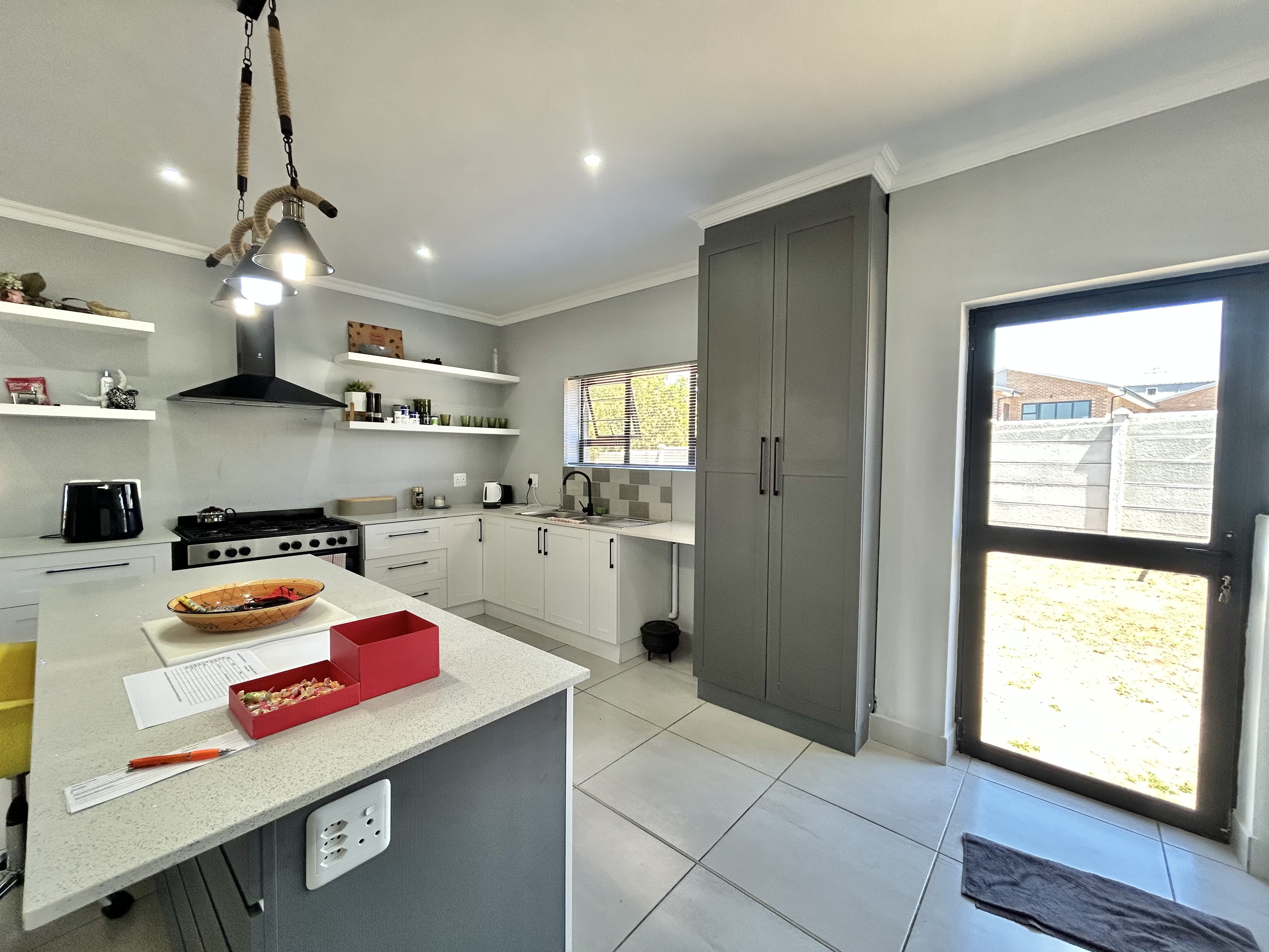 The kitchen is a chef’s delight, featuring a centre island, Caesarstone countertops, a breakfast nook, ample storage, a scullery, and fittings for both a gas stove and dishwasher. Three well-sized bedrooms, each with built-in cupboards, are positioned for privacy, complemented by two stylish bathrooms, including a main en-suite.