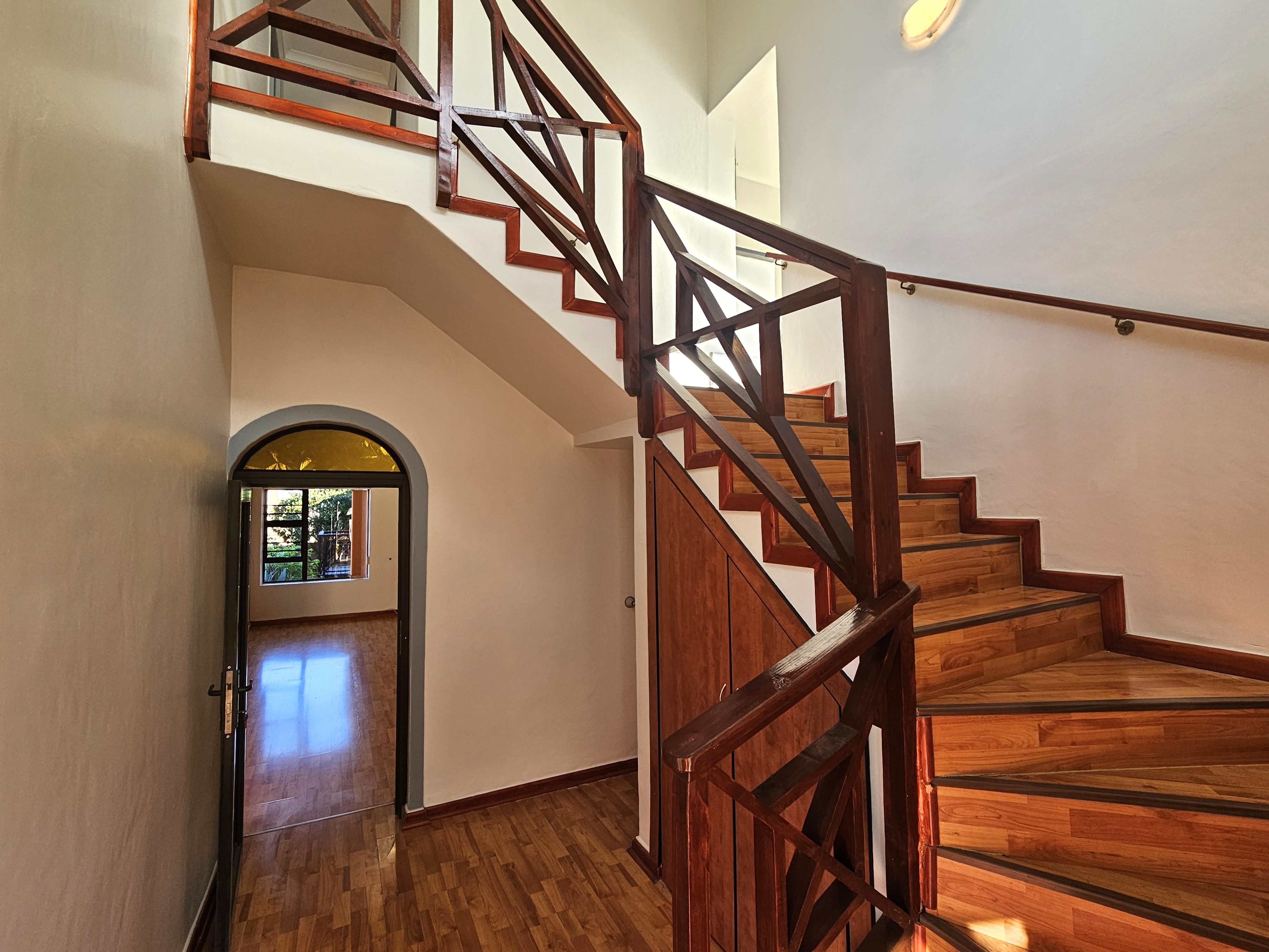 The entrance opens into a spacious foyer, setting the tone for the expansive interior. The ground floor features a large open-plan living and dining area, a formal lounge, an indoor braai/entertainment space, and a well-appointed kitchen with granite countertops and a separate scullery. A laundry room and additional toilet are conveniently located outside.