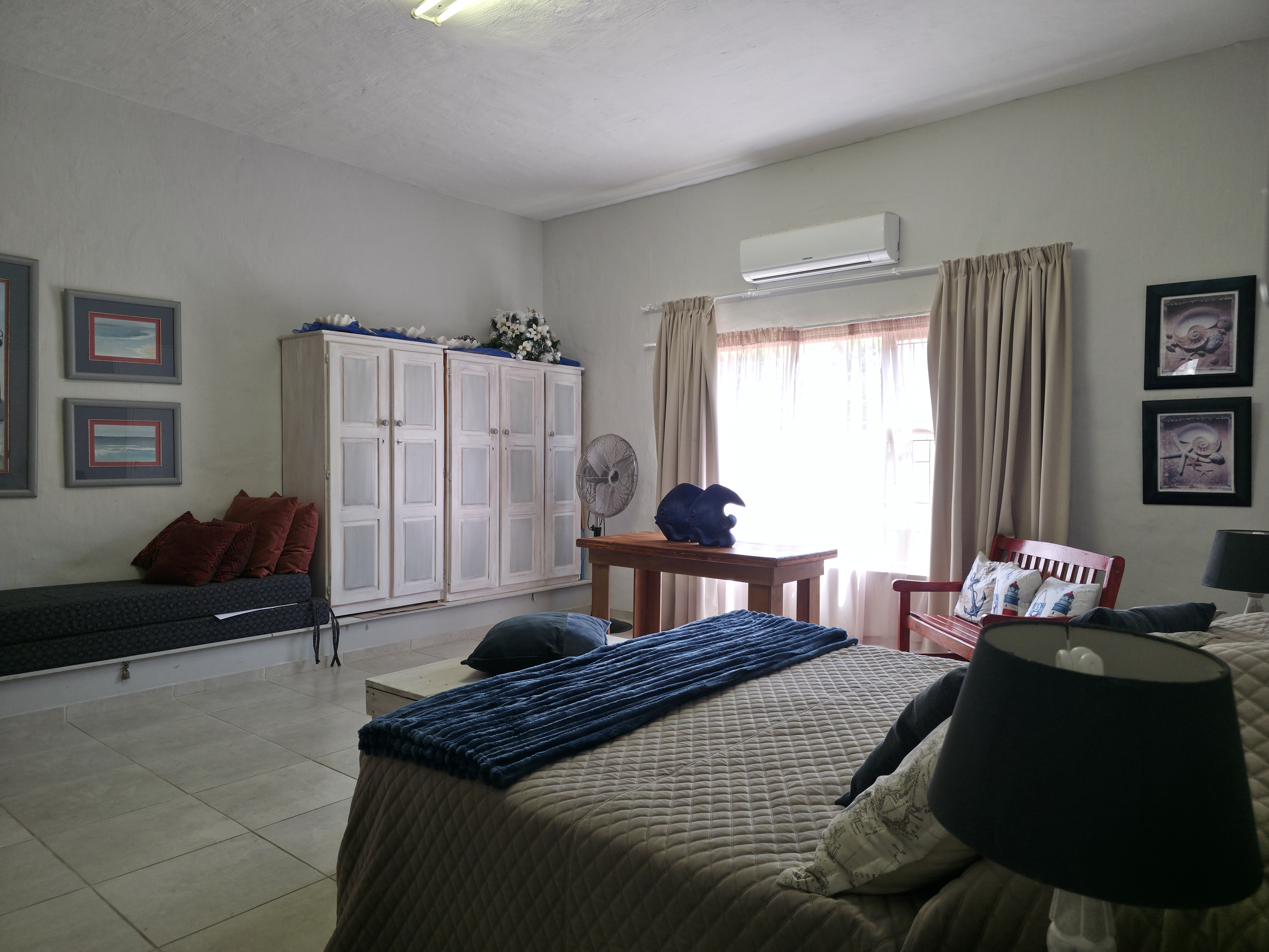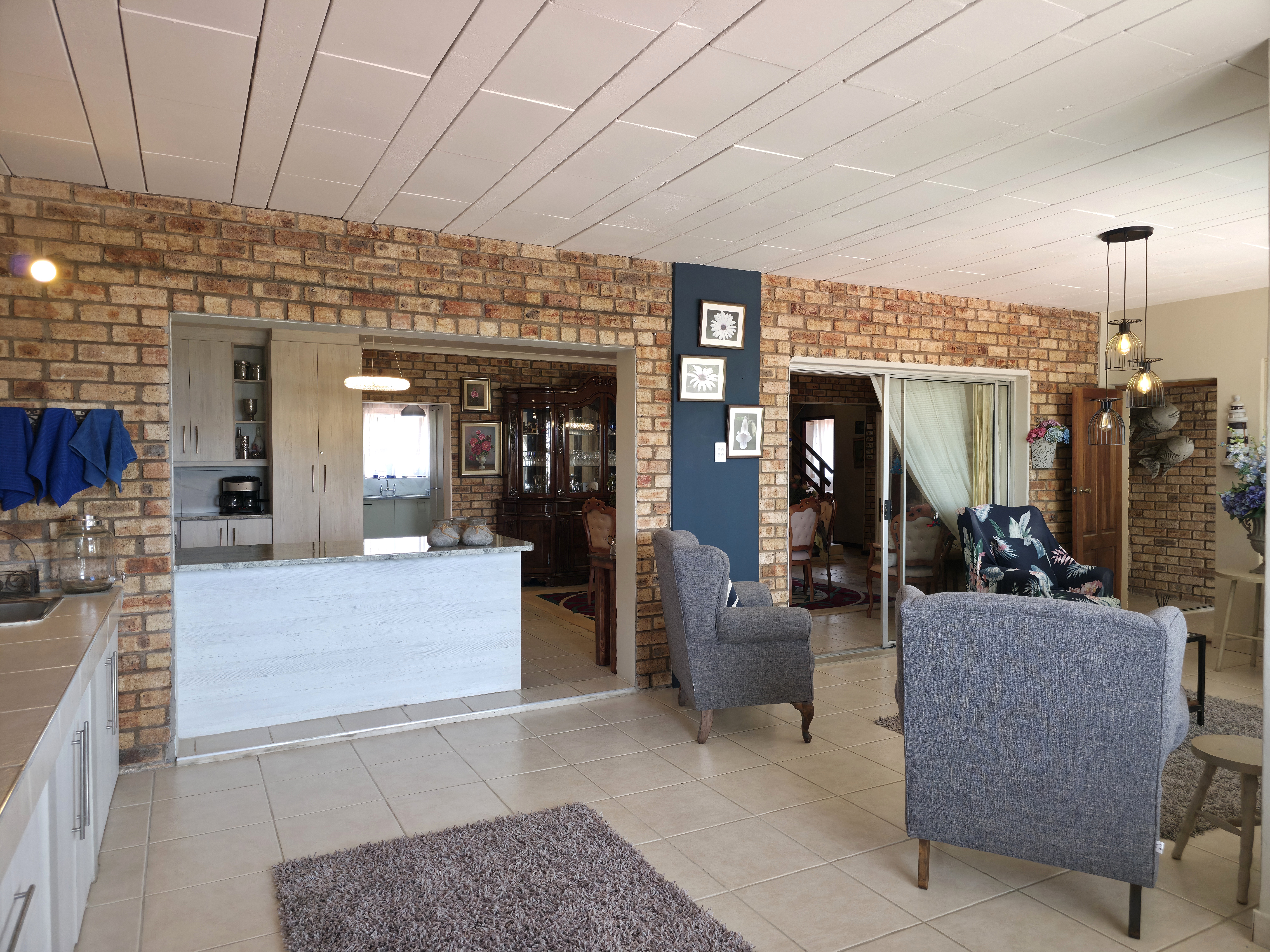 Additional features include multiple water tanks (5,000L, 2,500L and 1,000L) plumbed into the home, a borehole, two inverters with lithium batteries, and 12 solar panels to support your energy needs. Aluminium window frames enhance the home’s modern design, while a combination of tiled and carpeted flooring ensures comfort throughout. Security features include an alarm system, beams, and exterior lighting for complete peace of mind.