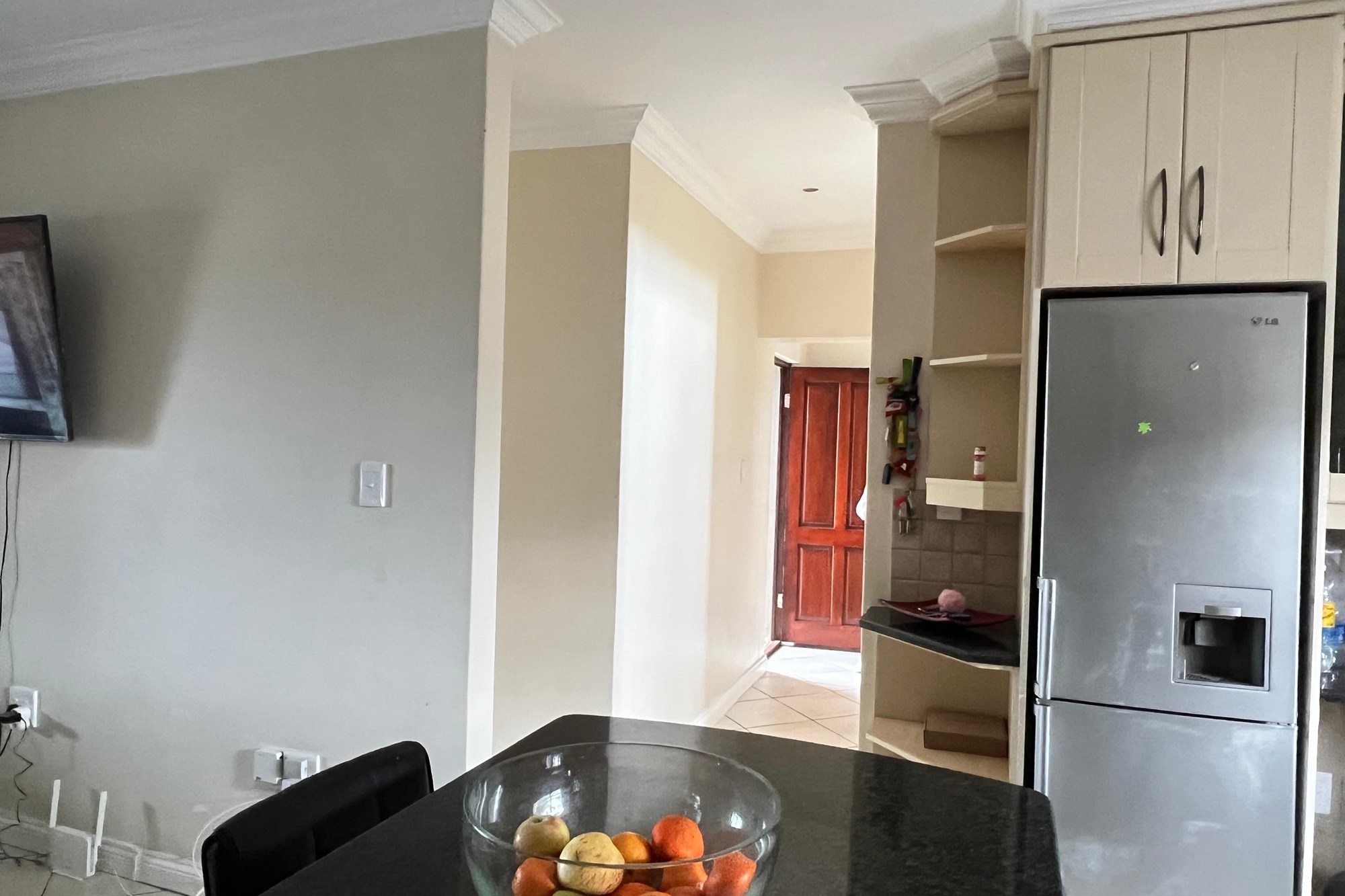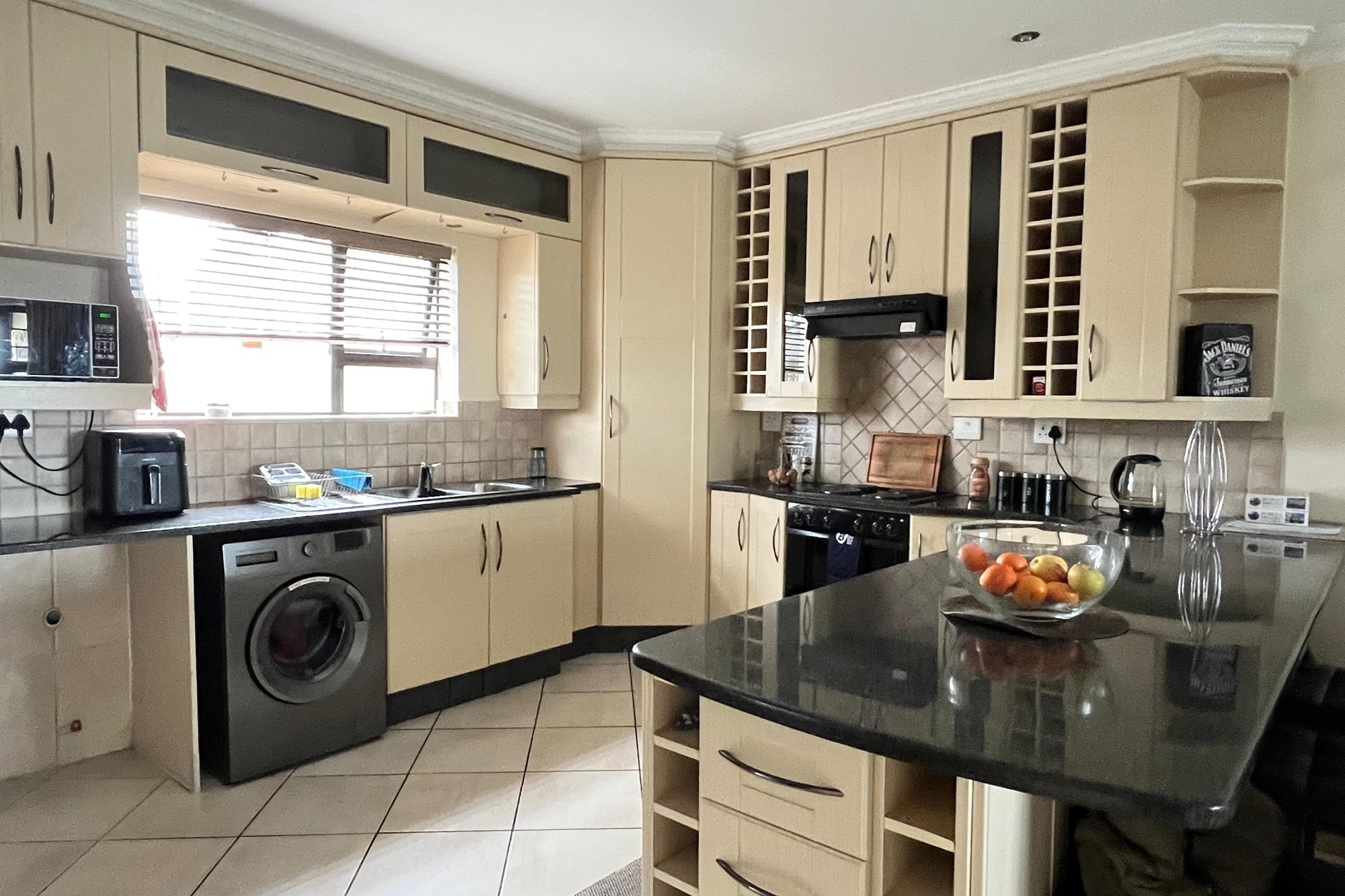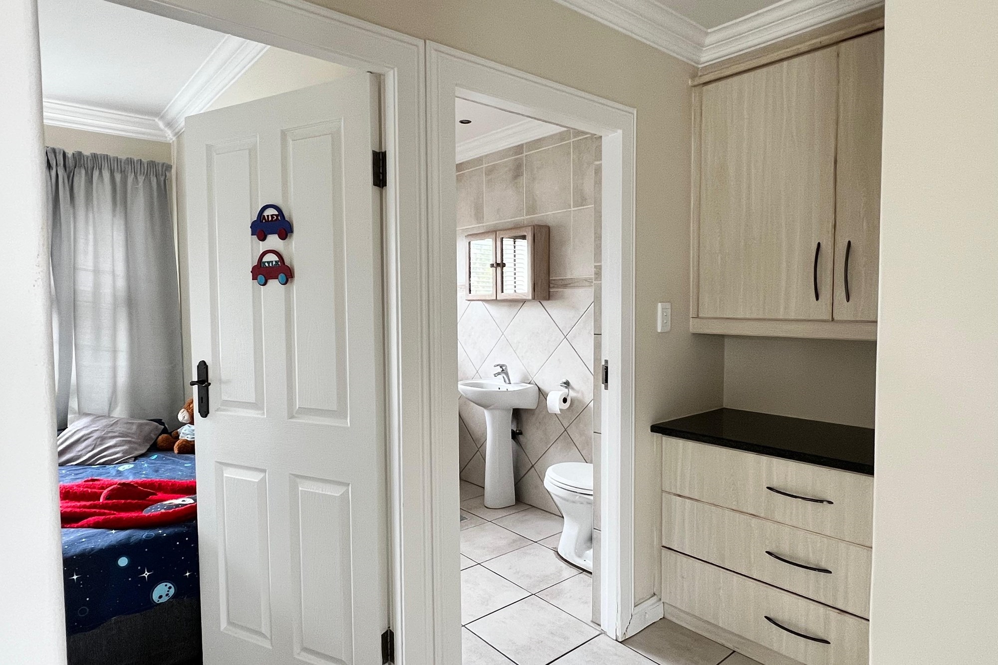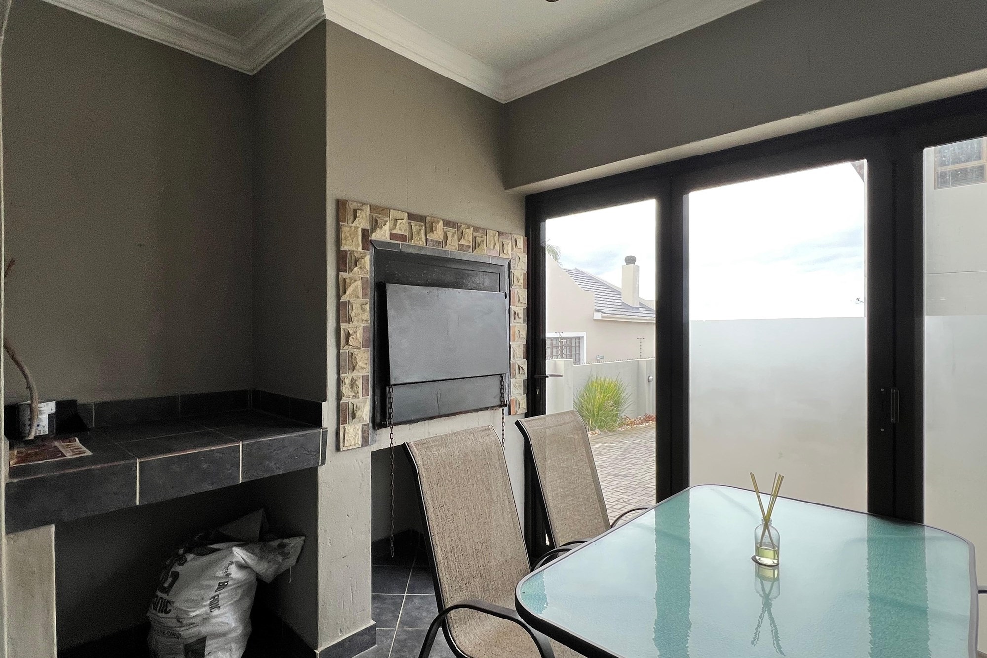 An indoor braai area is cleverly incorporated into the downstairs living space, allowing for year-round entertaining no matter the weather. The open-plan kitchen and lounge flow effortlessly together, creating a warm and inviting atmosphere for family time or social gatherings.