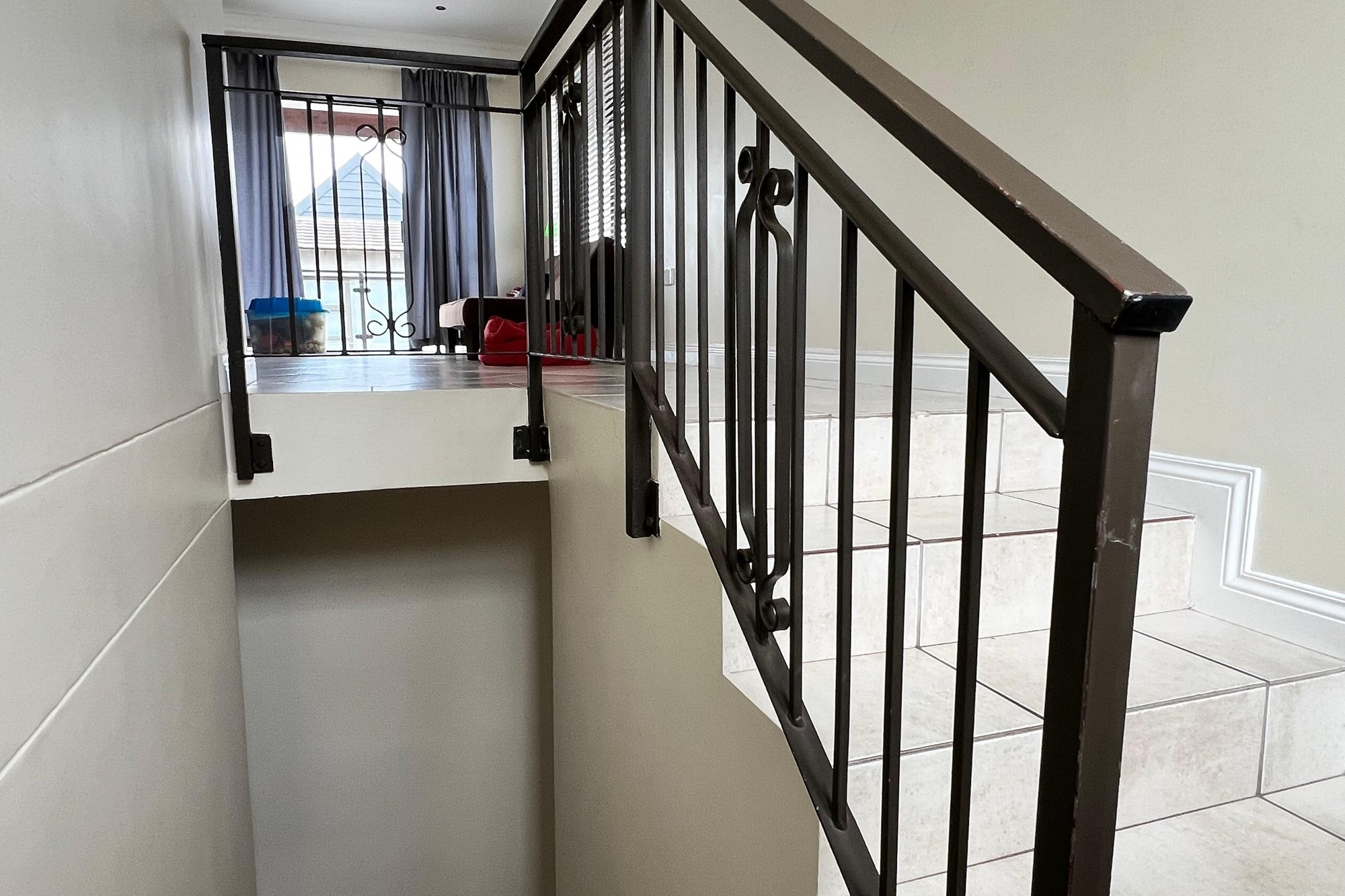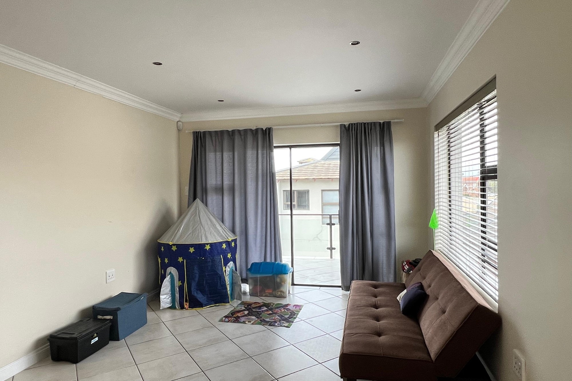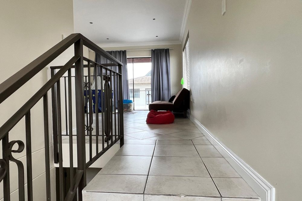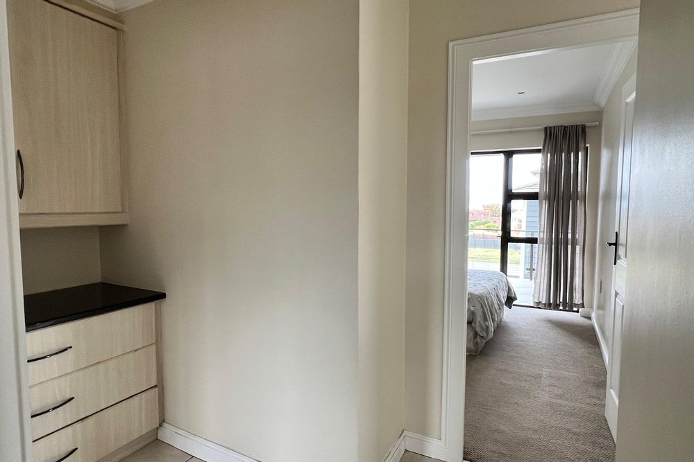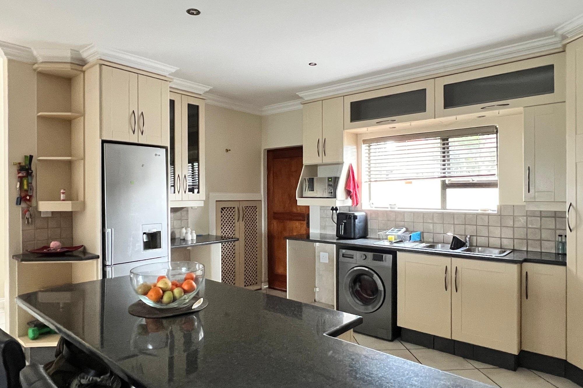 An indoor braai area is cleverly incorporated into the downstairs living space, allowing for year-round entertaining no matter the weather. The open-plan kitchen and lounge flow effortlessly together, creating a warm and inviting atmosphere for family time or social gatherings.