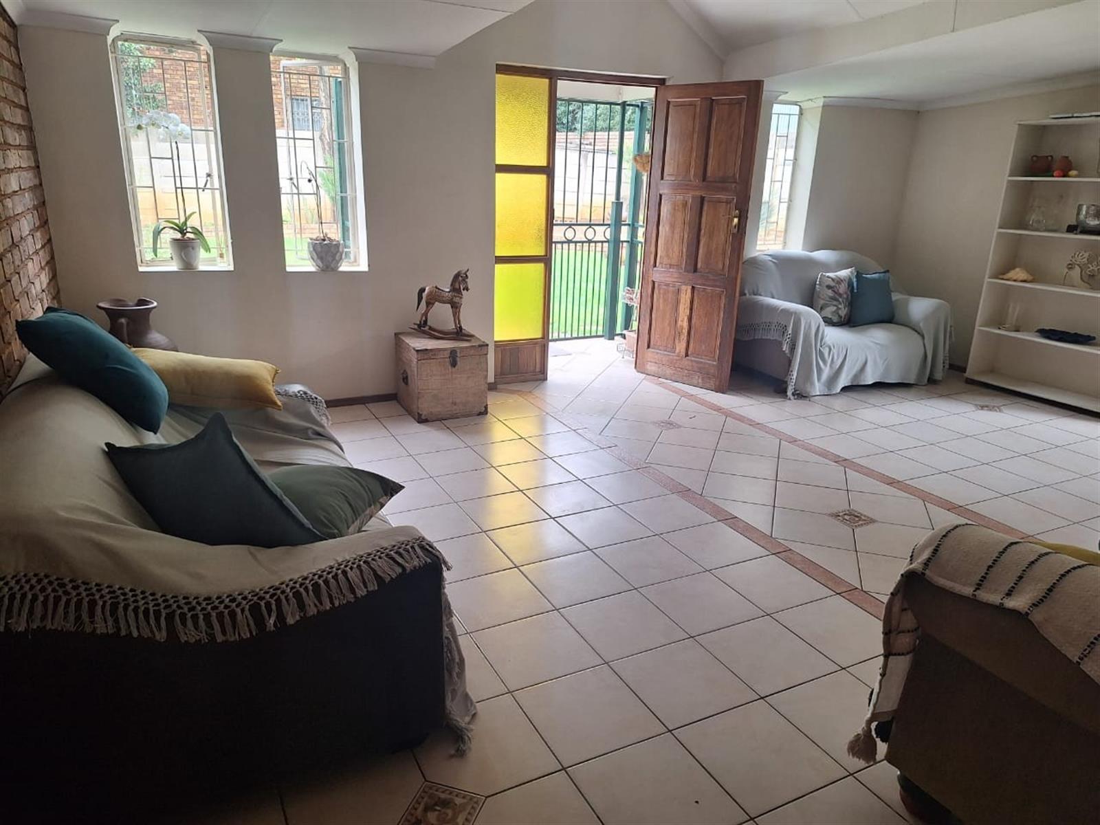 The living room is spacious with big doors leading to the garden.