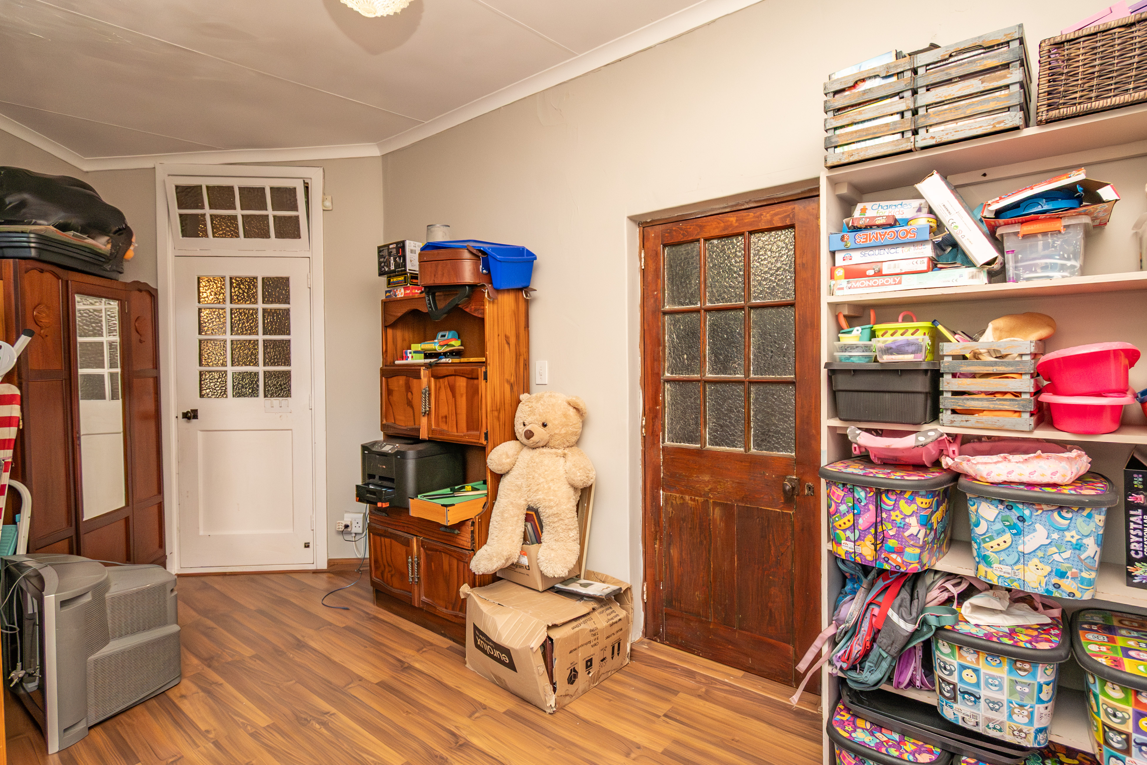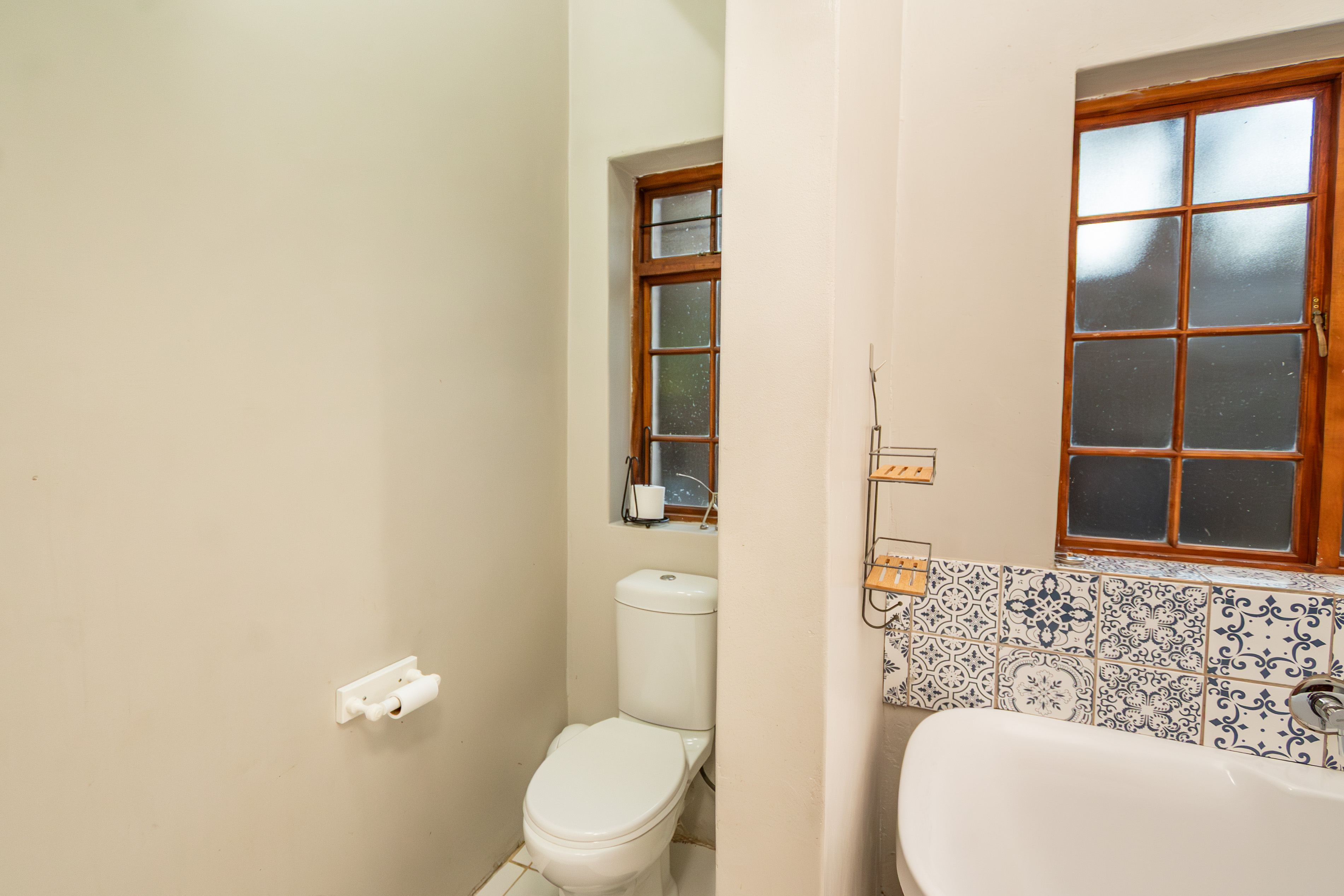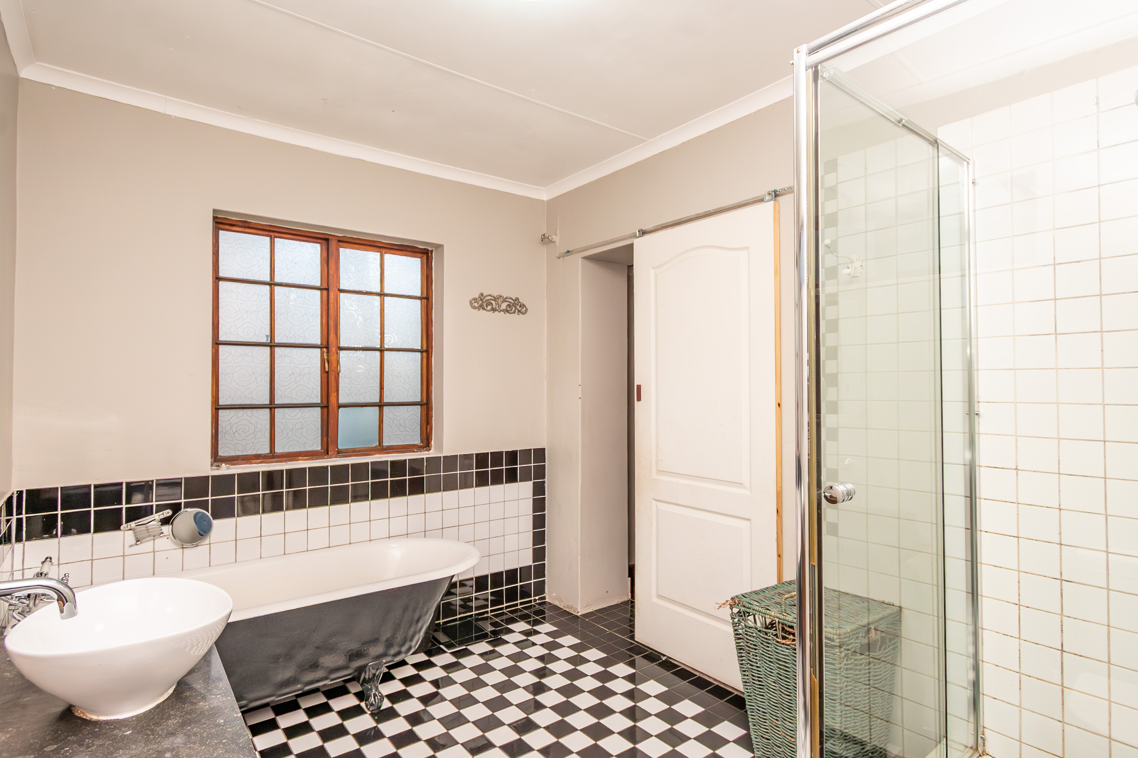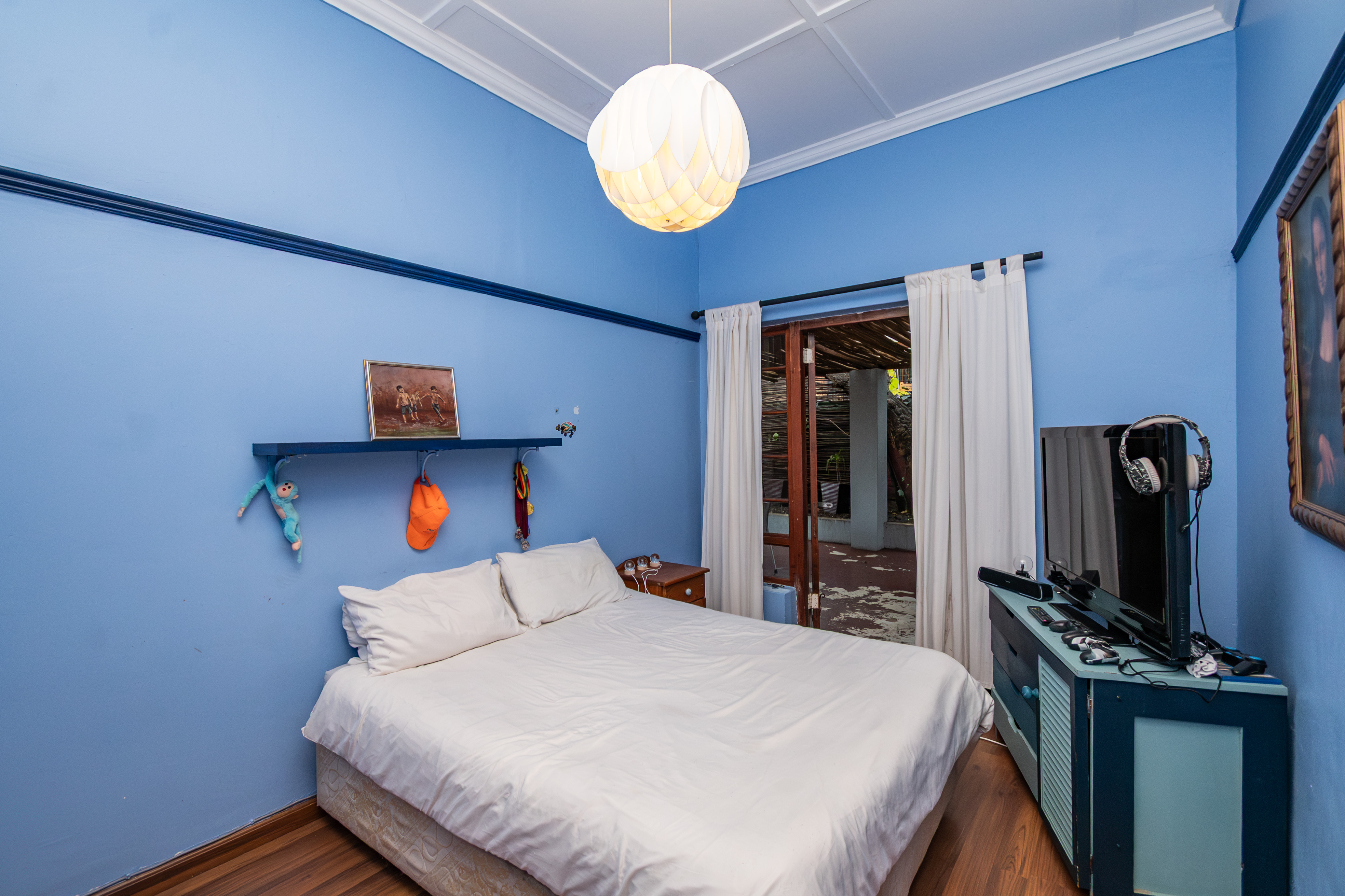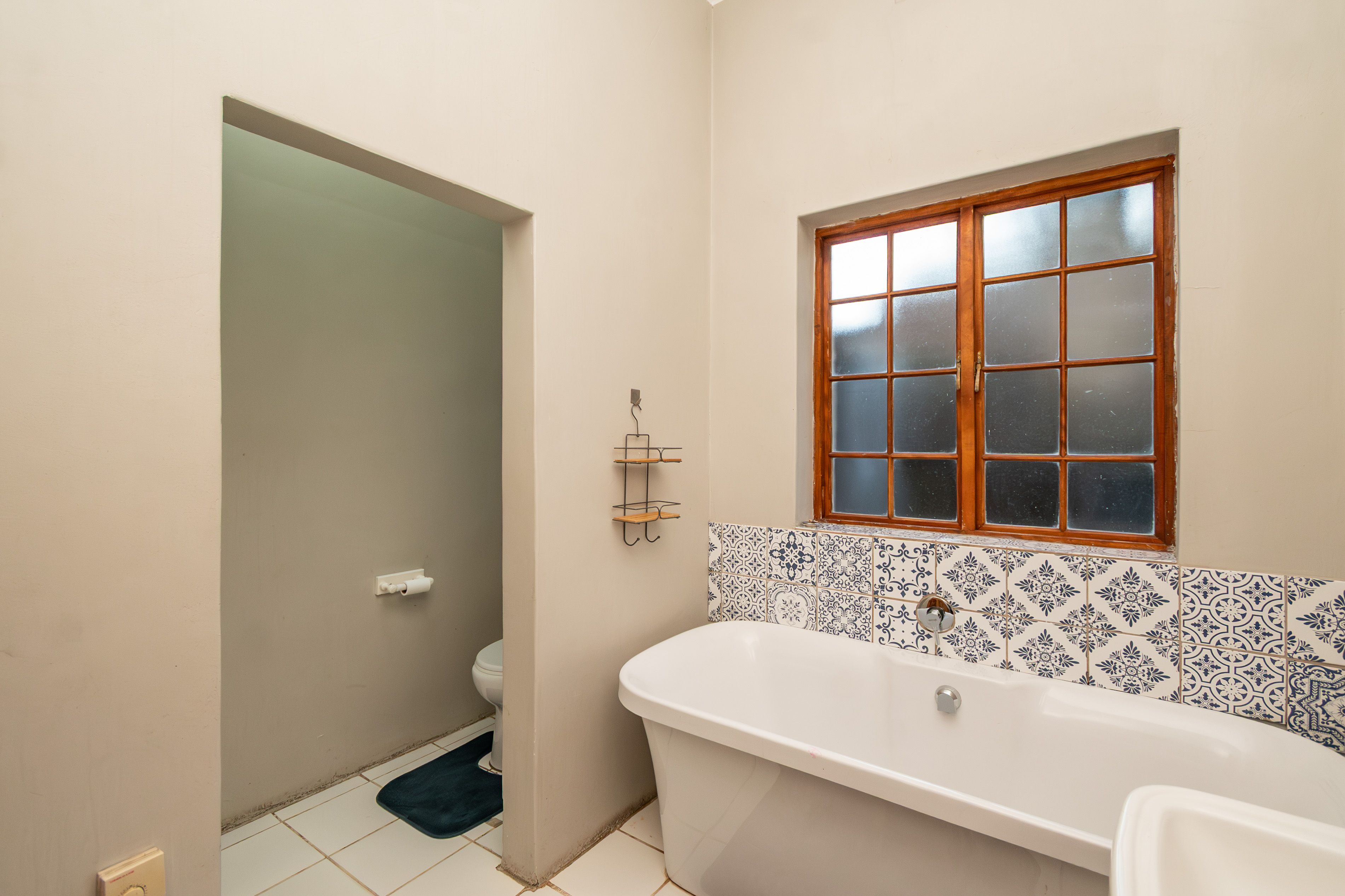 The home features three comfortable bedrooms. The main bedroom includes an en-suite bathroom, built-in cupboards, air-conditioning, a fireplace, and wooden flooring. The two additional bedrooms are fitted with built-in cupboards, underfloor heating, and laminated flooring, serviced by a second bathroom. Throughout the home, carefully selected feature tiles add charm and character.
