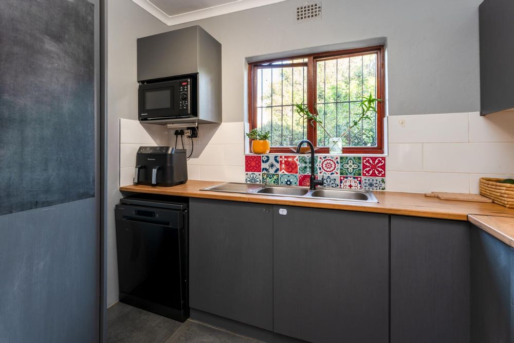 The kitchen is modern with ample space, 5-plate gas stove, plenty of cupboard space and plumbing for dishwasher and washing machine, double sinks.