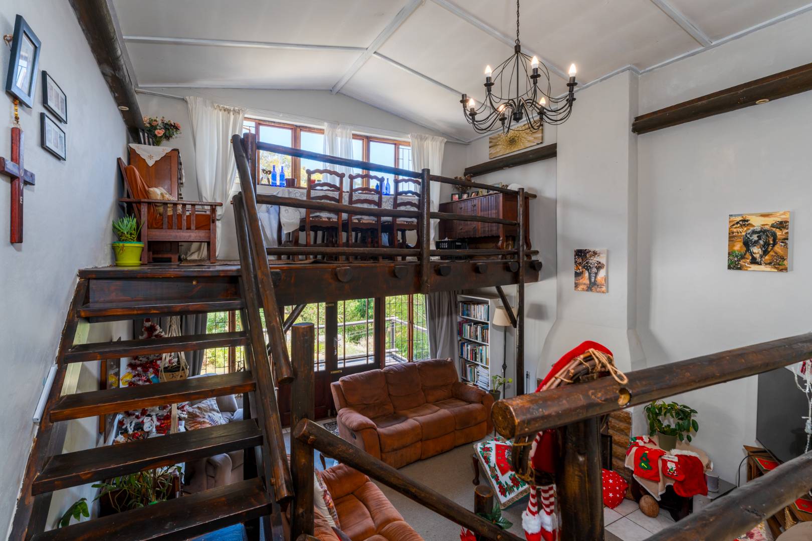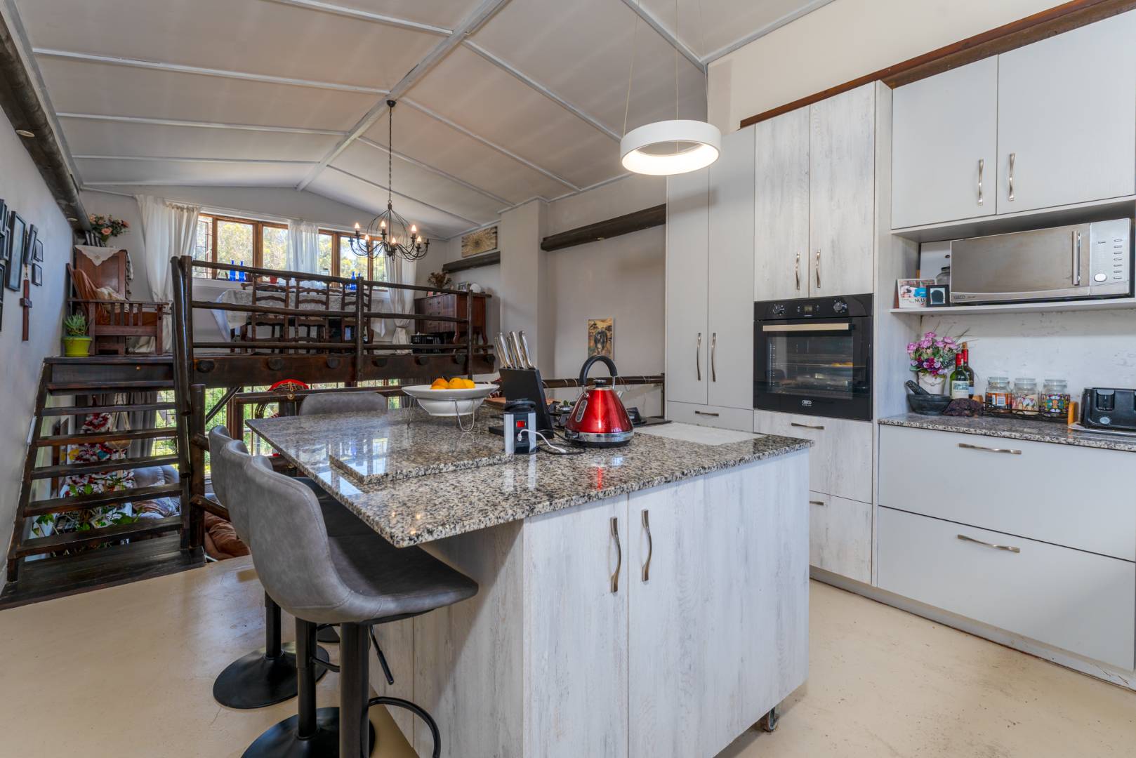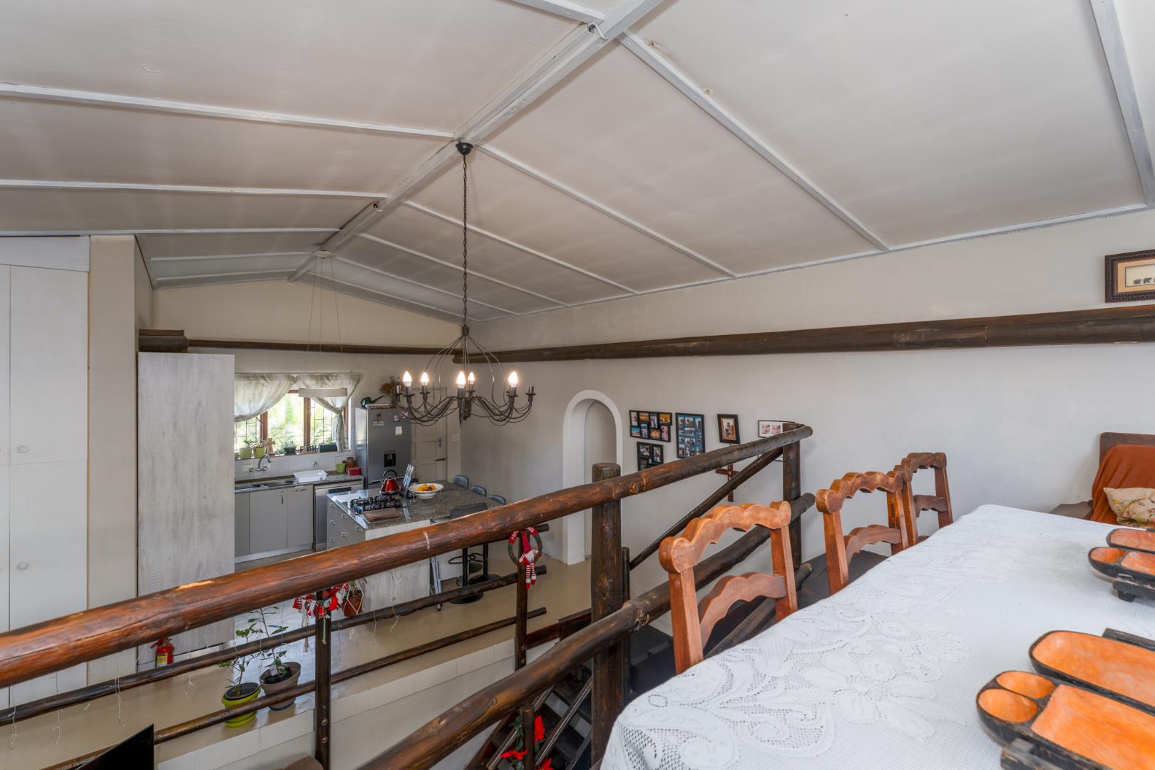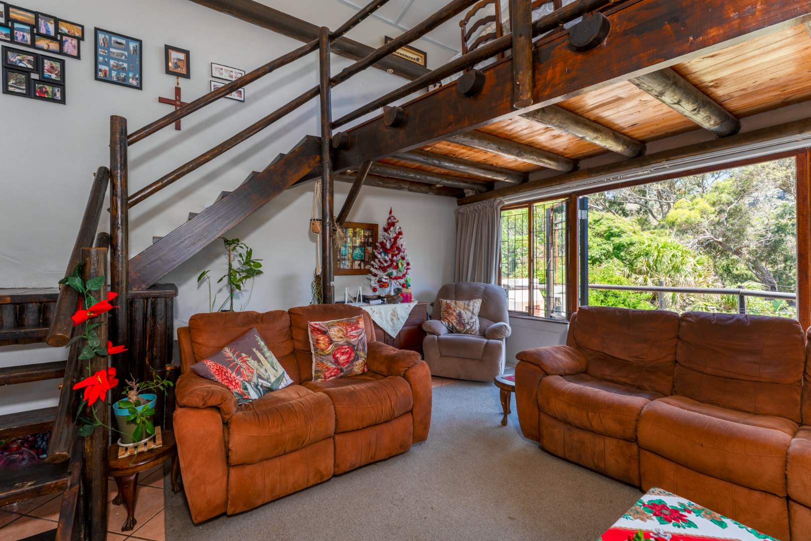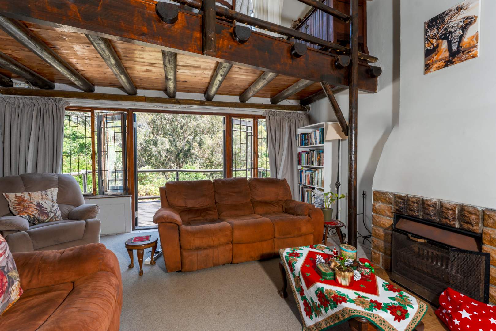The dining room features striking mezzanine wooden floors and leads to a wooden staircase descending into a tiled sunken lounge complete with a fireplace. From here, lovely French doors open onto a deck overlooking the garden, with uninterrupted views of the surrounding mountains and forest.