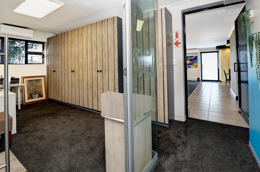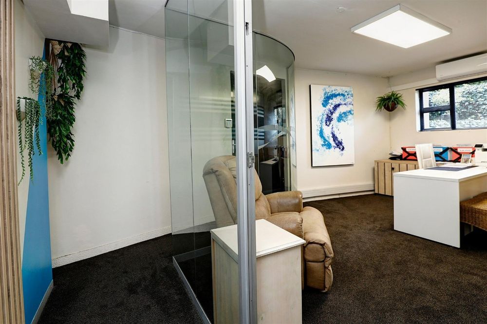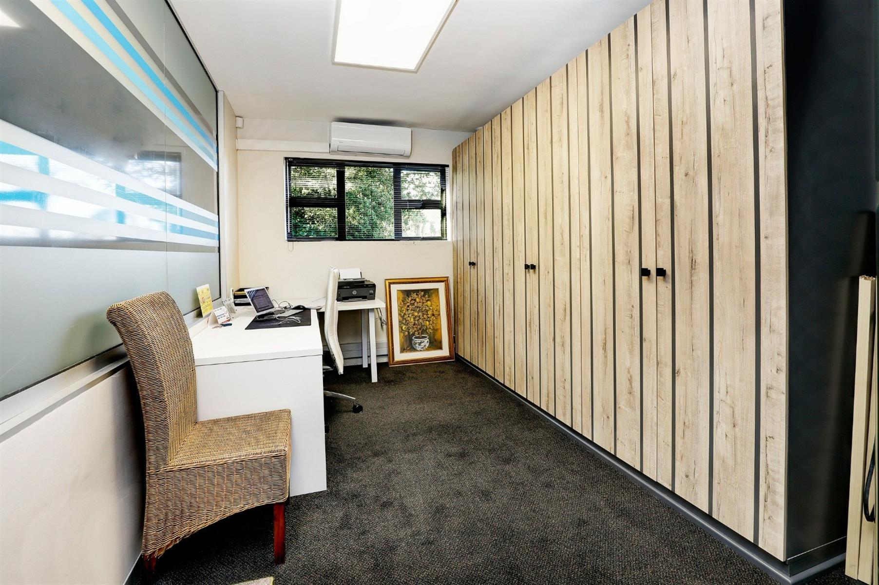 Currently used as office space, featuring a full kitchen, open-plan lounge, and balcony with stairs to the lower level.