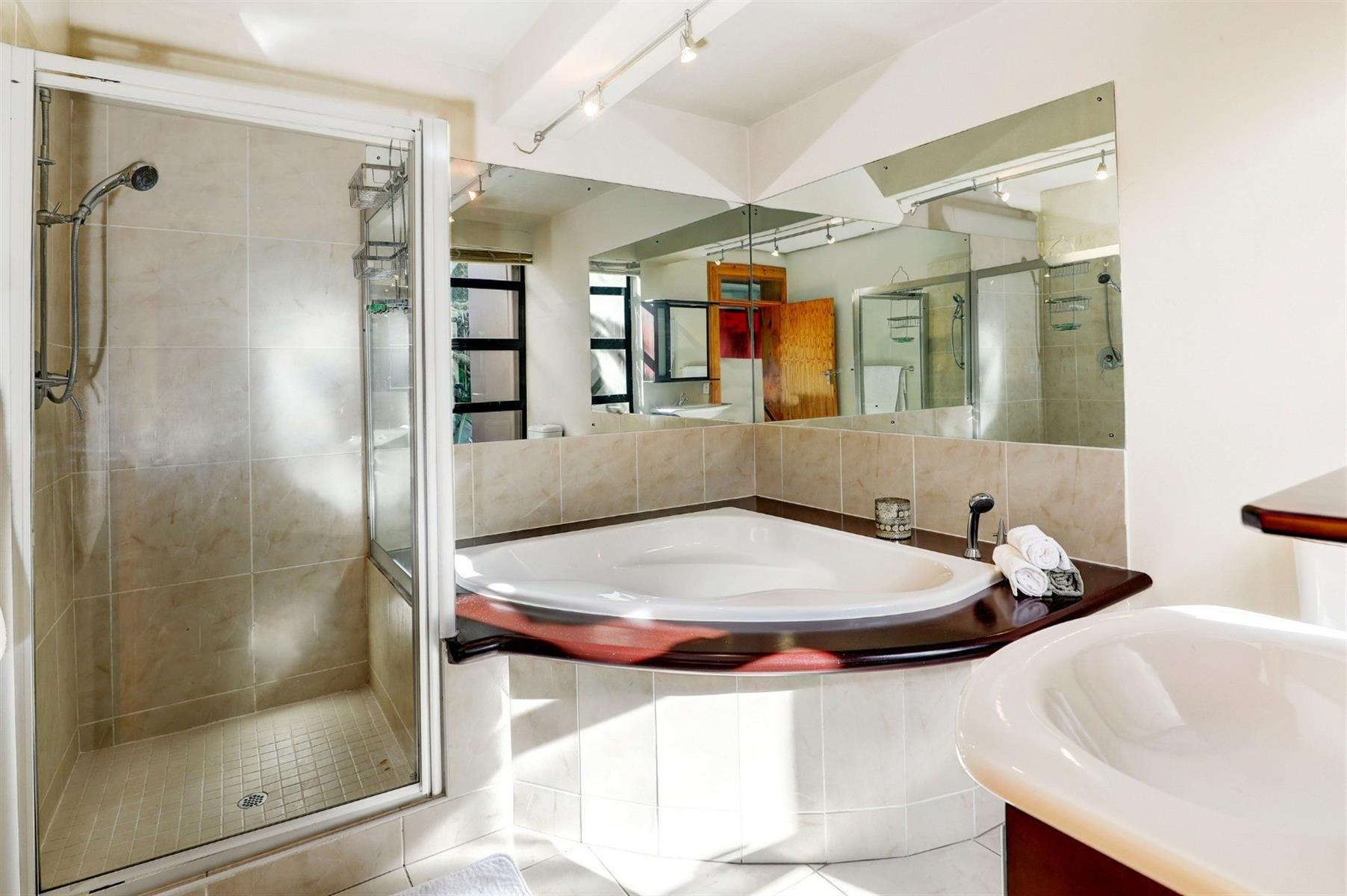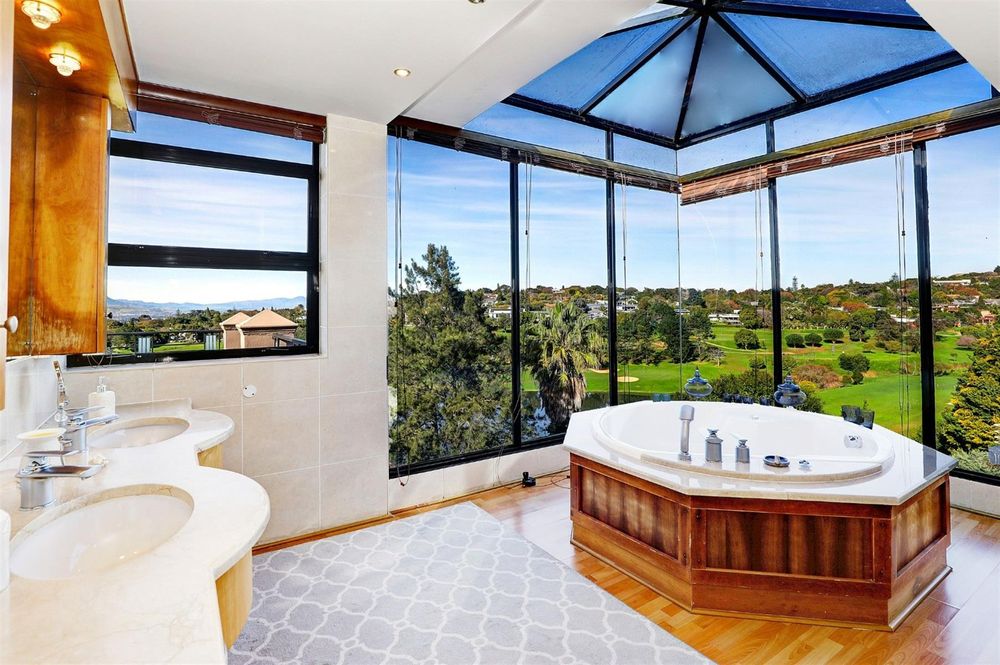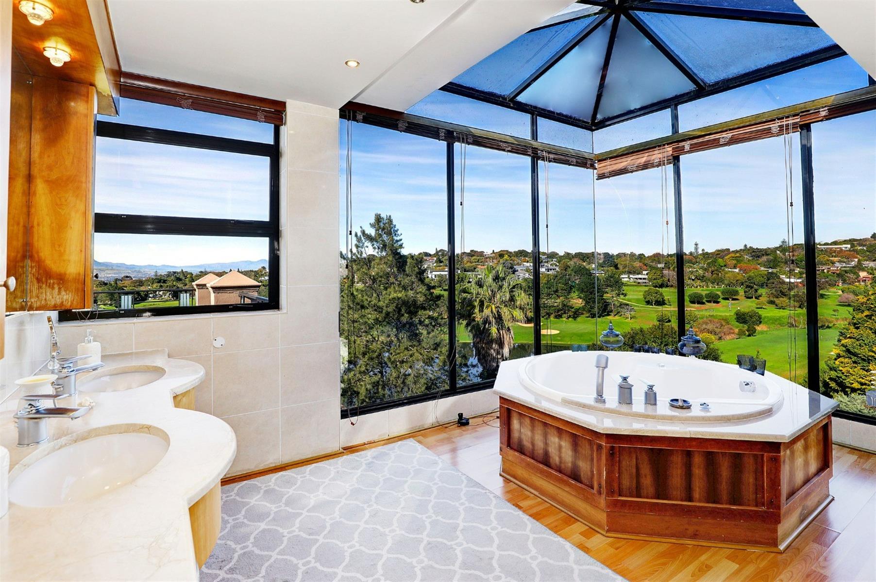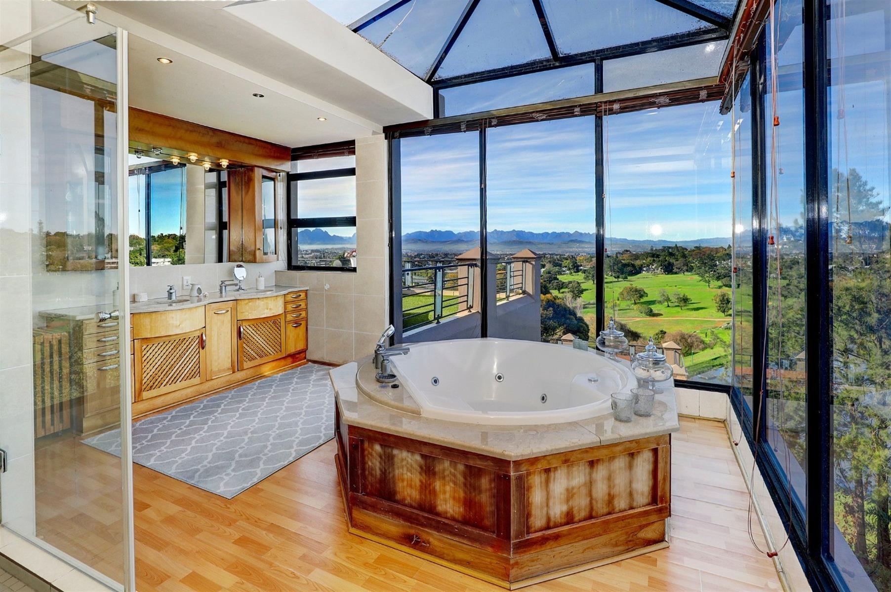 Luxury master suite – Jacuzzi with glass enclosure overlooking the Hottentots-Holland Mountains.
