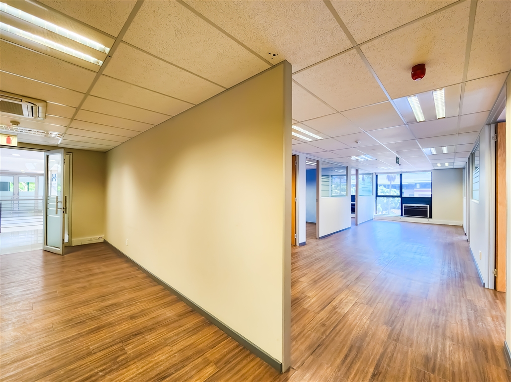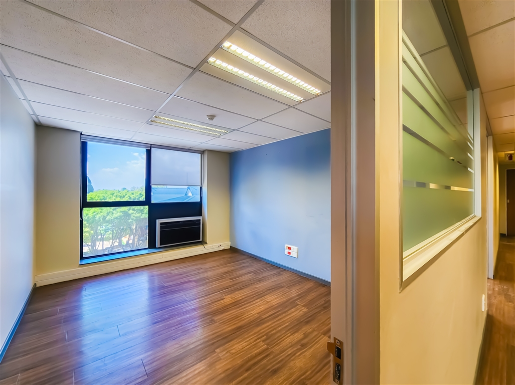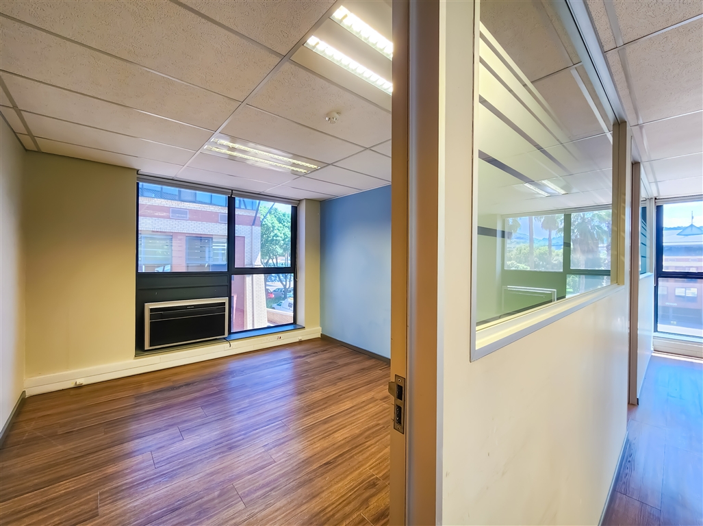 This modern, fully fitted office space available to let in Constantia Park is situated on the first floor of a well-maintained building. The office welcomes you with a spacious reception area, leading into a large boardroom that comfortably accommodates a 12-seater. The layout further comprises an open-plan workspace, five private offices, a private dedicated kitchen, and a storeroom/server room. The office is finished with vinyl flooring throughout and is fully air-conditioned, ensuring a comfortable working environment.