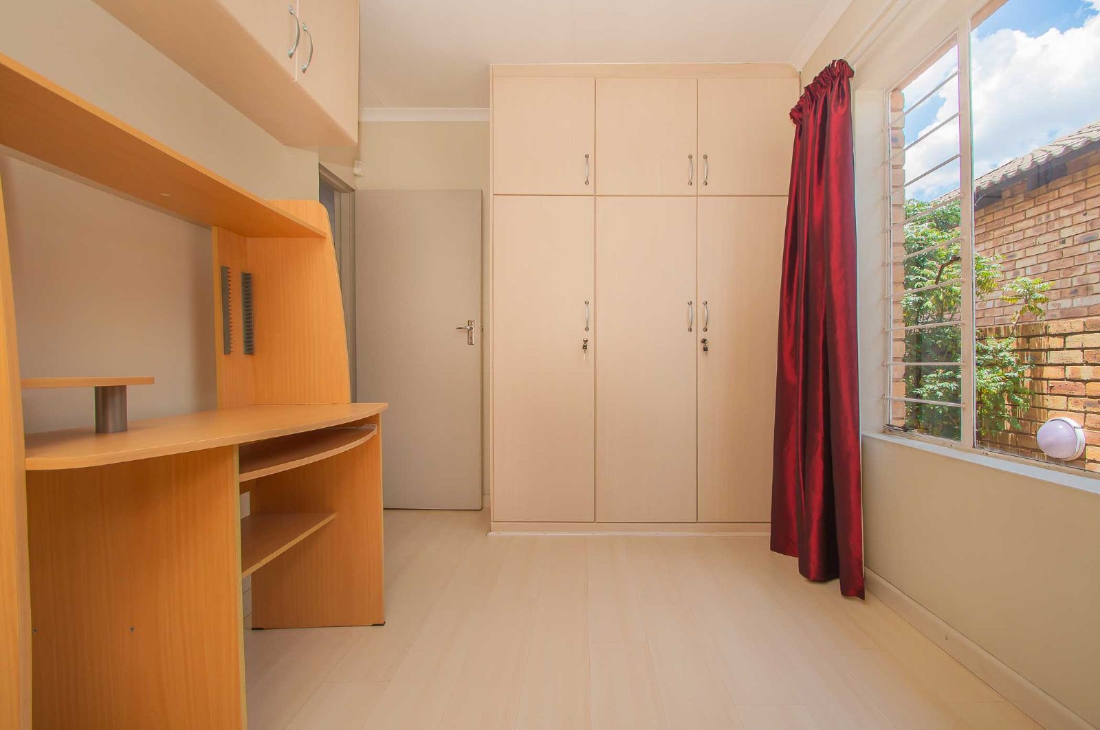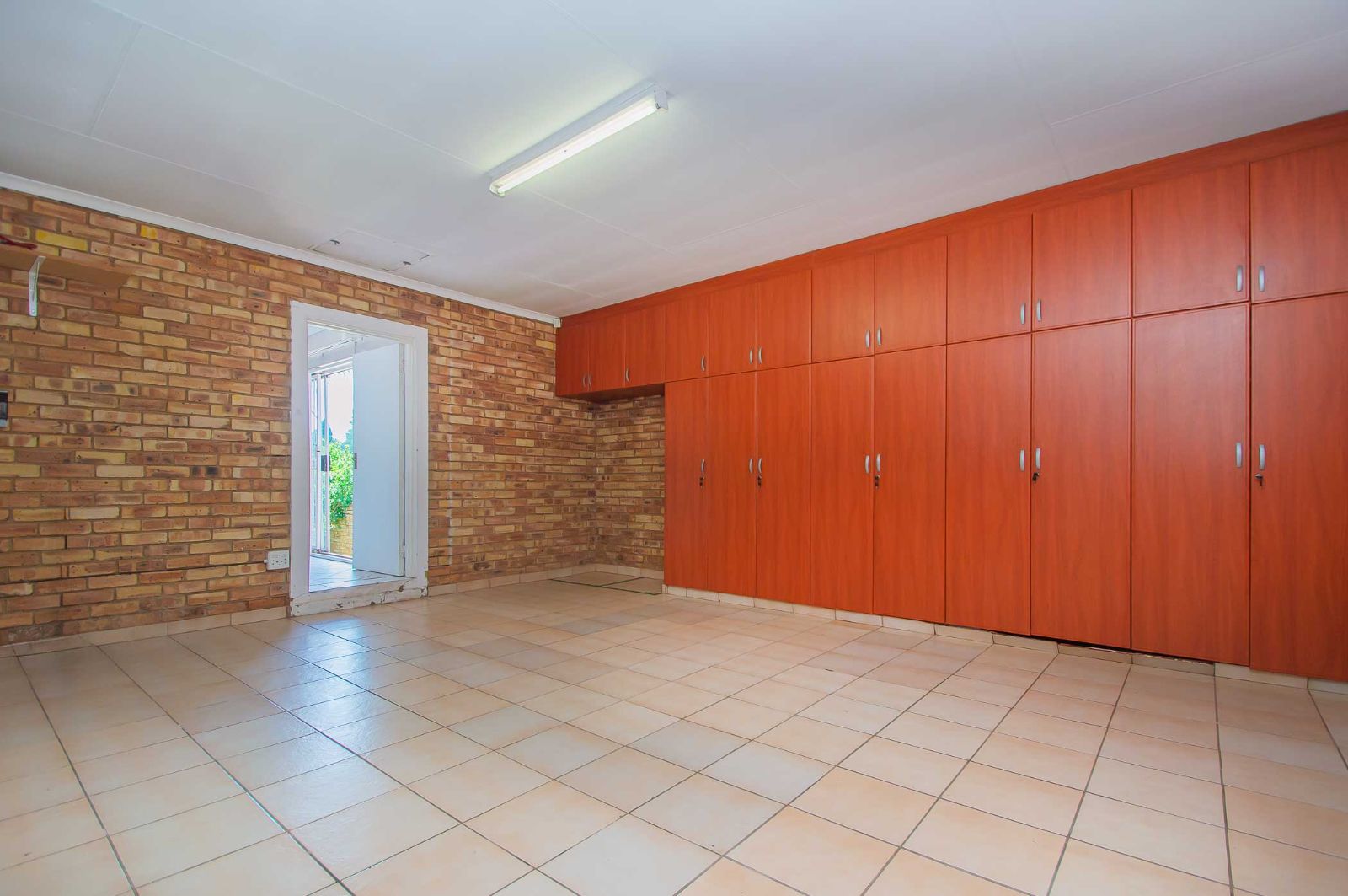 A double garage leads directly into the house and is fitted with extensive built-in cupboards, offering excellent additional storage