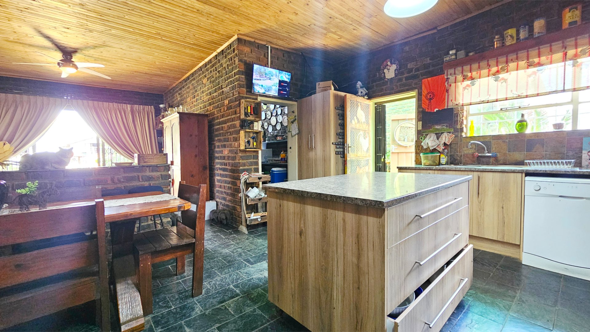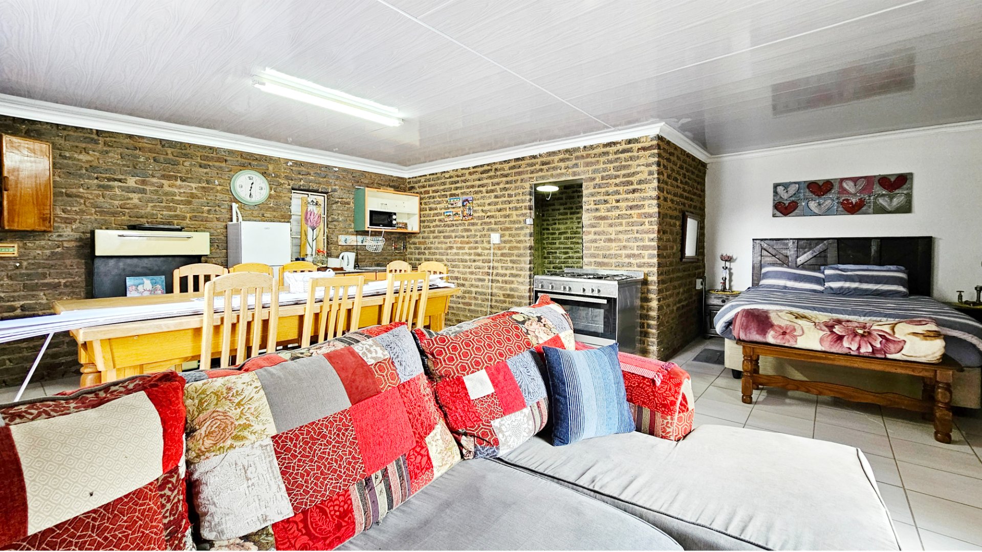 Adjacent to the main house is a flatlet that features an open-plan layout, including a bathroom and kitchen area, and a bedroom. This additional living space is versatile and can be used as a guest house, office, or rental unit.