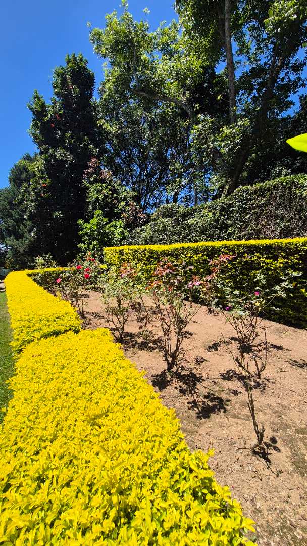 From here, a few steps more and you are through to a large dining room, which has a door opening near a hedged rose garden at the back of the house.