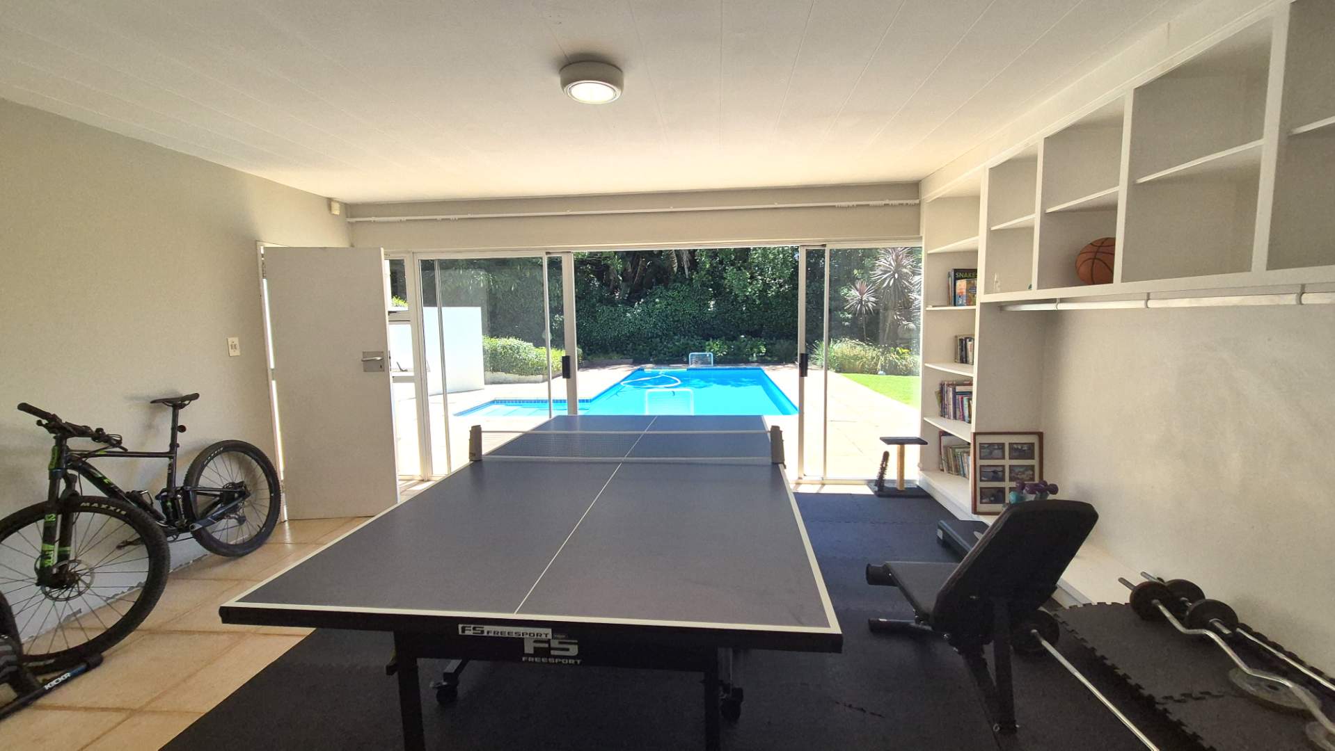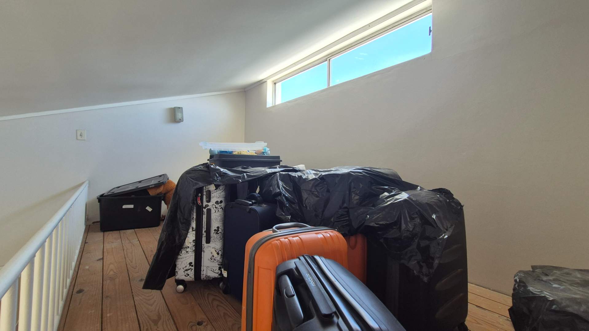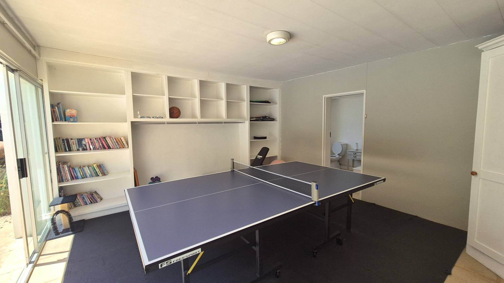 Leading off from the landing area, a staircase takes you down to two versatile rooms. The first is a well-sized bedroom with built-in cupboards, perfect as a guest room or home office. The second is a spacious multipurpose room, featuring wall-to-wall shelving, a corner cupboard, and an ensuite bathroom with an open shower. With sliding doors opening onto the pool area, this could serve as a guest suite, entertainment room, or games room—the choice is yours.