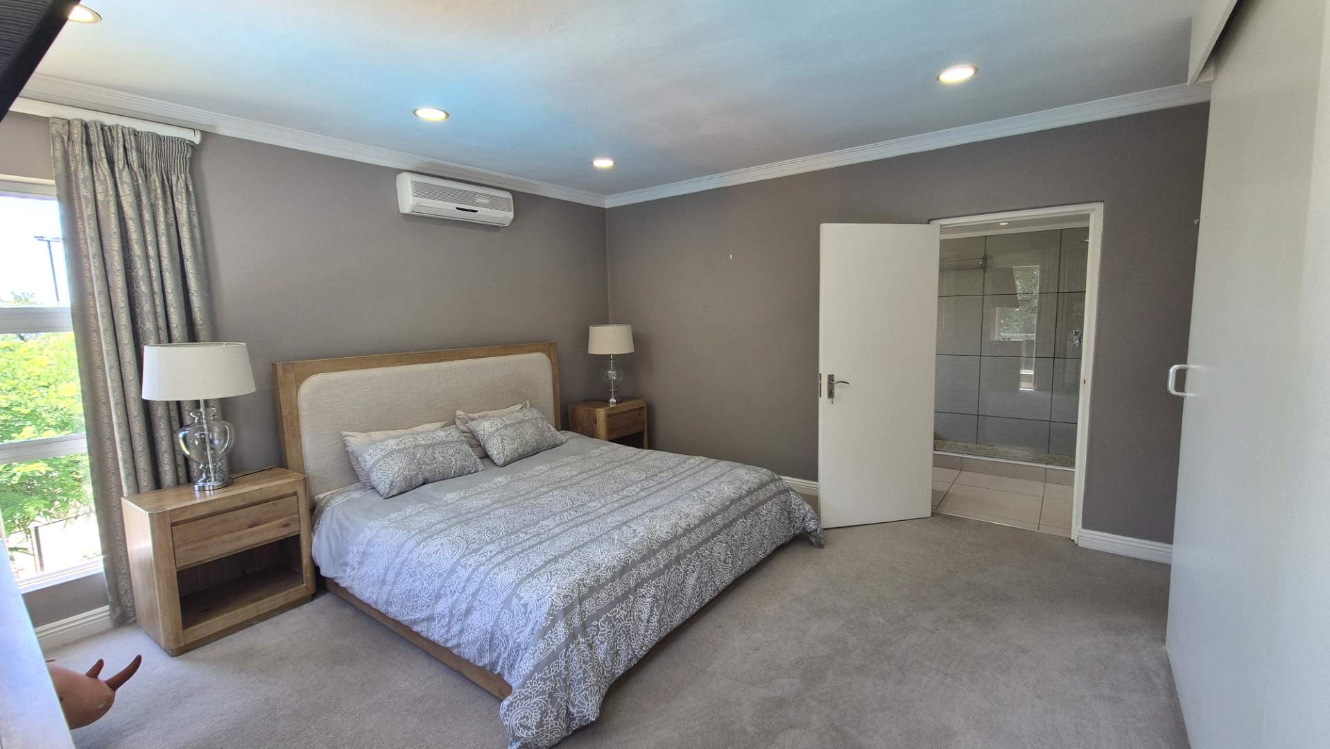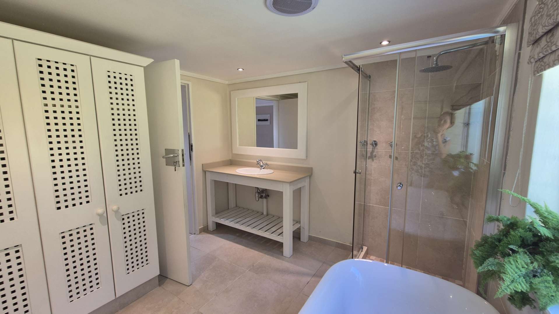 The main bedroom is a true retreat—generously proportioned, fully carpeted, and equipped with air conditioning, sliding-door wardrobes, and a luxurious ensuite bathroom. This ensuite is designed for indulgence, boasting an extra-length shower, freestanding bath, vanity basin, toilet, and a stylish dressing table with drawers and a large mirror.