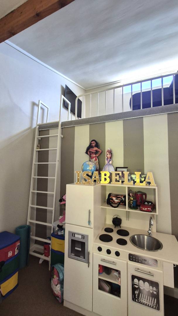On the other side of the landing, you'll find the main bedrooms. The first is a cozy, carpeted room with built-in cupboards and a vanity desk, offering a special touch with a fitted ladder leading up to a charming loft or play area. Next door, the spacious family bathroom features a freestanding bath, shower, toilet, and vanity basin, useful for all. The second bedroom is also fully carpeted with built-in cupboards, while a unique feature awaits just before the third bedroom—a fitted ladder leading up to a deck, perfect for extra storage or a creative space. The third bedroom is equally inviting, with built-in cupboards, a ceiling fan, and soft carpeting underfoot.