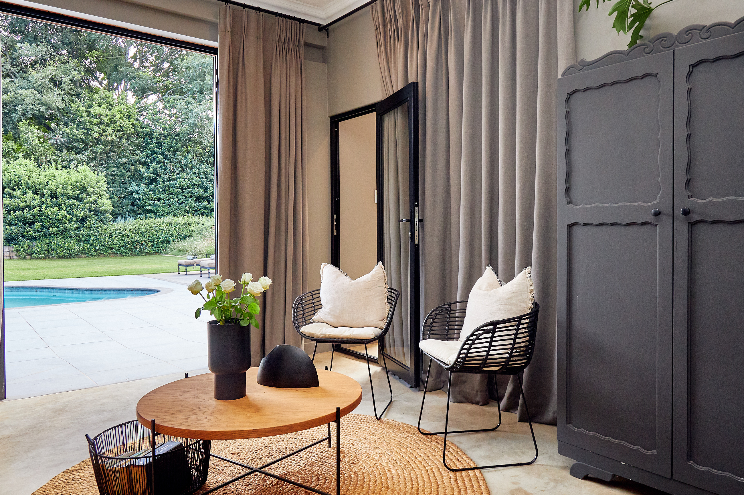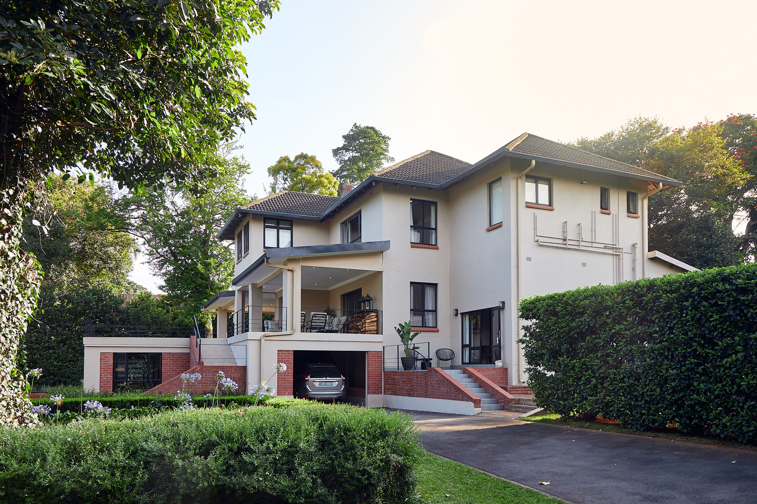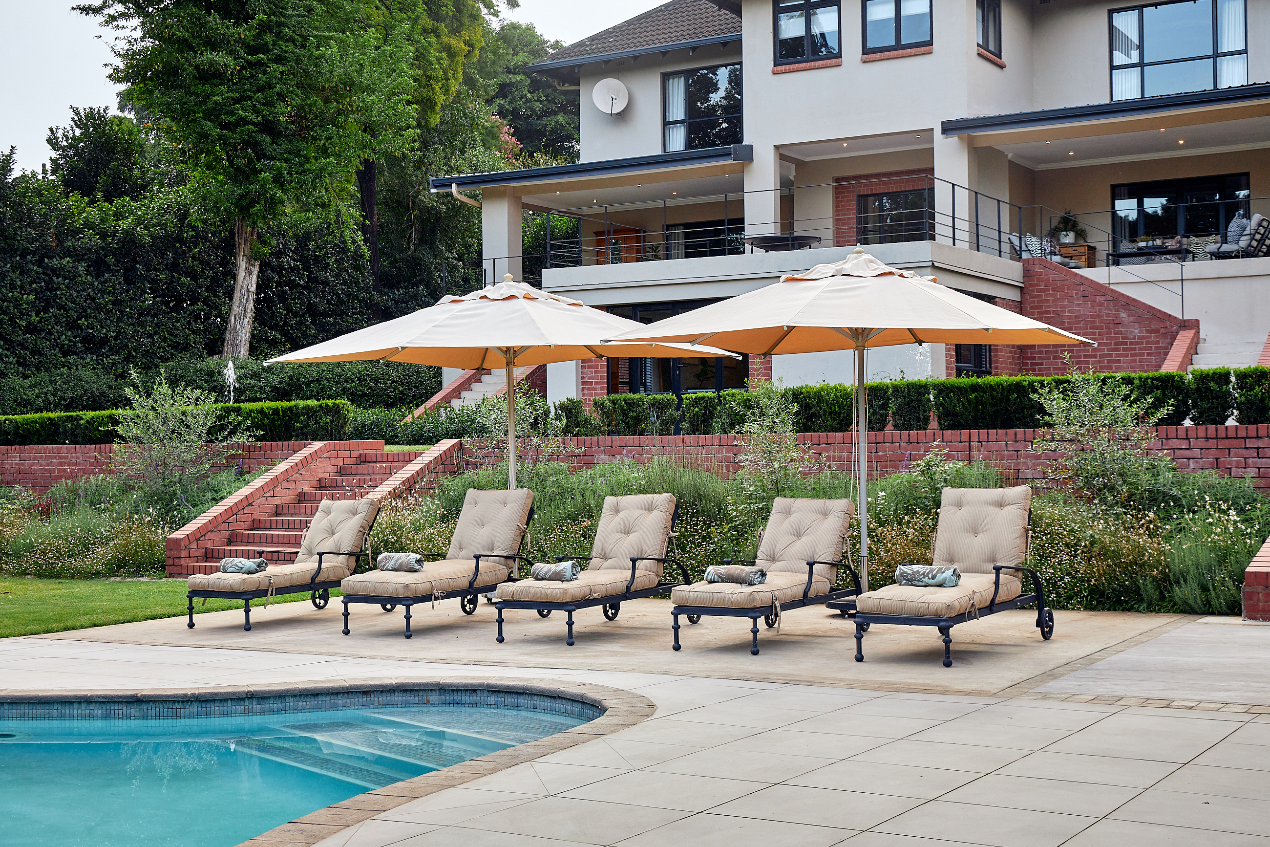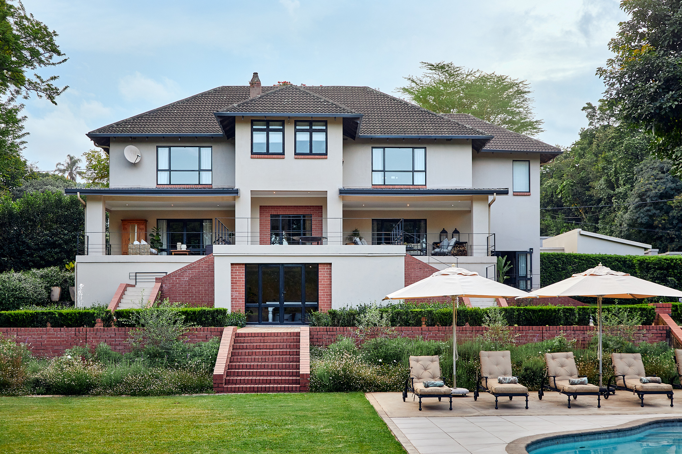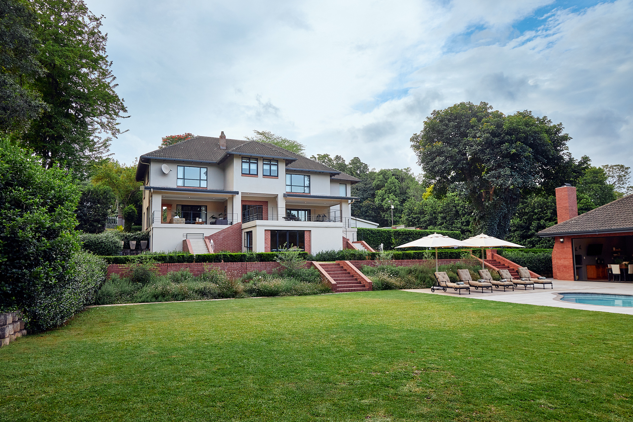 As you drive through the grand gates, you are welcomed by a beautifully landscaped garden, complemented by striking red brick and plastered walls. Before ascending to the expansive covered veranda, take in the breath-taking manicured garden, complete with a sparkling pool, a spacious pool house with a guest suite, and an entertainment area—perfect for enjoyment by all ages. At the top of the stairs, you’ll discover two outdoor sitting areas that overlook the exquisite garden. Three sets of doors provide access to the interior of the home.
