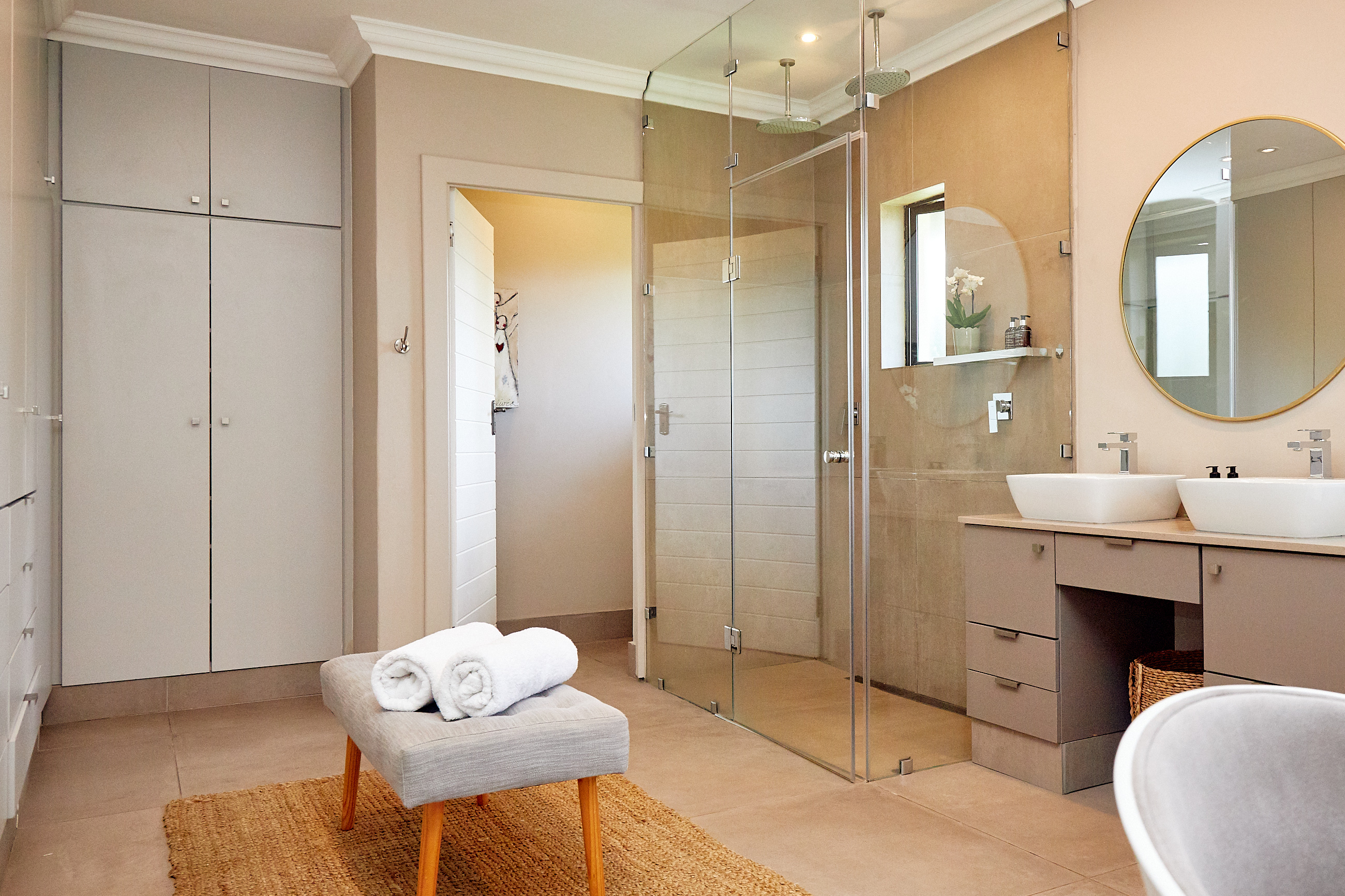 As you ascend the easy staircase, you’ll find four spacious bedrooms, all equipped with air conditioning, built-in cupboards, and wooden flooring. A separate toilet and a large family bathroom with an impressively sized shower add to the convenience. A fitted study, overlooking the magnificent garden, invites productivity, while the main bedroom offers breathtaking views. The luxurious dressing room features a lavish bath, a refreshing shower, an exquisite dressing area, and makeup station.