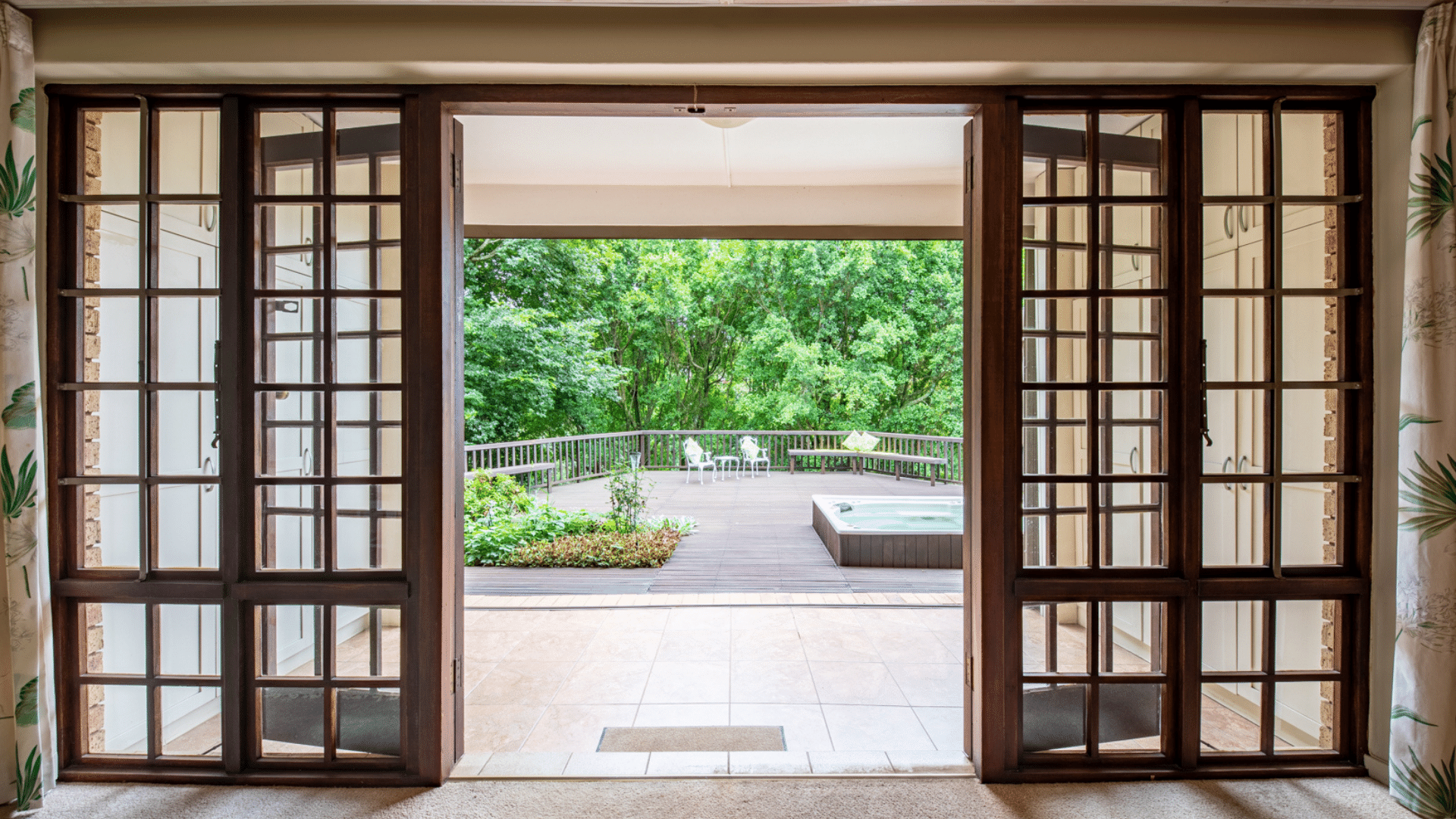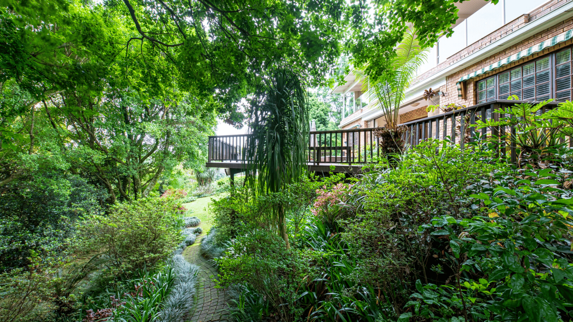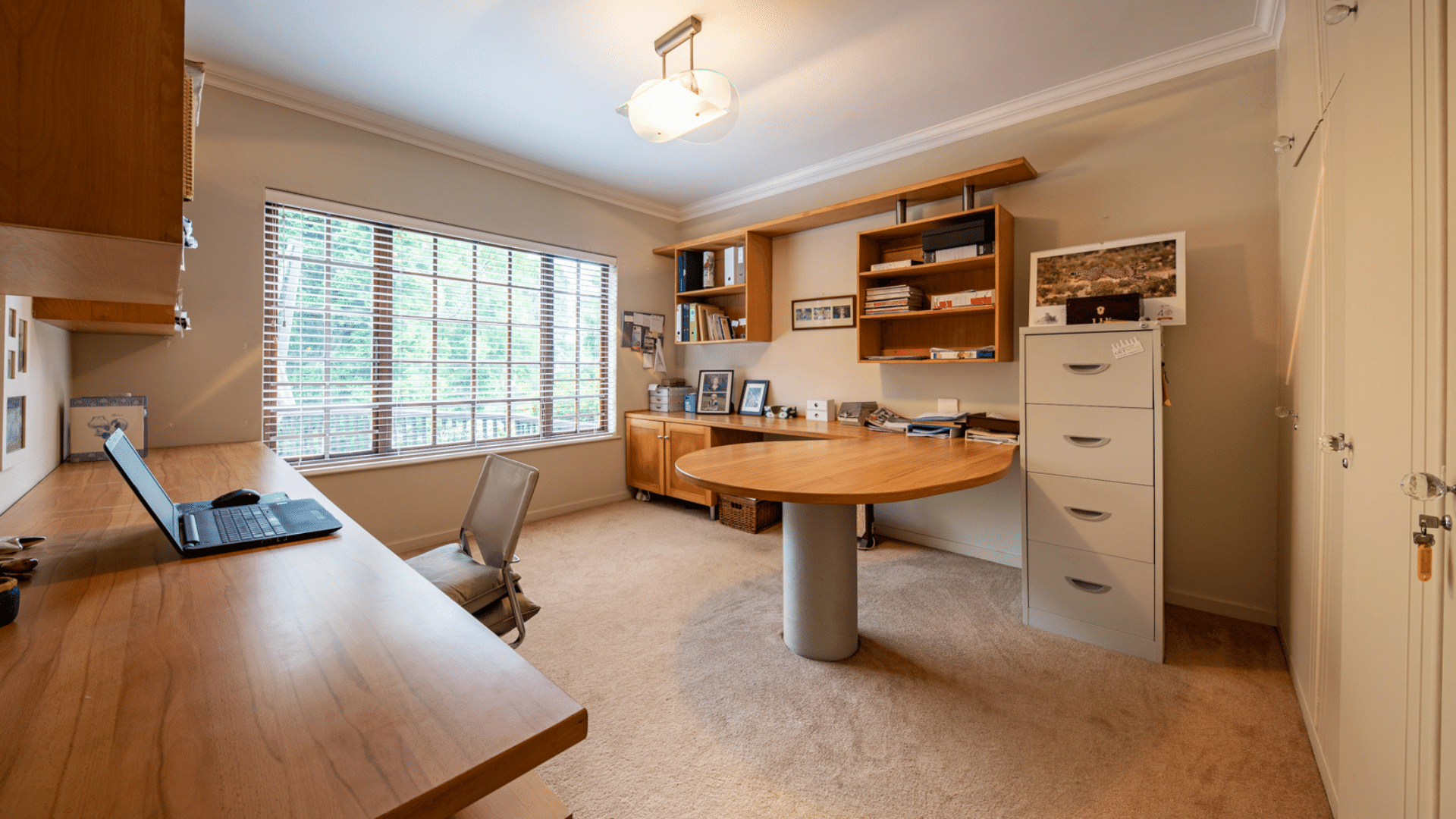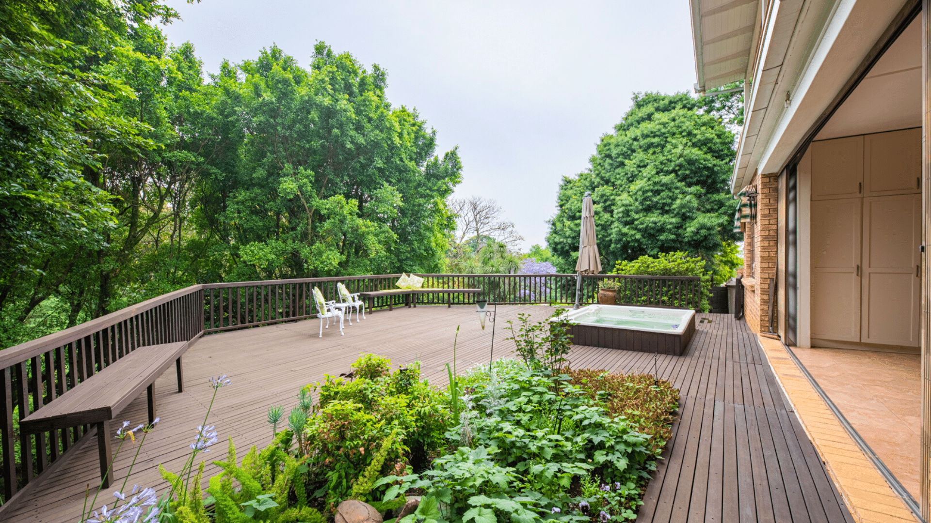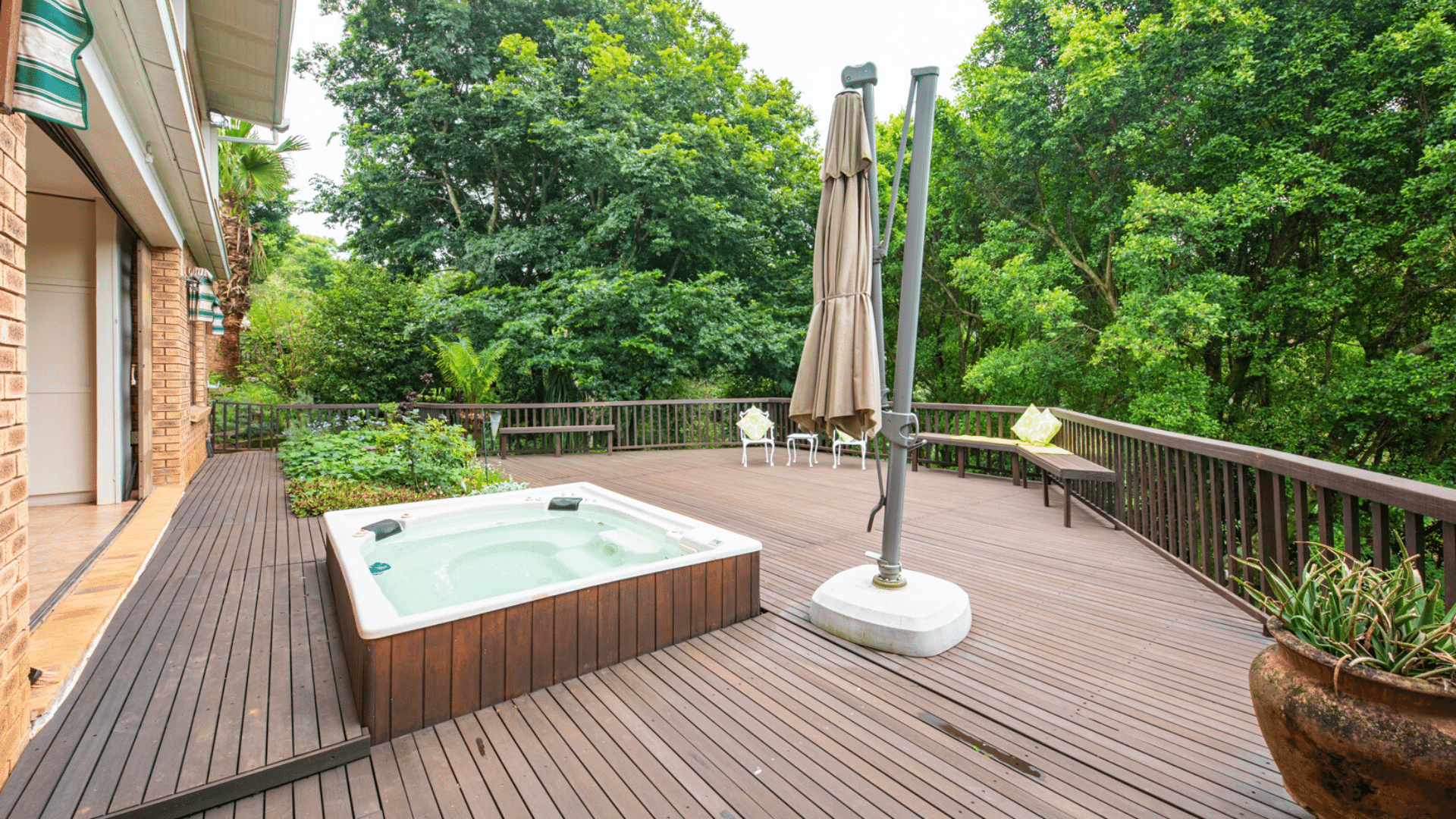 The lower level provides added living flexibility, including a large second lounge and two spacious bedrooms—one currently used as a study. French doors open to an expansive deck complete with a jacuzzi, all set against a backdrop of established trees and serene garden views. This level is ideal for multi-generational living, guests, or home office use. Additionally, there is a fourth bedroom and bathroom with separate access through the garage area.