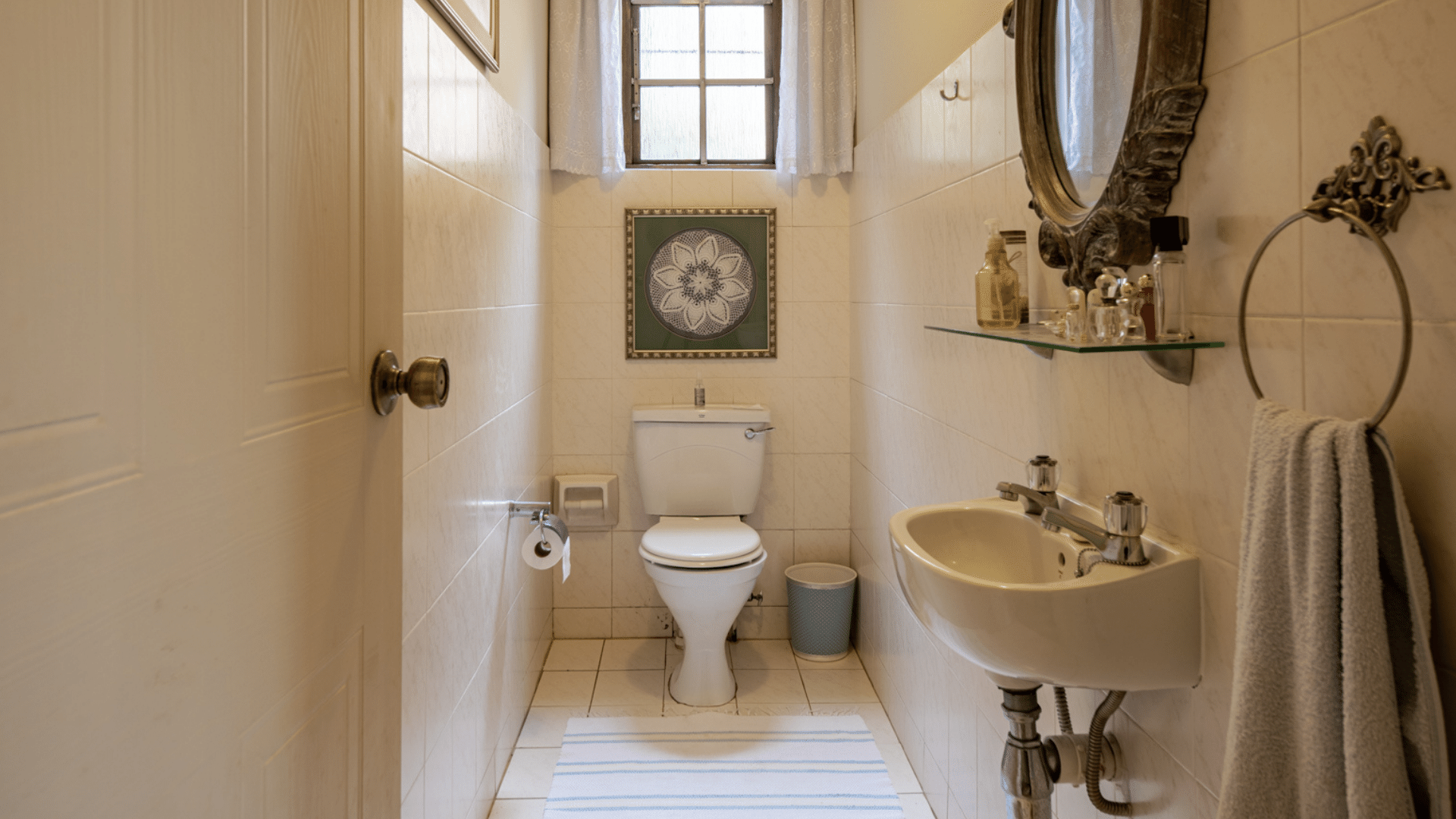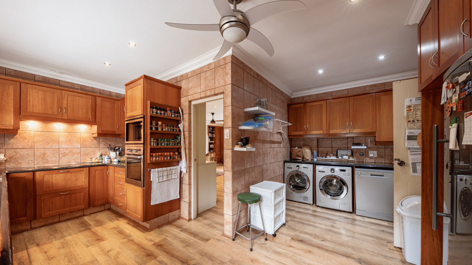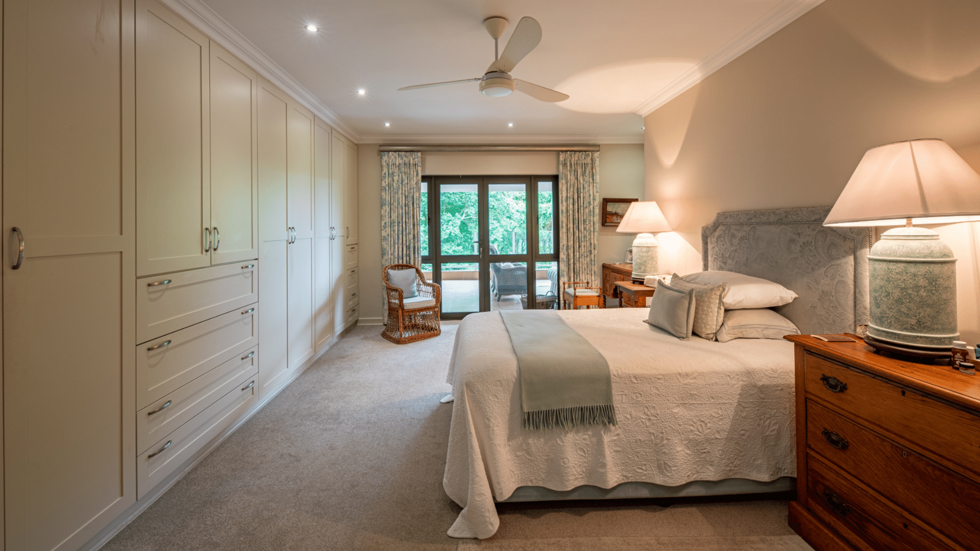 The main bedroom is a peaceful retreat with tranquil treetop views, wall-to-wall built-in cupboards, air-conditioning as well as a ceiling fan, and a luxurious en-suite featuring a bath, shower, basin, and toilet. You will find a separate guest toilet is also located on the first floor.