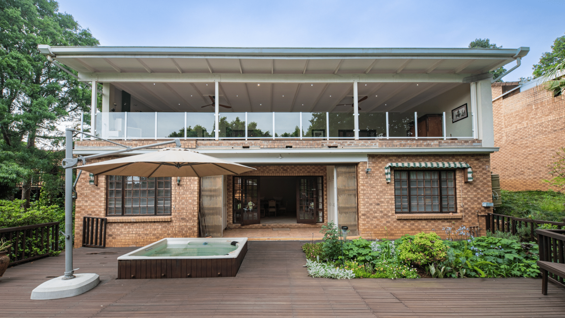 The upper level is dedicated to easy living and elegant entertaining, featuring an expansive open-plan layout. The entrance hall leads into a dining area that seamlessly flows into the TV lounge. From here, you’re welcomed onto a spacious balcony that overlooks a lush greenbelt of treetops. With two inviting seating areas that catch the morning sun and afternoon glow, the balcony is both a serene retreat and an entertainer’s delight. A built-in braai, prep counter, and basin complete this ideal outdoor space.