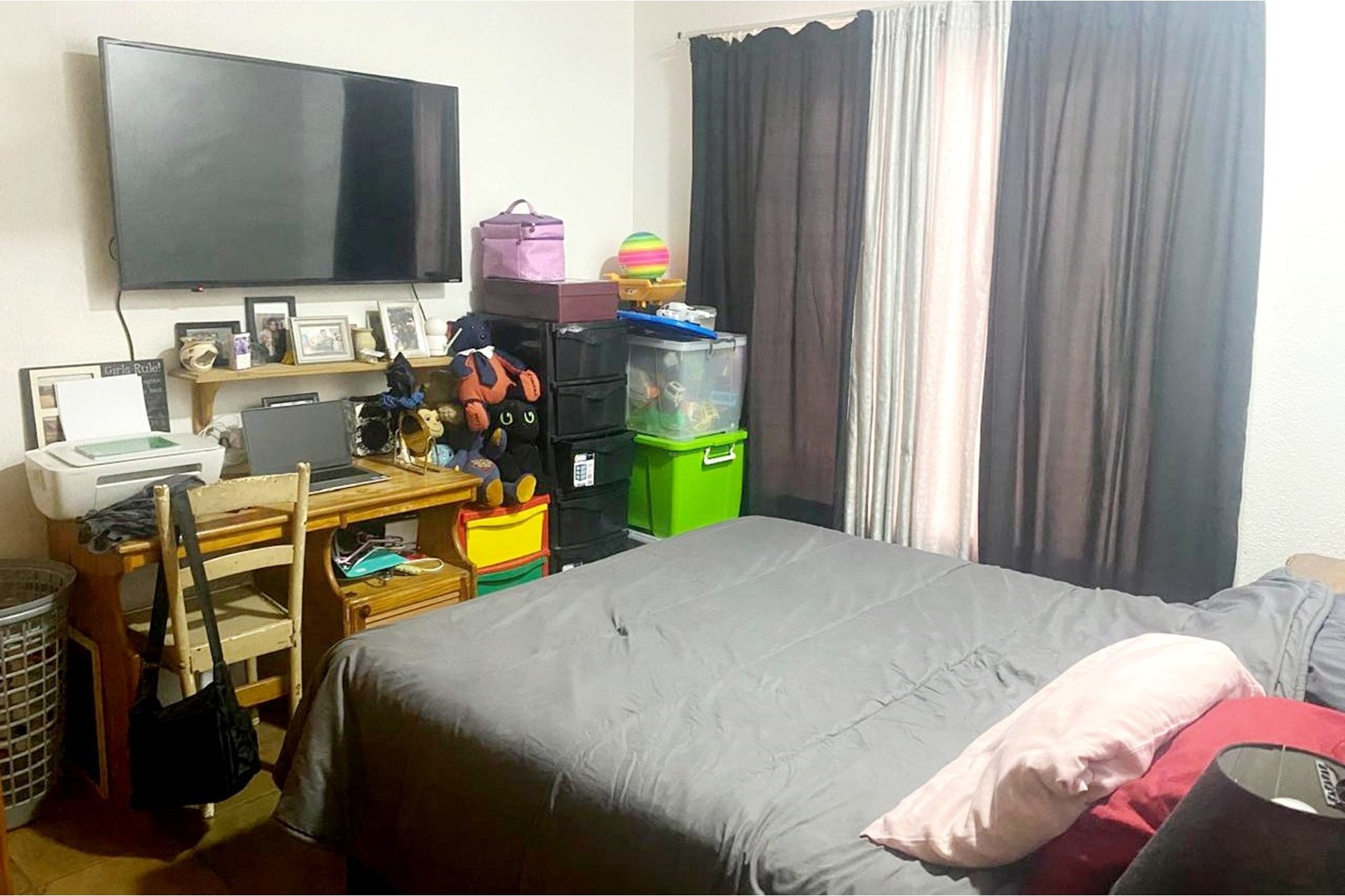 Bedroom 1 has large window, built-in cupboards, aircon.