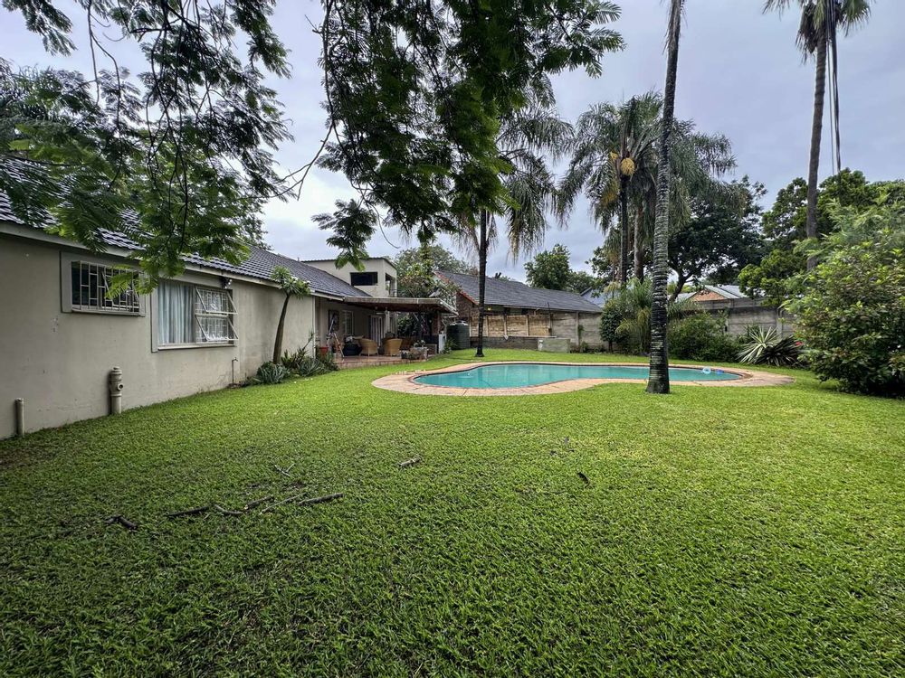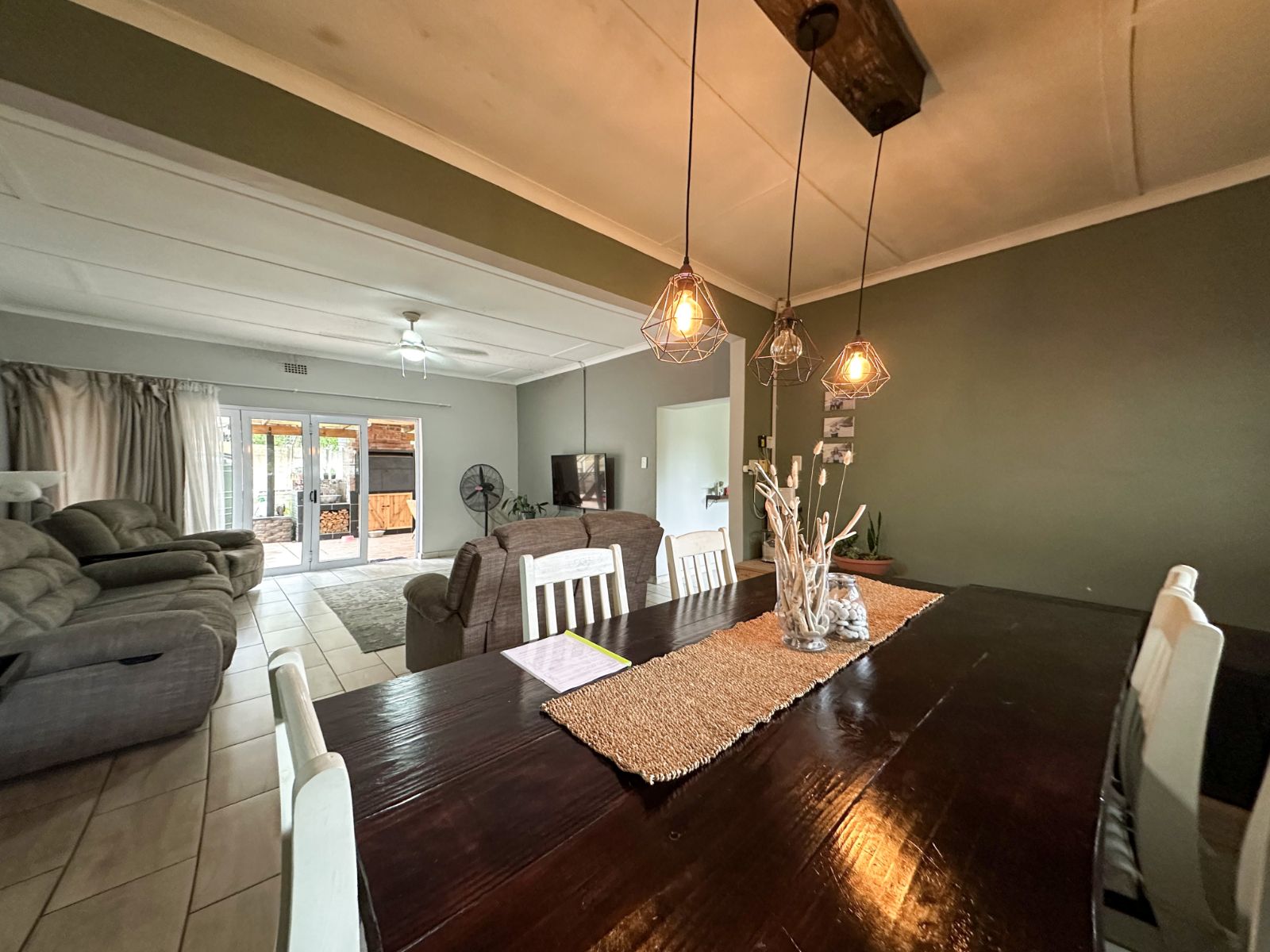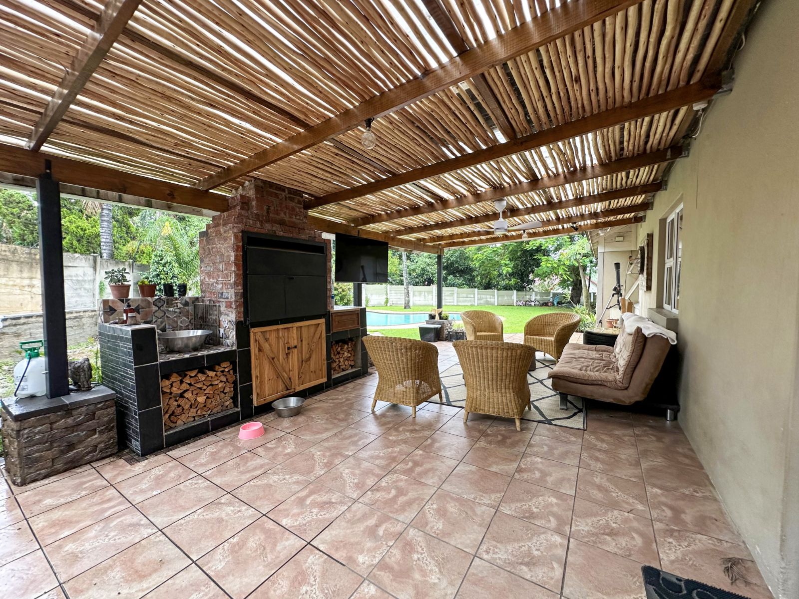The home boasts a generous open-plan living and dining area, seamlessly flowing through stack doors onto a covered patio with a built-in braai, creating an inviting space for entertaining while overlooking the well-maintained garden and swimming pool.