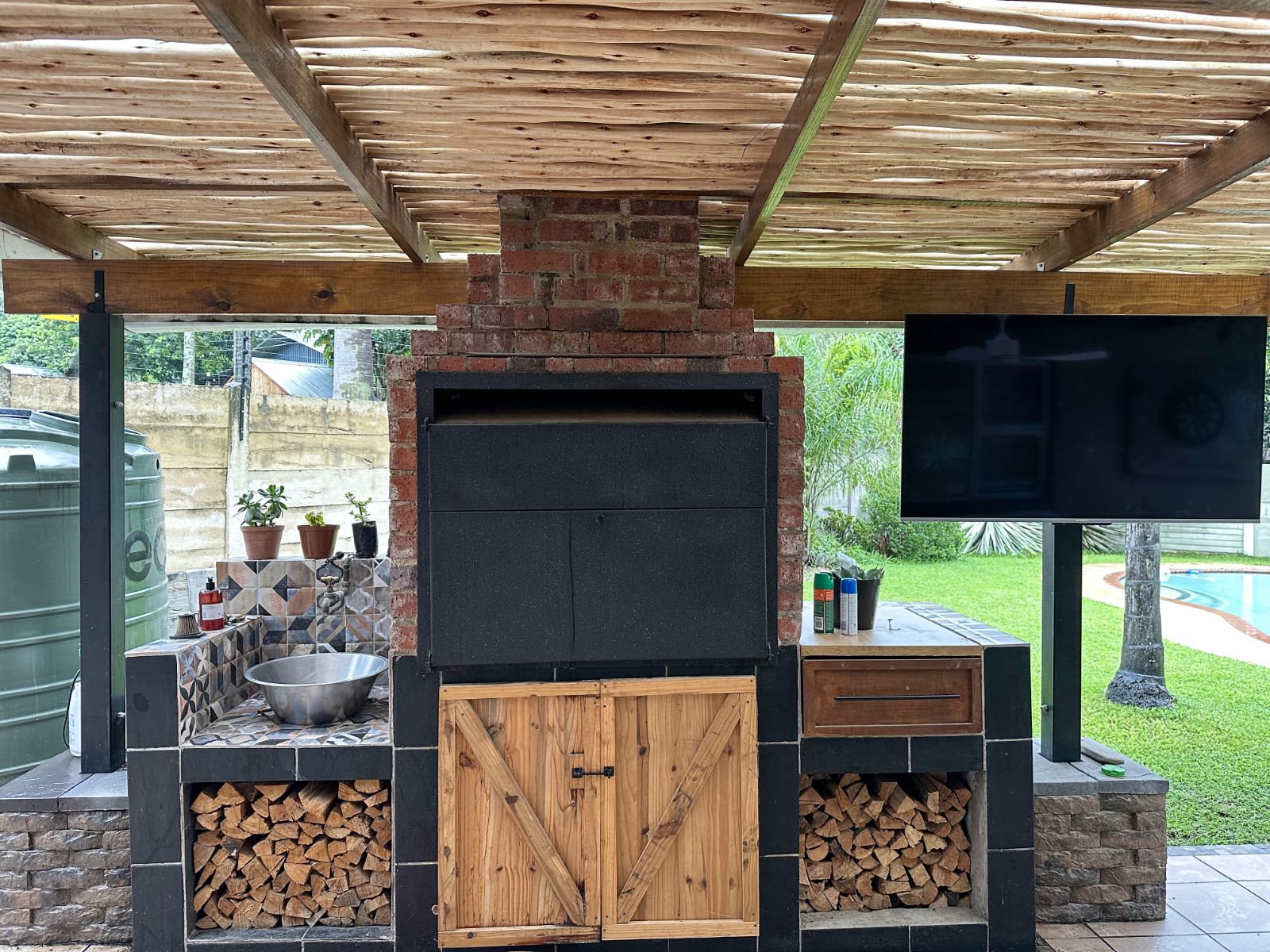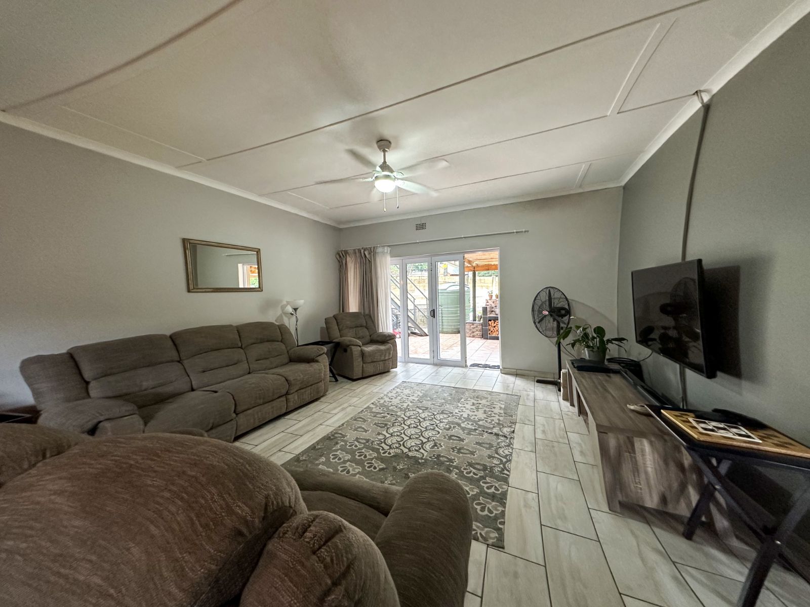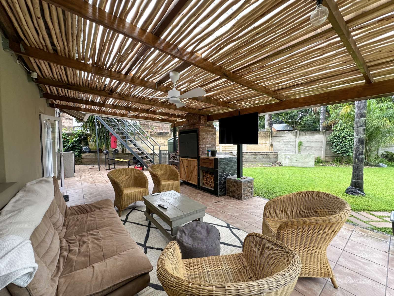 The home boasts a generous open-plan living and dining area, seamlessly flowing through stack doors onto a covered patio with a built-in braai, creating an inviting space for entertaining while overlooking the well-maintained garden and swimming pool.