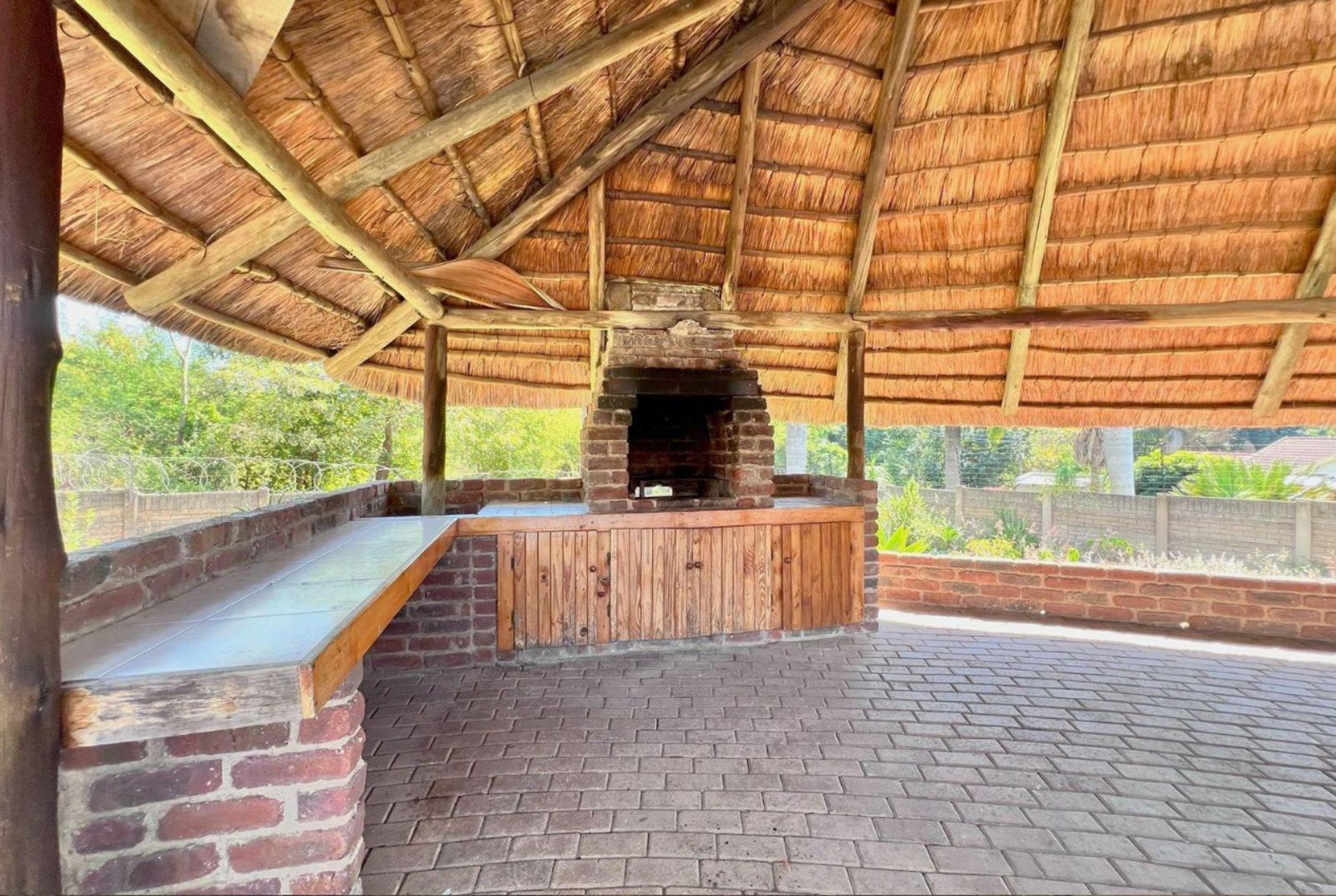 Covered entertainment area at the back with built-in braai and sparkling swimming pool