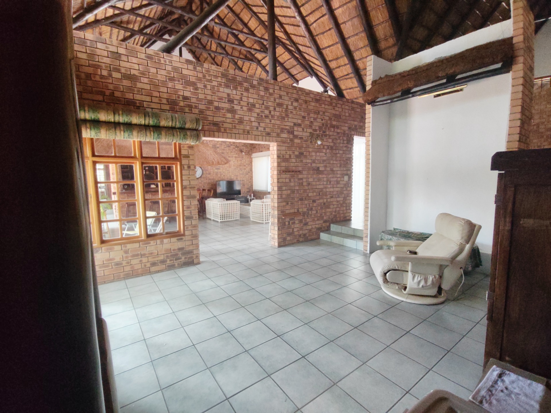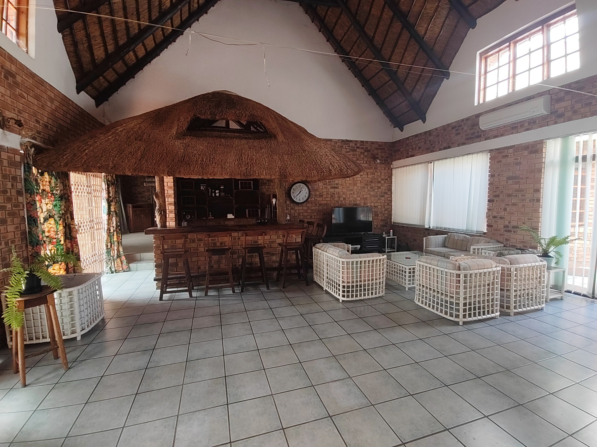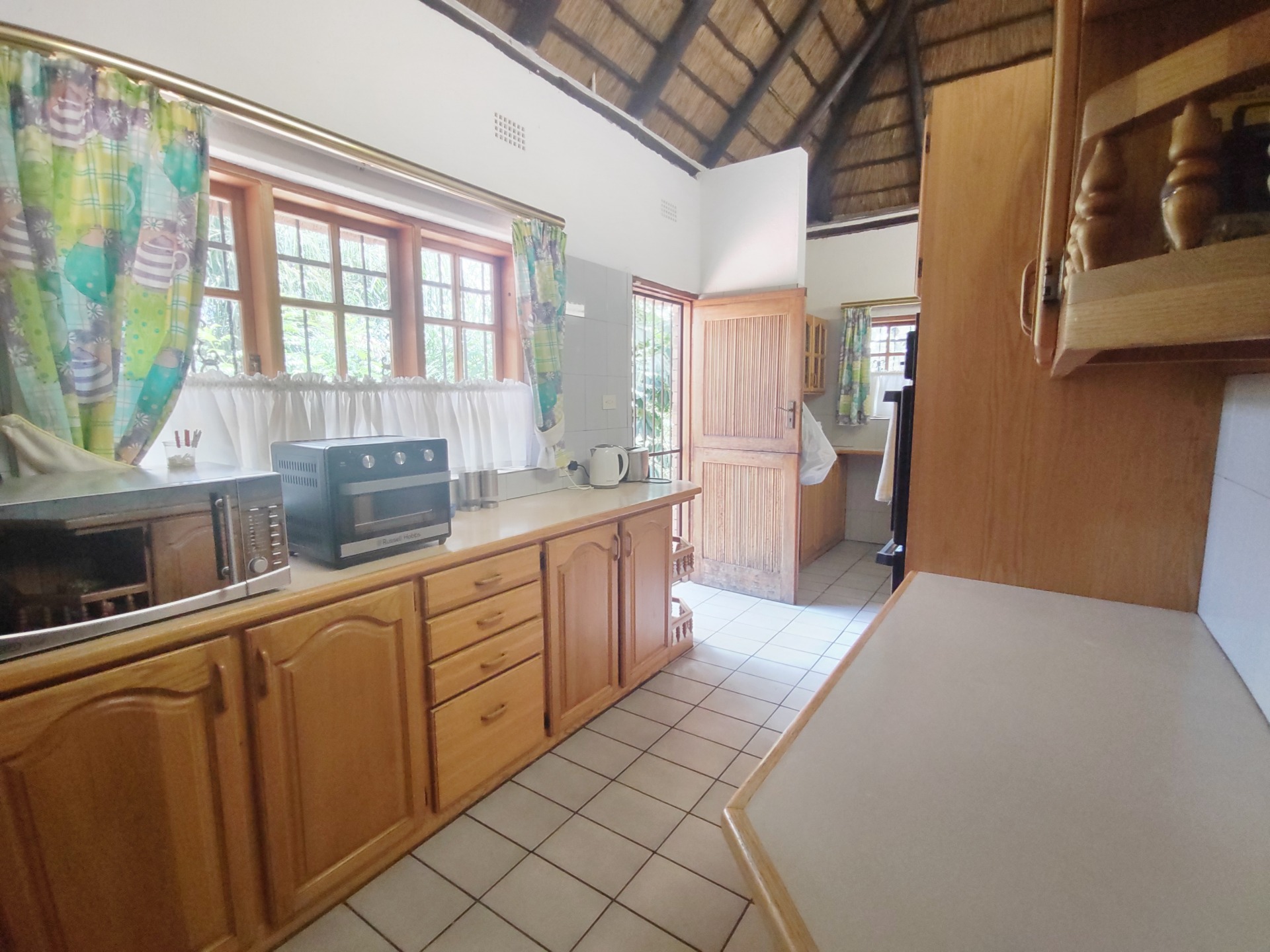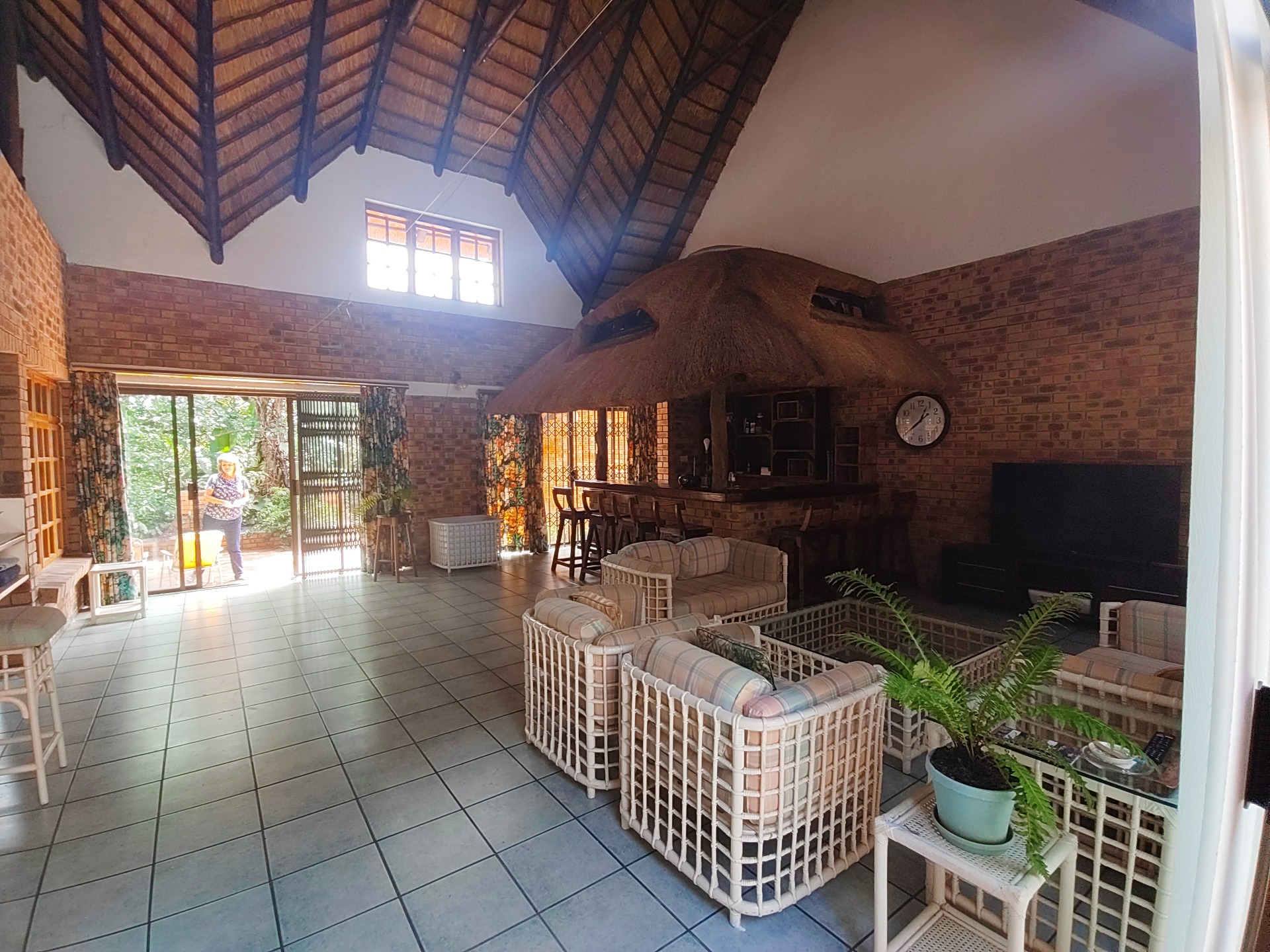 Inside, discover a spacious dining area, a cozy lounge, and a well-appointed kitchen. The entertainment room is a highlight, featuring a thatched bar and doors that open onto a patio with stunning garden views, offering a scenic panorama from its elevated position.