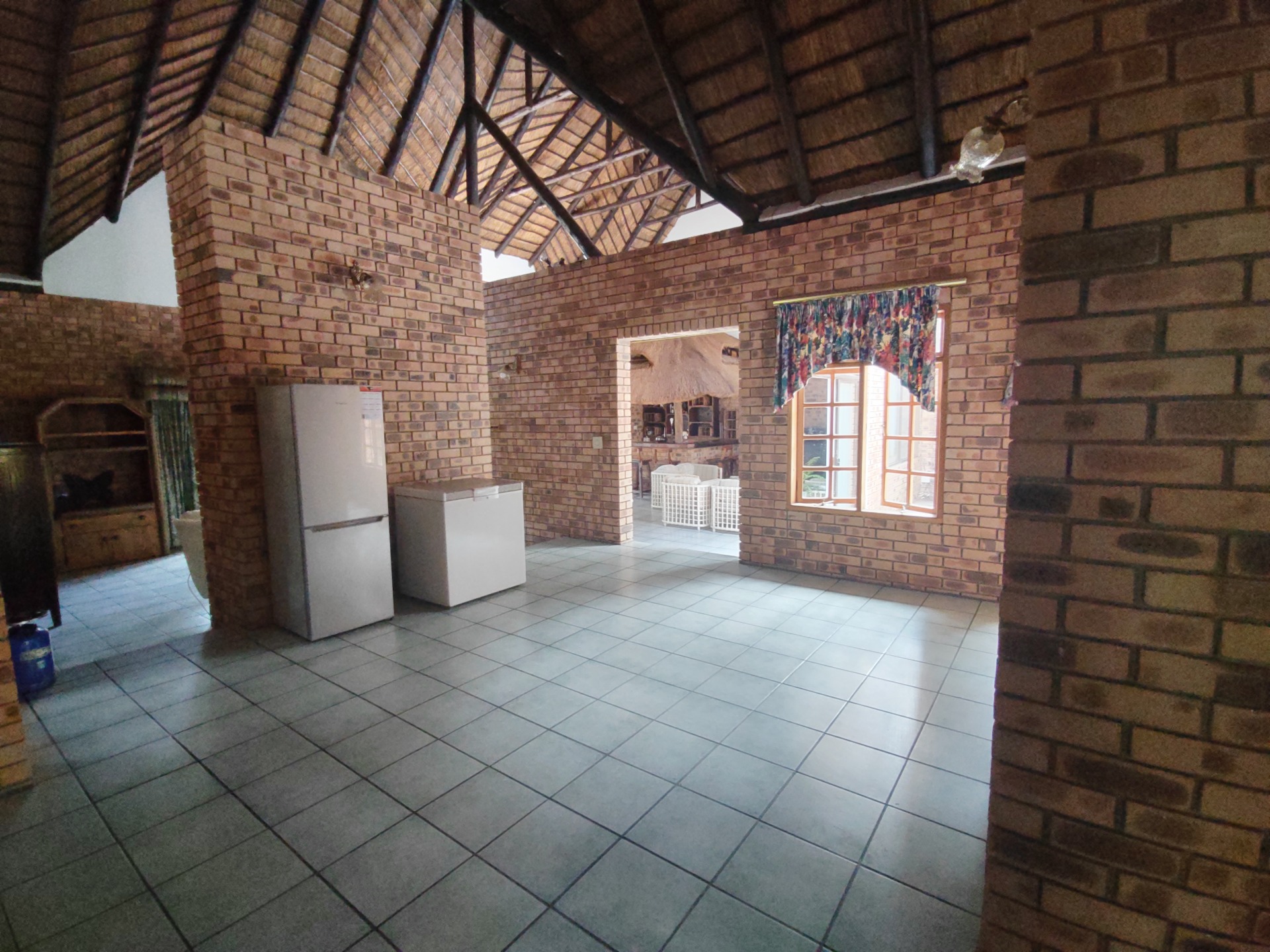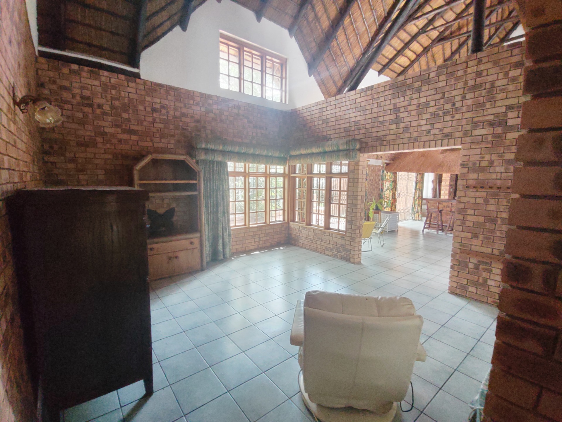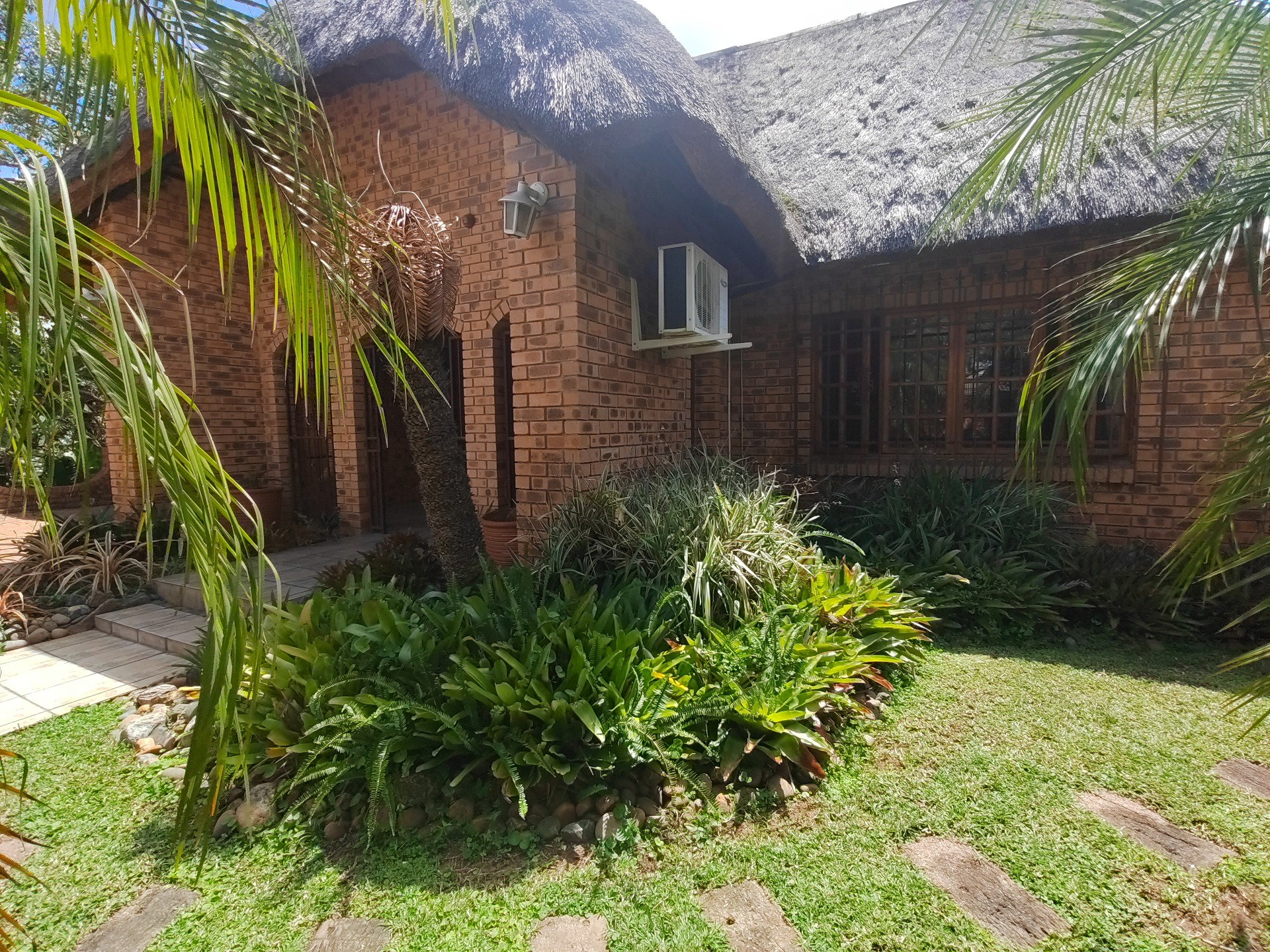 Inside, discover a spacious dining area, a cozy lounge, and a well-appointed kitchen. The entertainment room is a highlight, featuring a thatched bar and doors that open onto a patio with stunning garden views, offering a scenic panorama from its elevated position.
