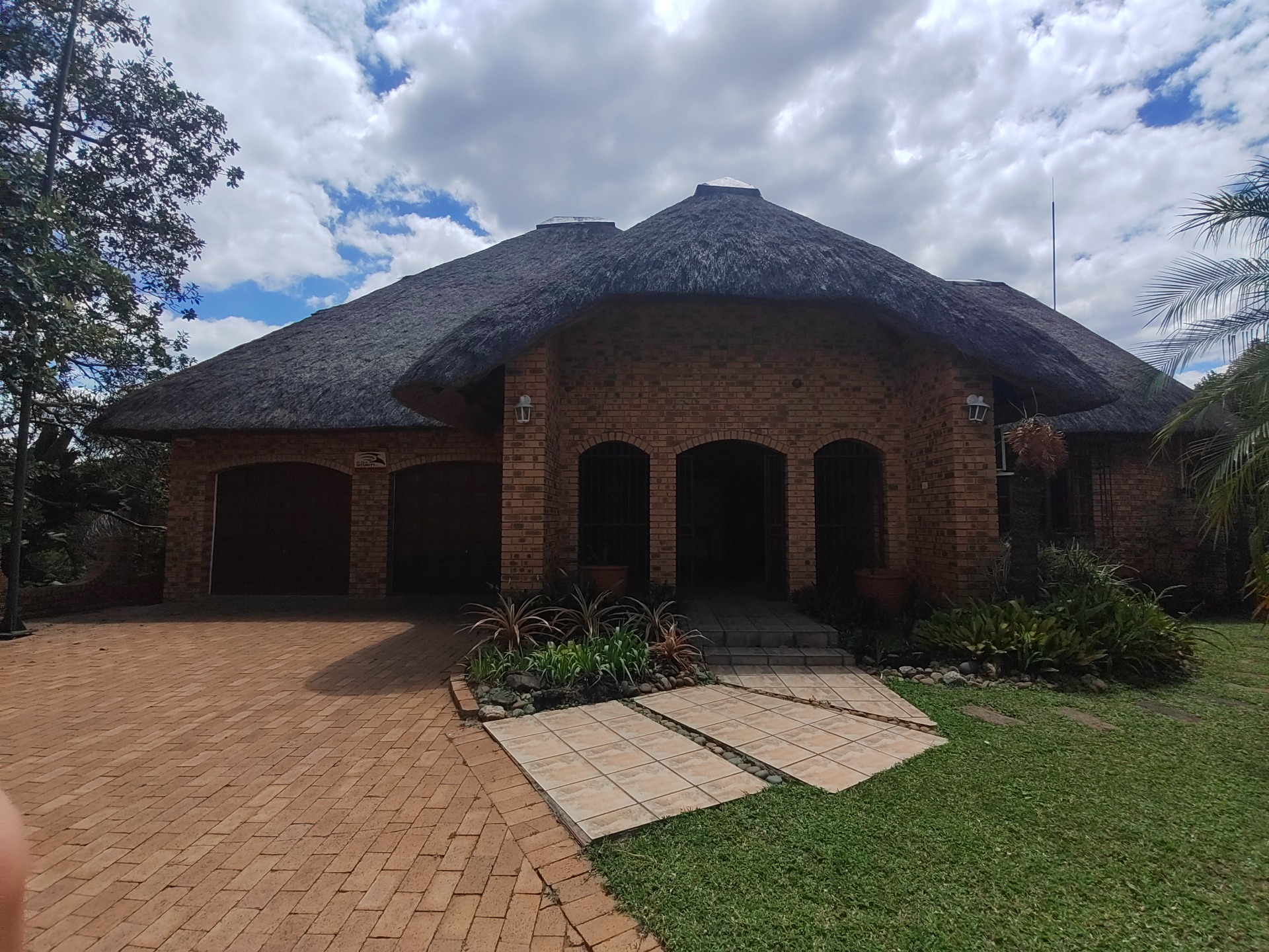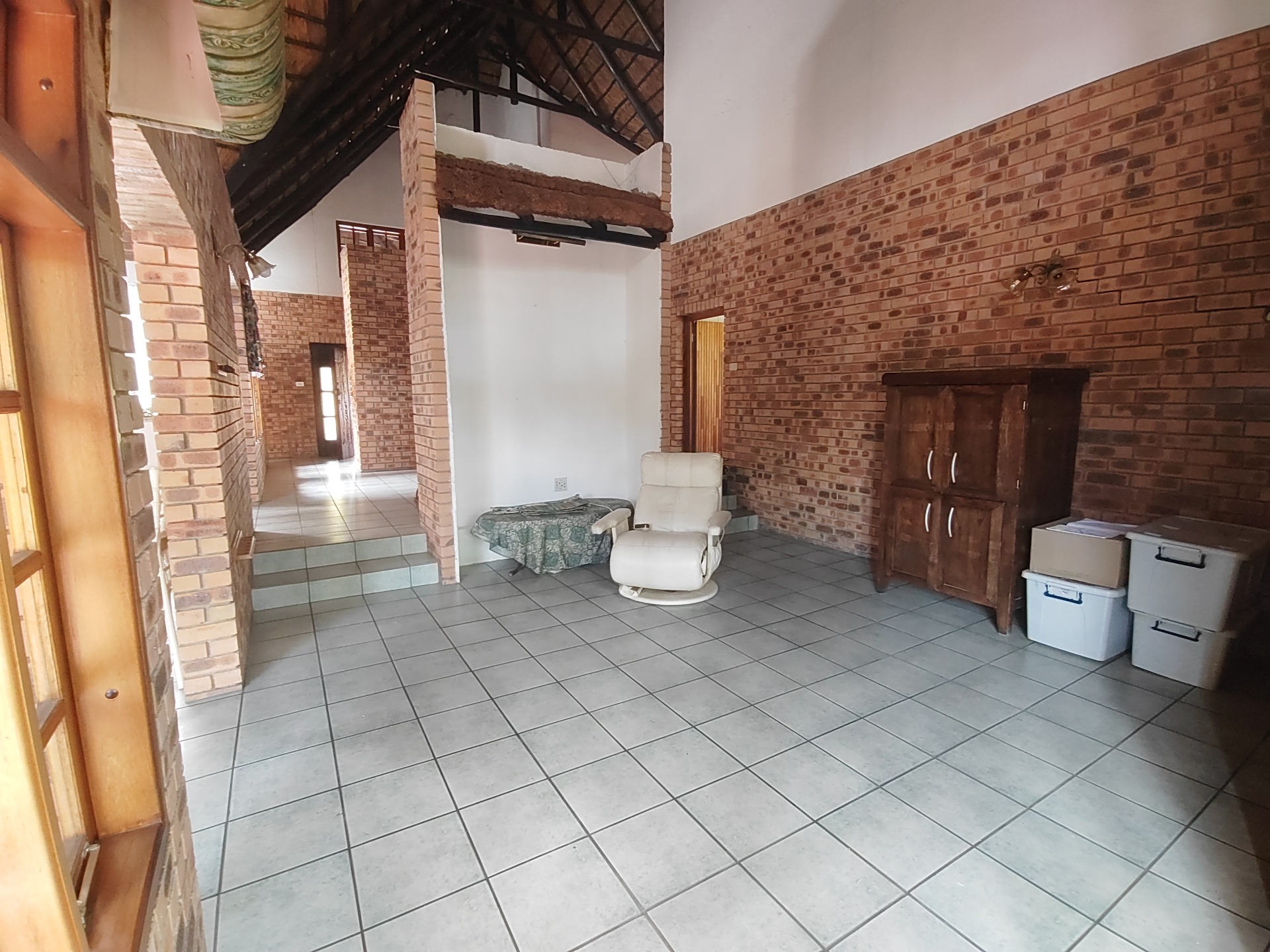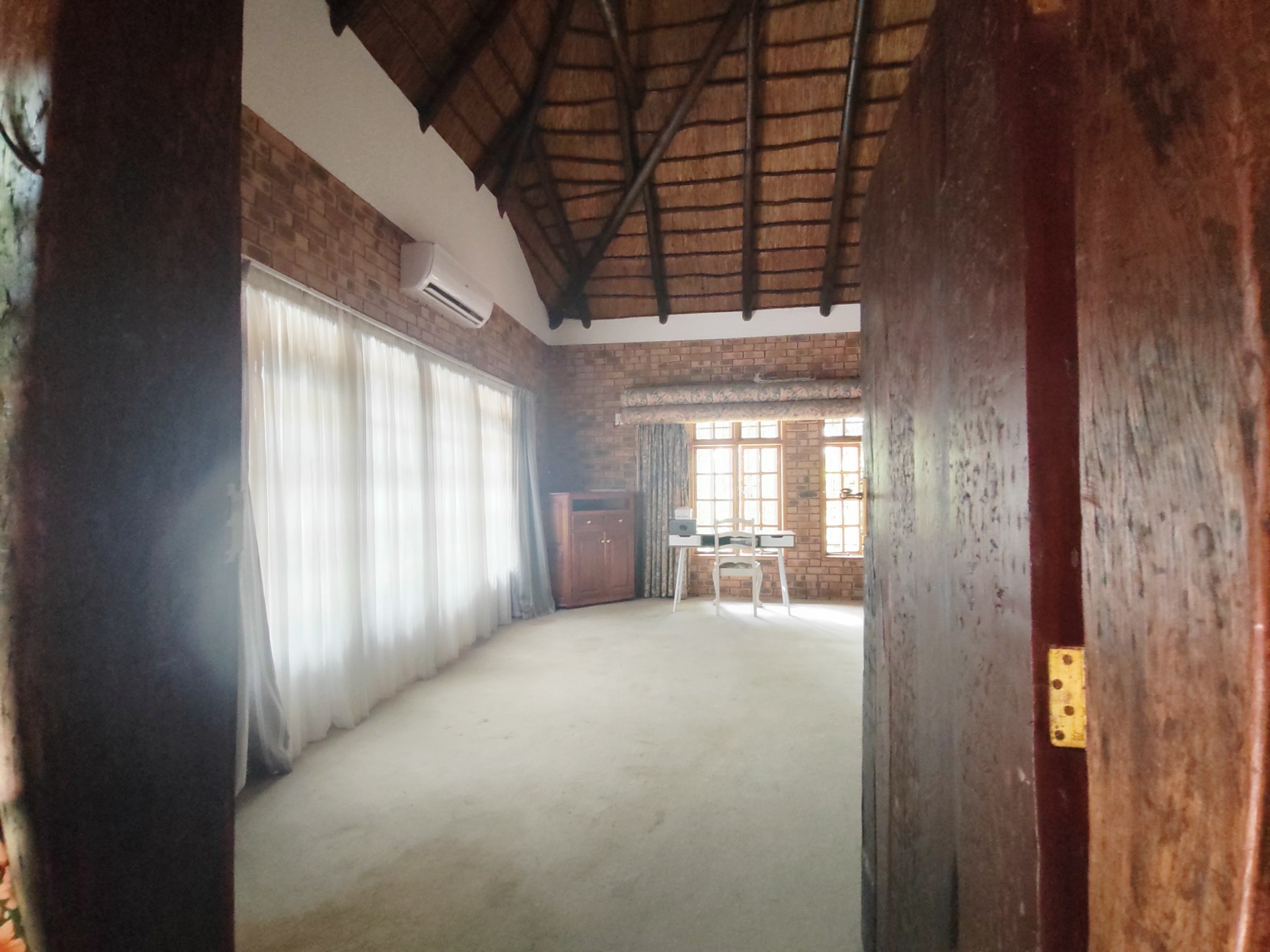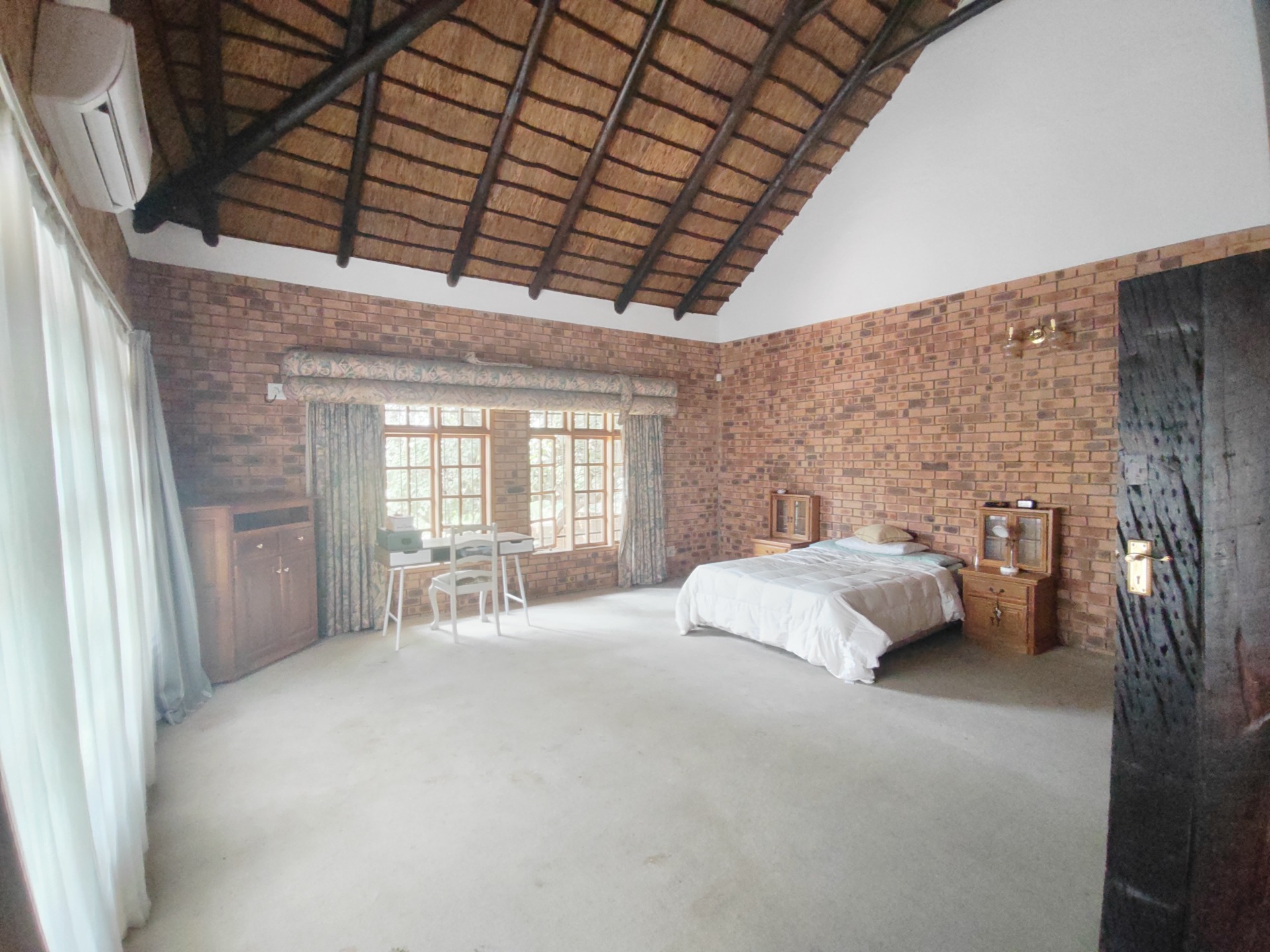 Inside, discover a spacious dining area, a cozy lounge, and a well-appointed kitchen. The entertainment room is a highlight, featuring a thatched bar and doors that open onto a patio with stunning garden views, offering a scenic panorama from its elevated position.