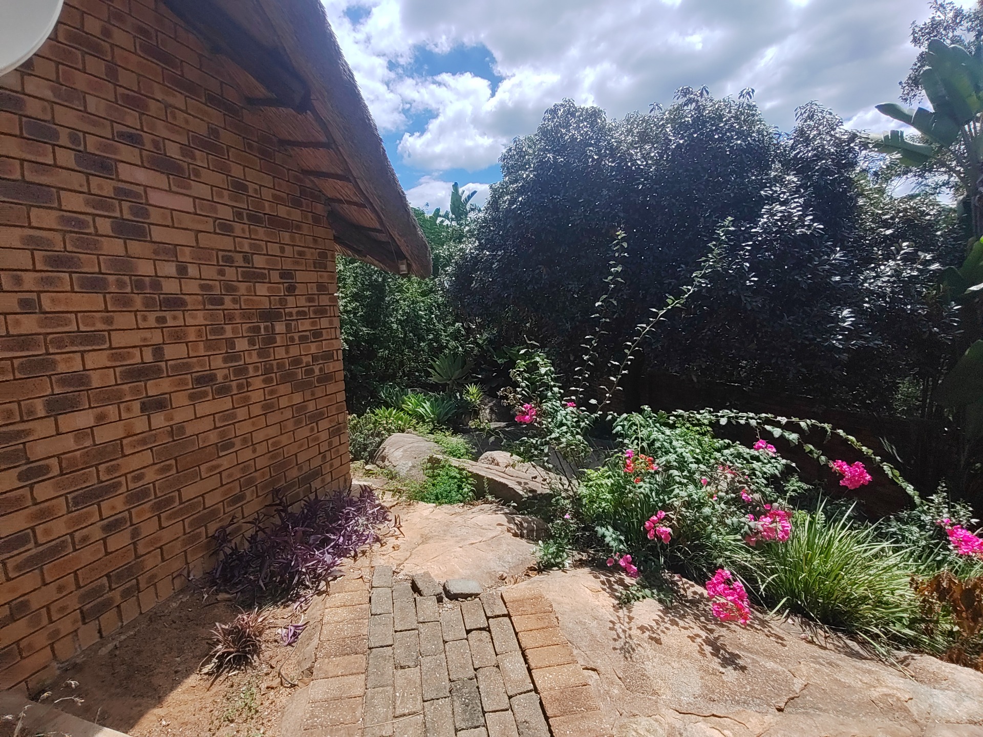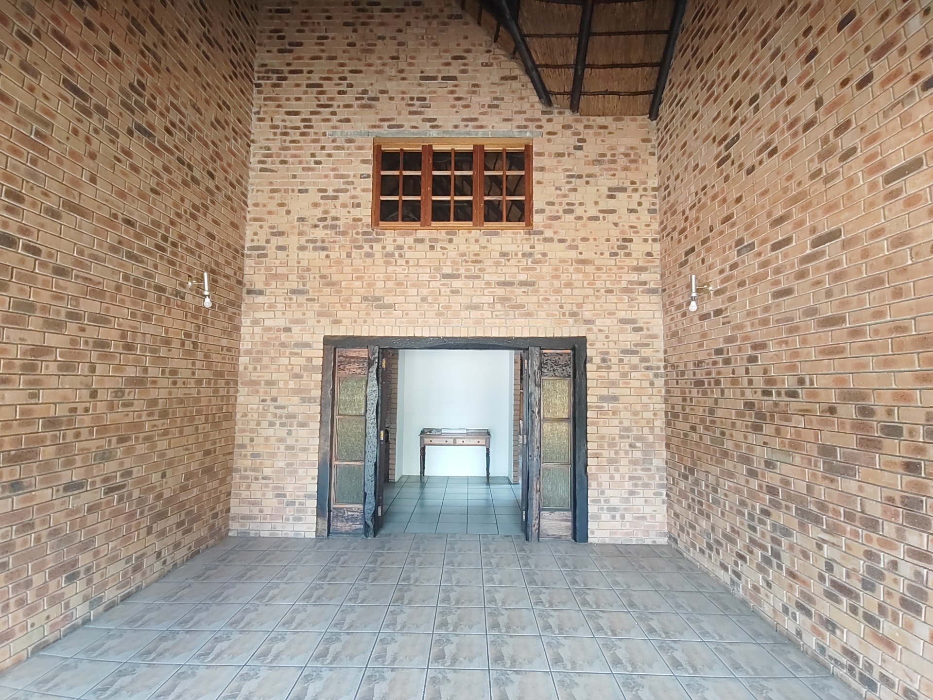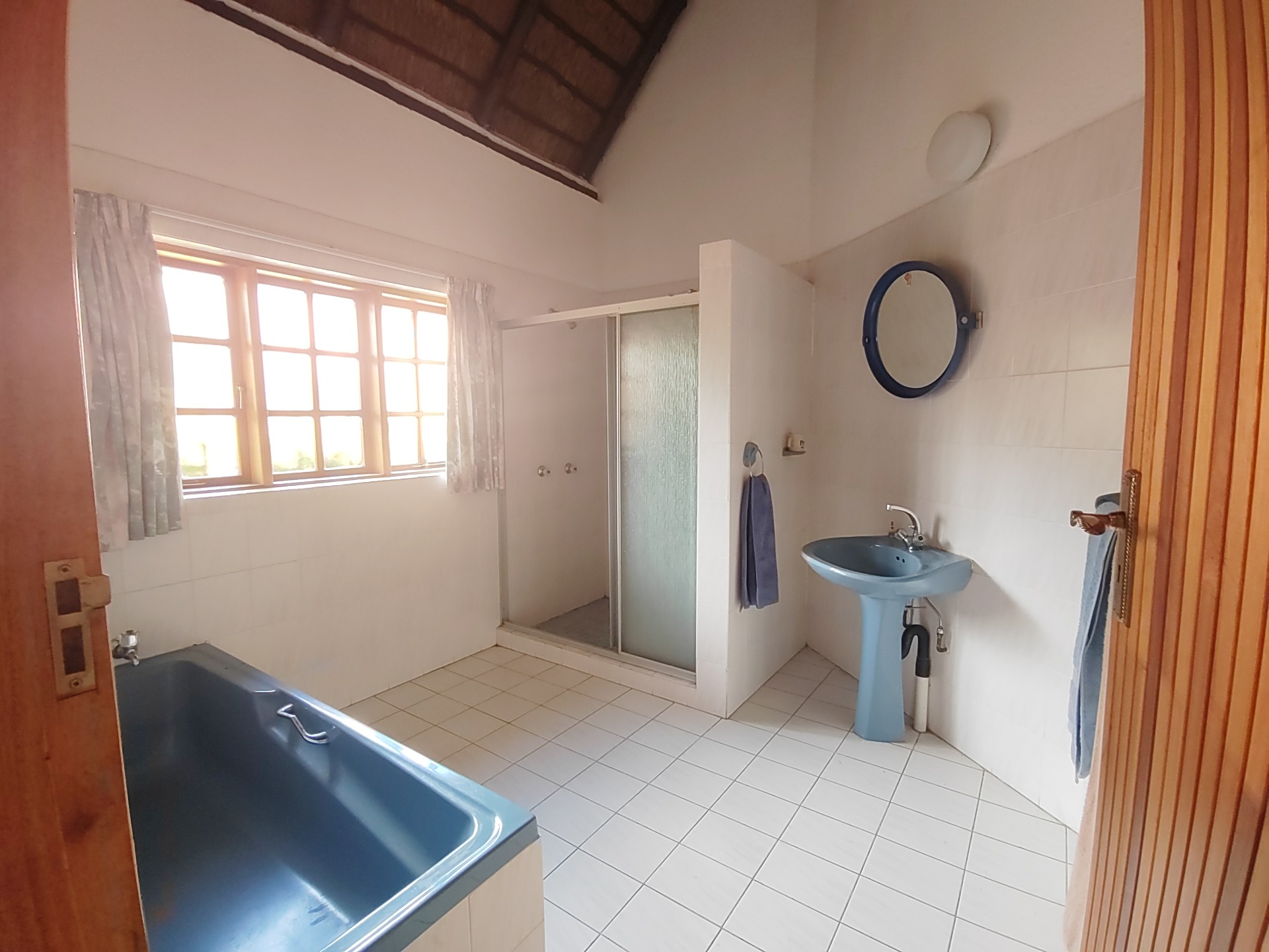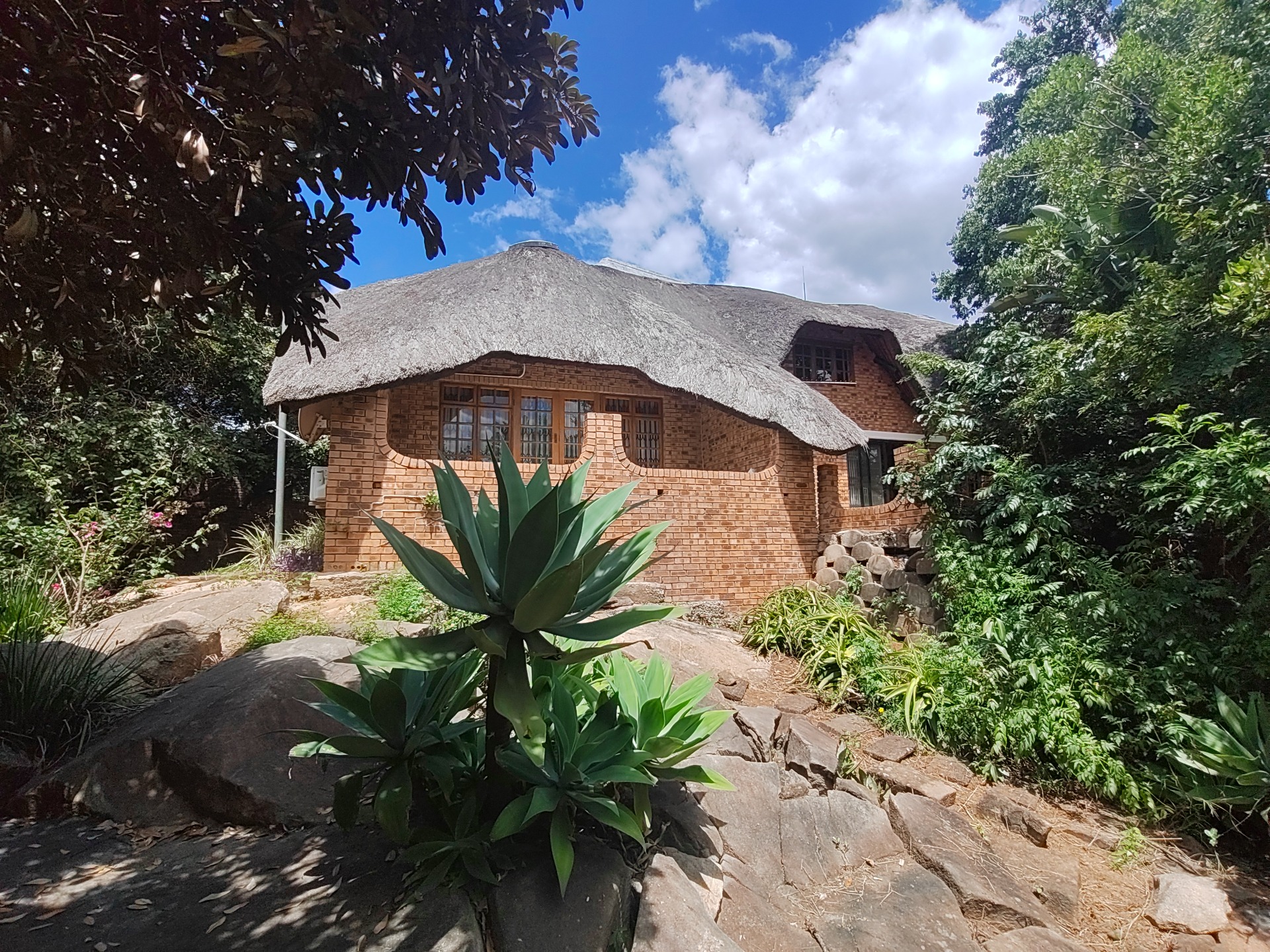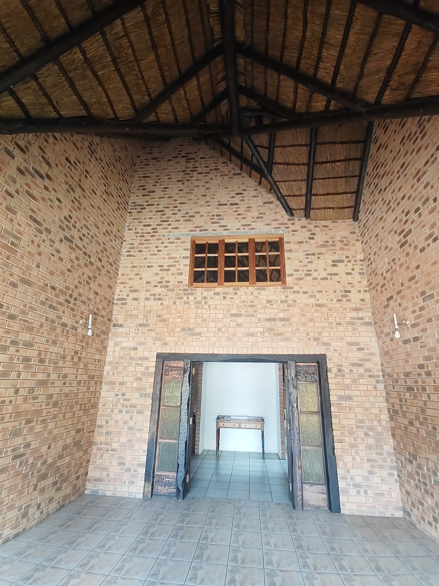 Introducing a charming thatched-roof residence, gracefully perched on a rocky foundation. This unique home invites you into an expansive entertainment patio leading to a grand hall with high-pitched ceilings and wooden windows, creating a warm and inviting atmosphere. The property features tiled floors throughout, with cozy carpets in the bedrooms for added comfort.