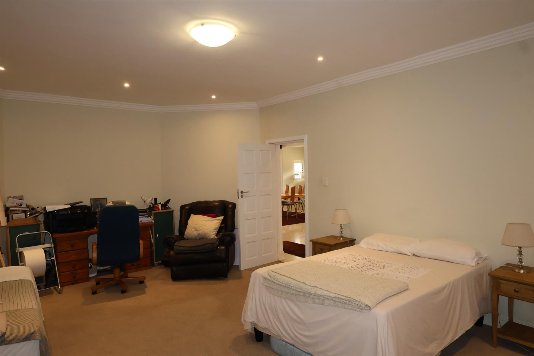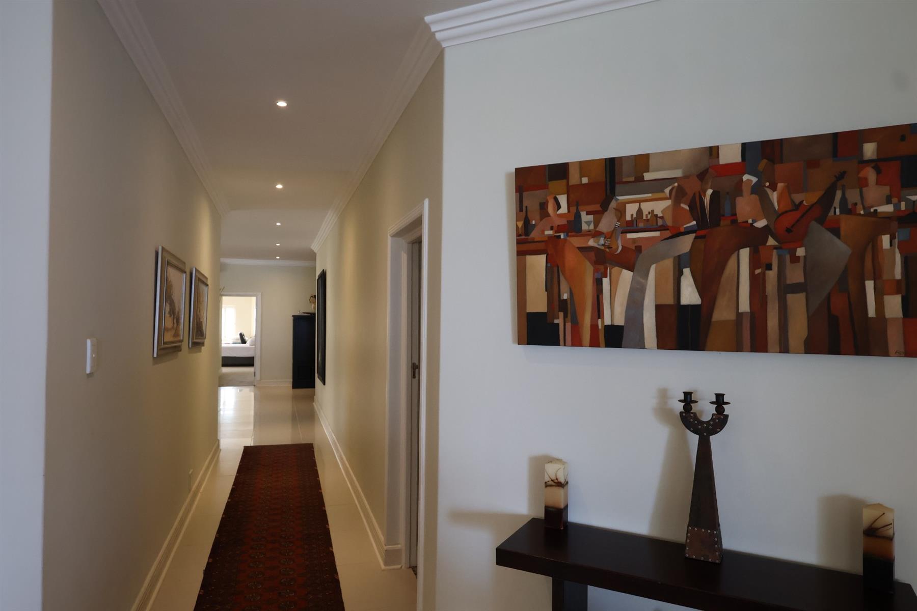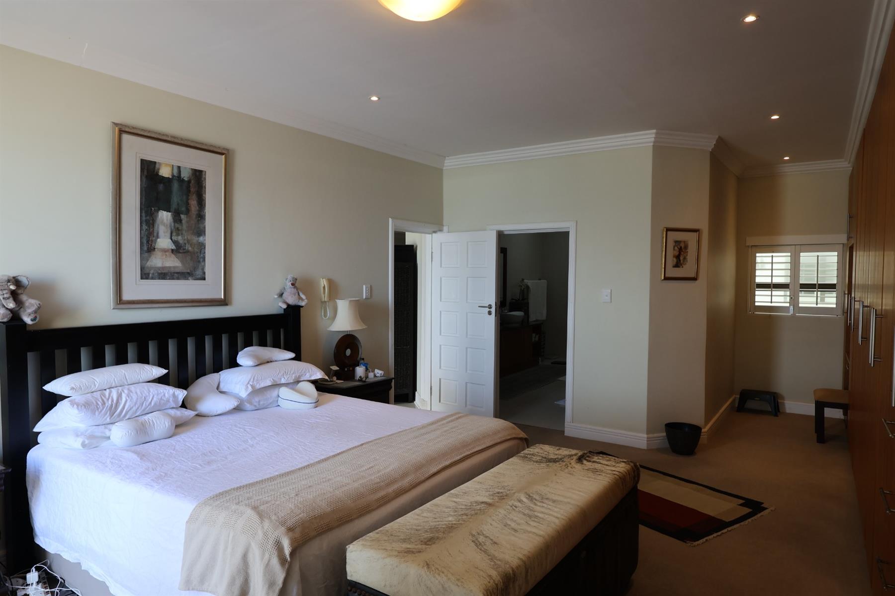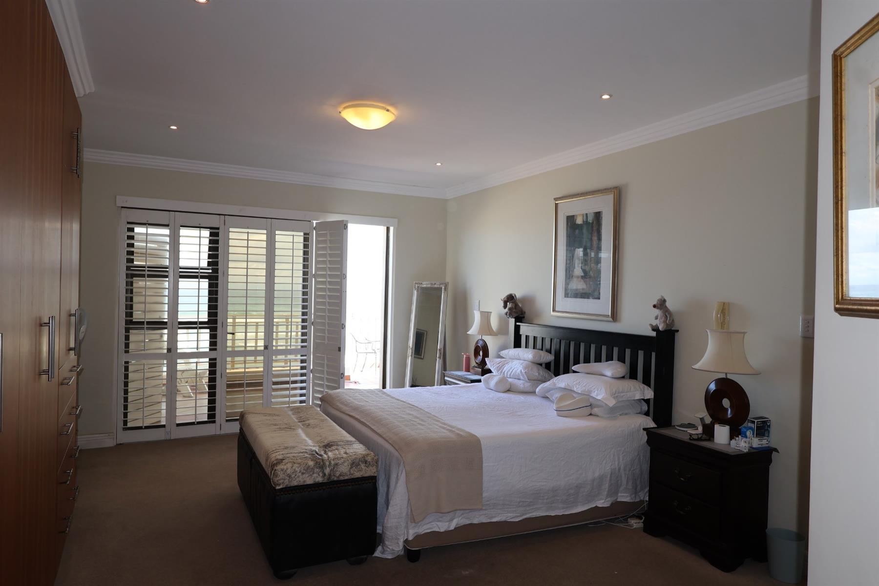 Accommodation includes four generously sized en-suite bedrooms, all fitted with built-in cupboards. The main bedroom enjoys a prime position with direct access to the patio and a full en-suite bathroom featuring double vanities — a private retreat framed by ocean views. A guest cloakroom adds further convenience.