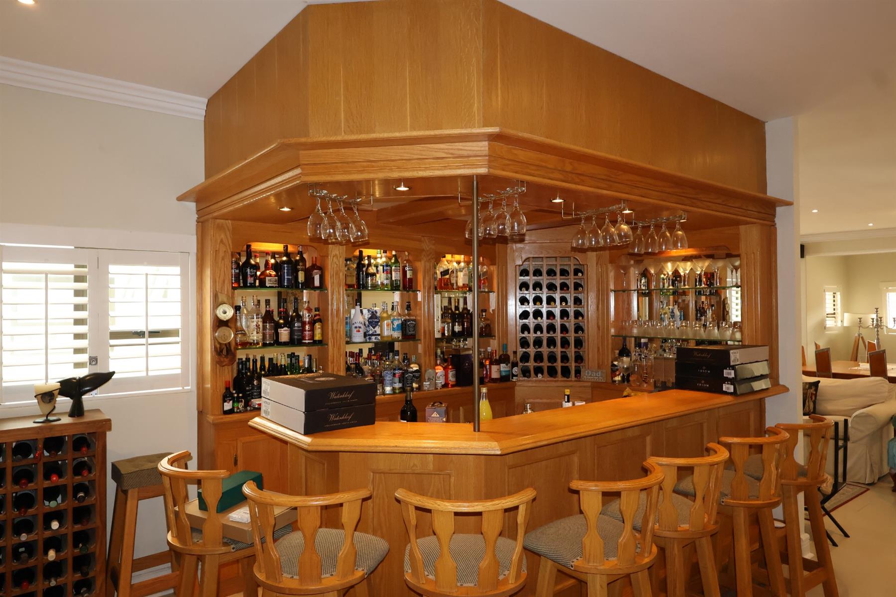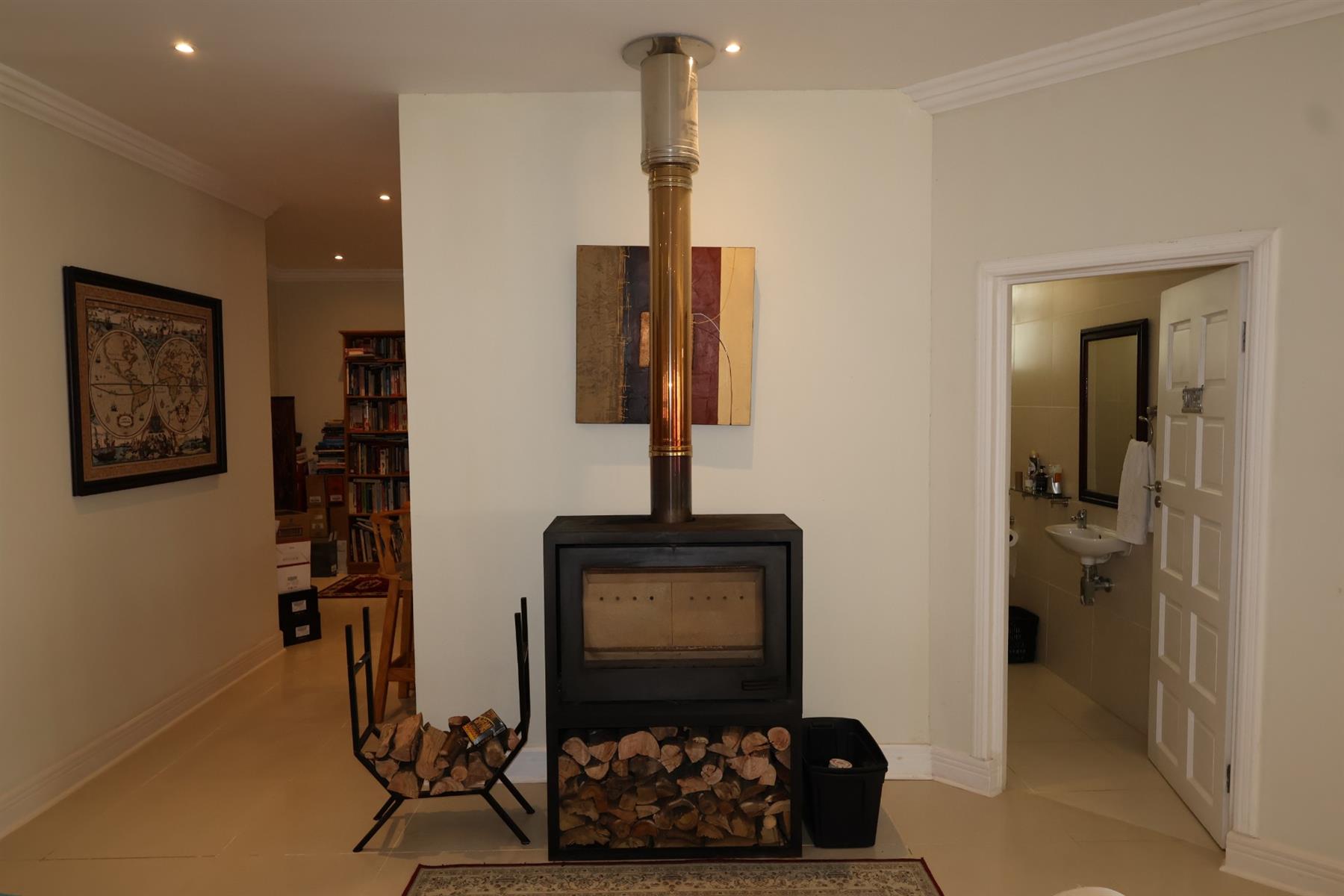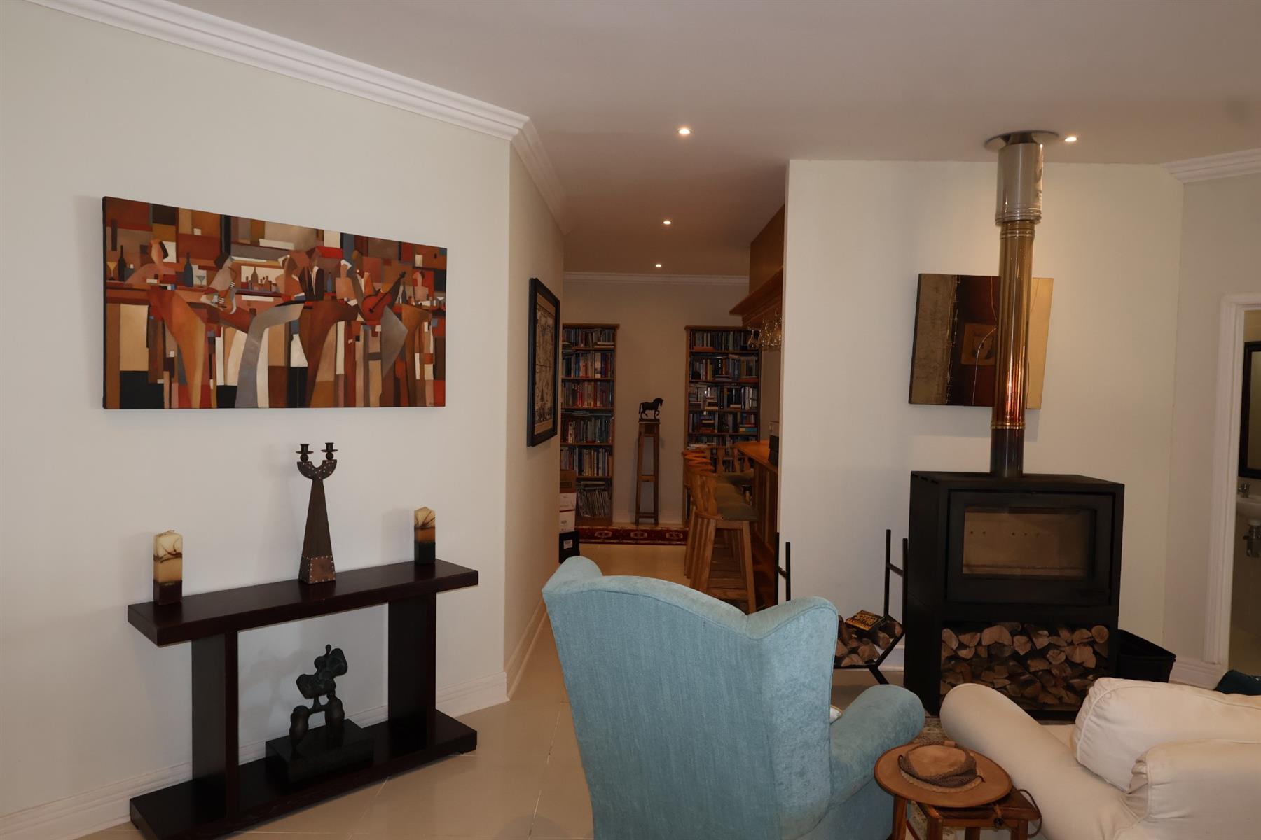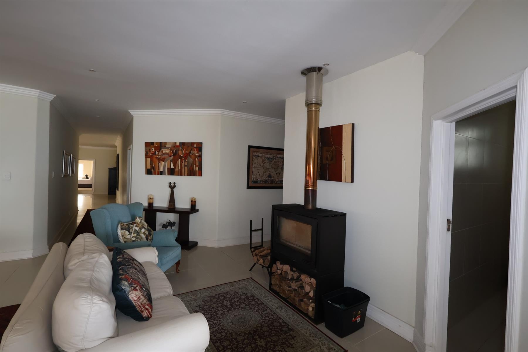 The contemporary kitchen is well equipped with granite countertops, a gas hob, under-counter oven, extractor fan, and a separate scullery accommodating all major appliances. Thoughtfully integrated features such as a solid oak bar, custom shelving, and a wood-burning fireplace add warmth and character to the home, while tiled floors throughout ensure easy coastal living.