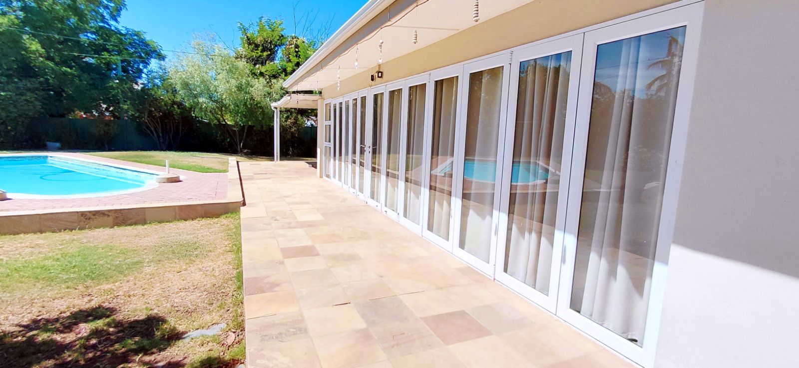 Stacking doors open to a patio overlooking the pool and large garden, creating a seamless indoor-outdoor living experience.