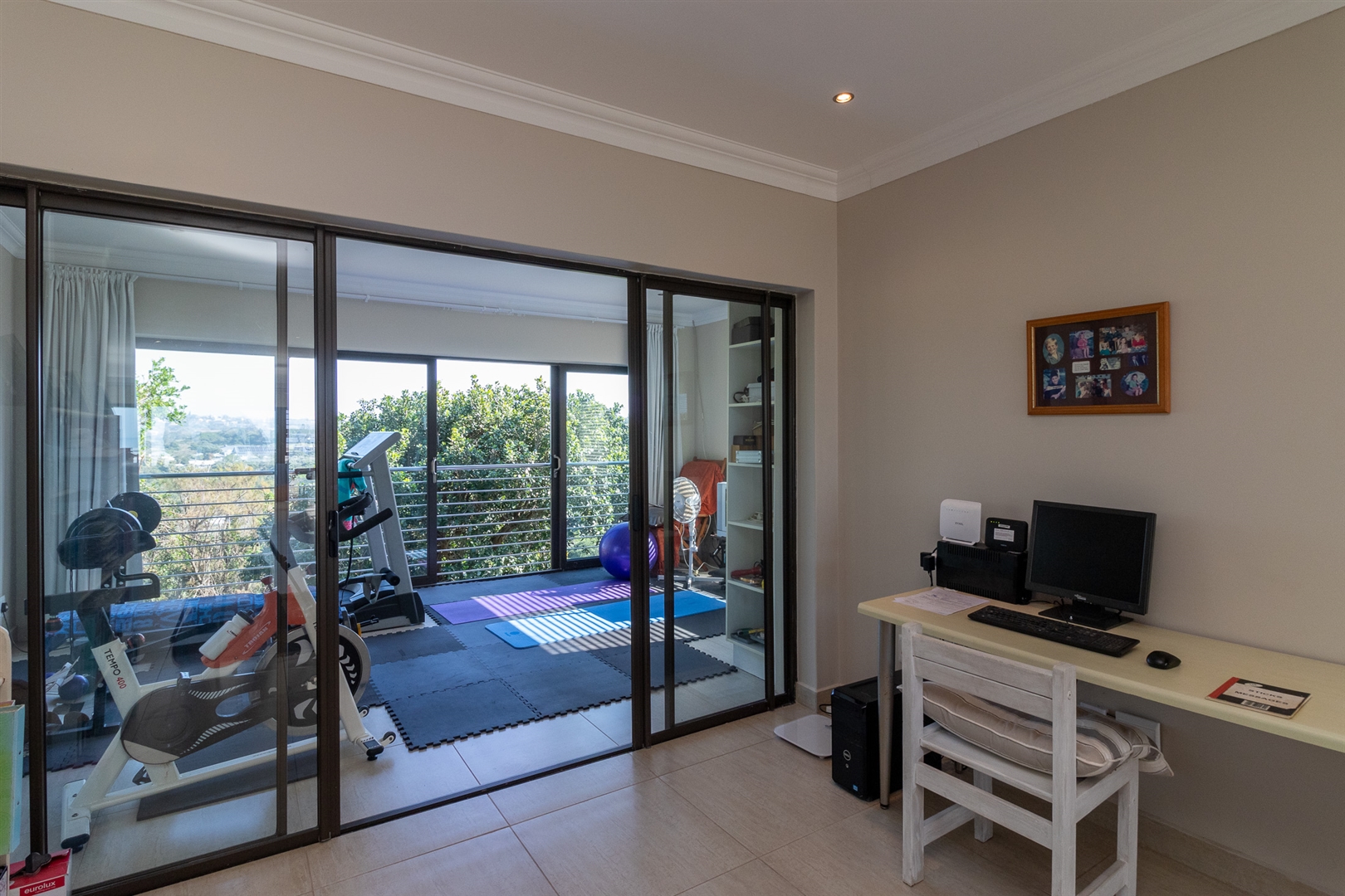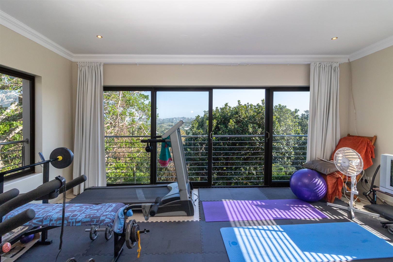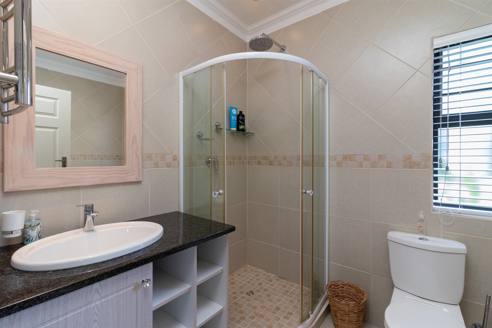 For fitness enthusiasts, a well-equipped gym offers captivating vistas over the Royal Alfred Golf Course. The upper level also houses a generously sized master suite featuring a walk-in wardrobe and an en-suite bathroom. A second large guest bedroom with an en-suite bathroom promises comfort and luxury.