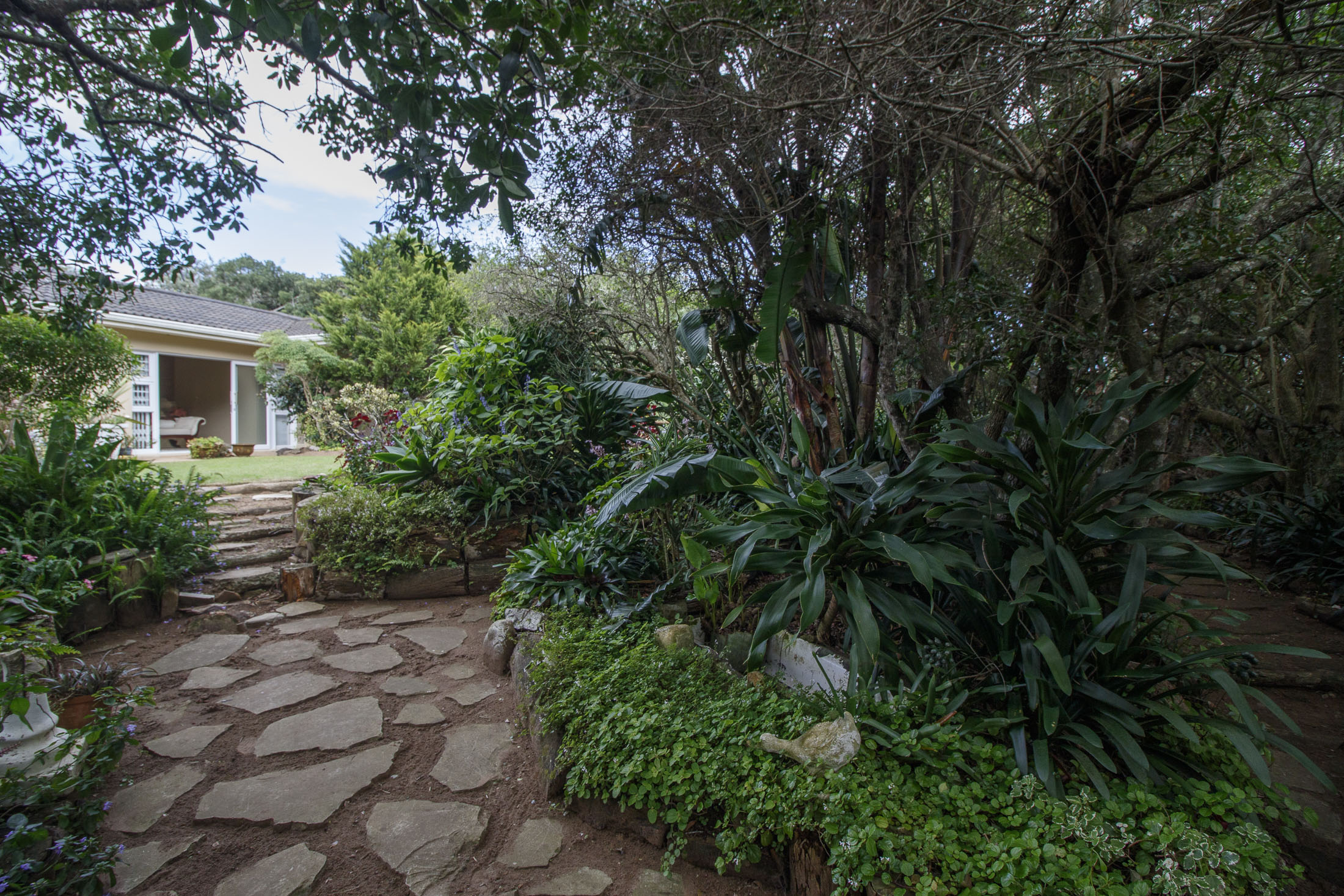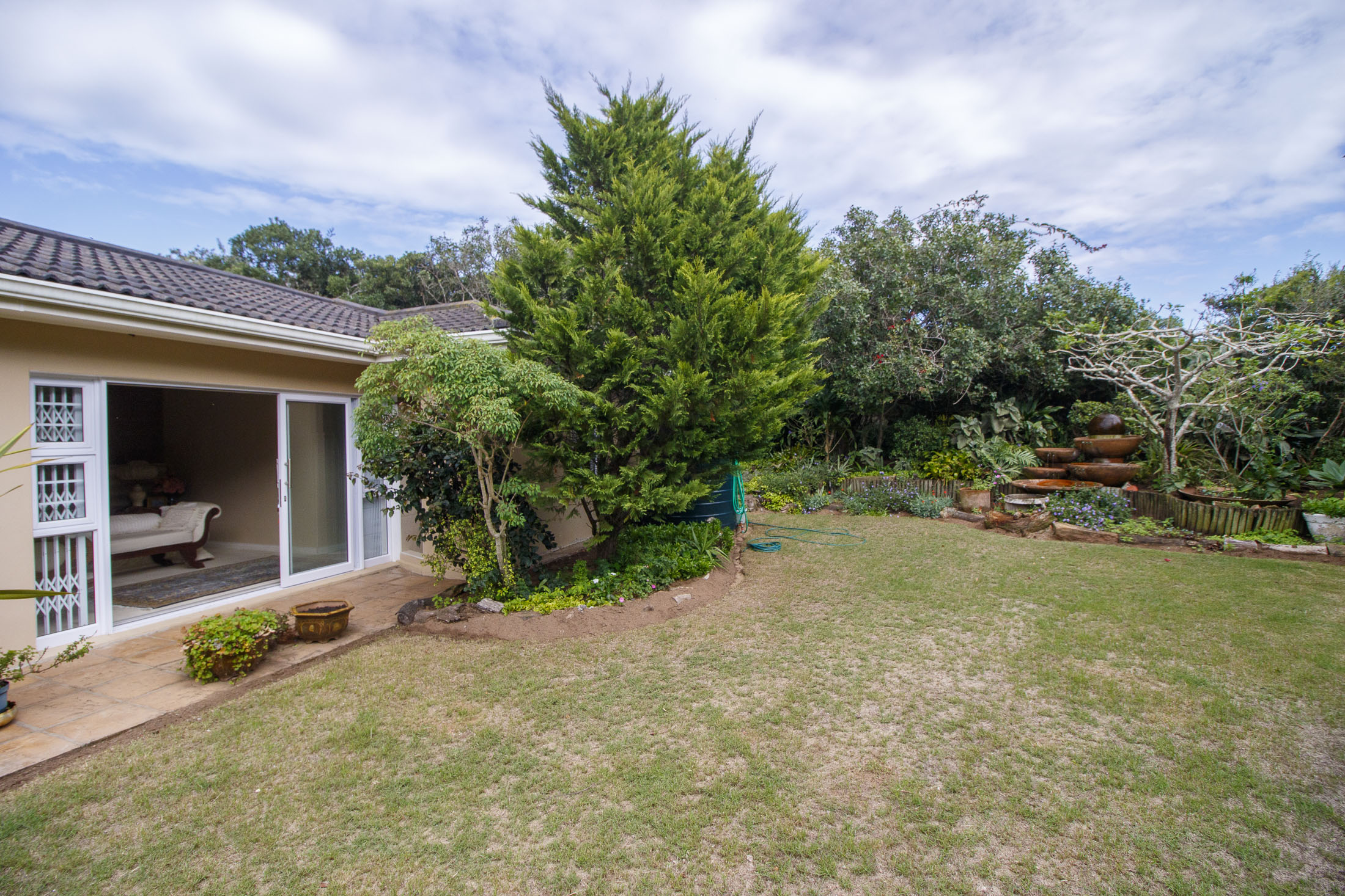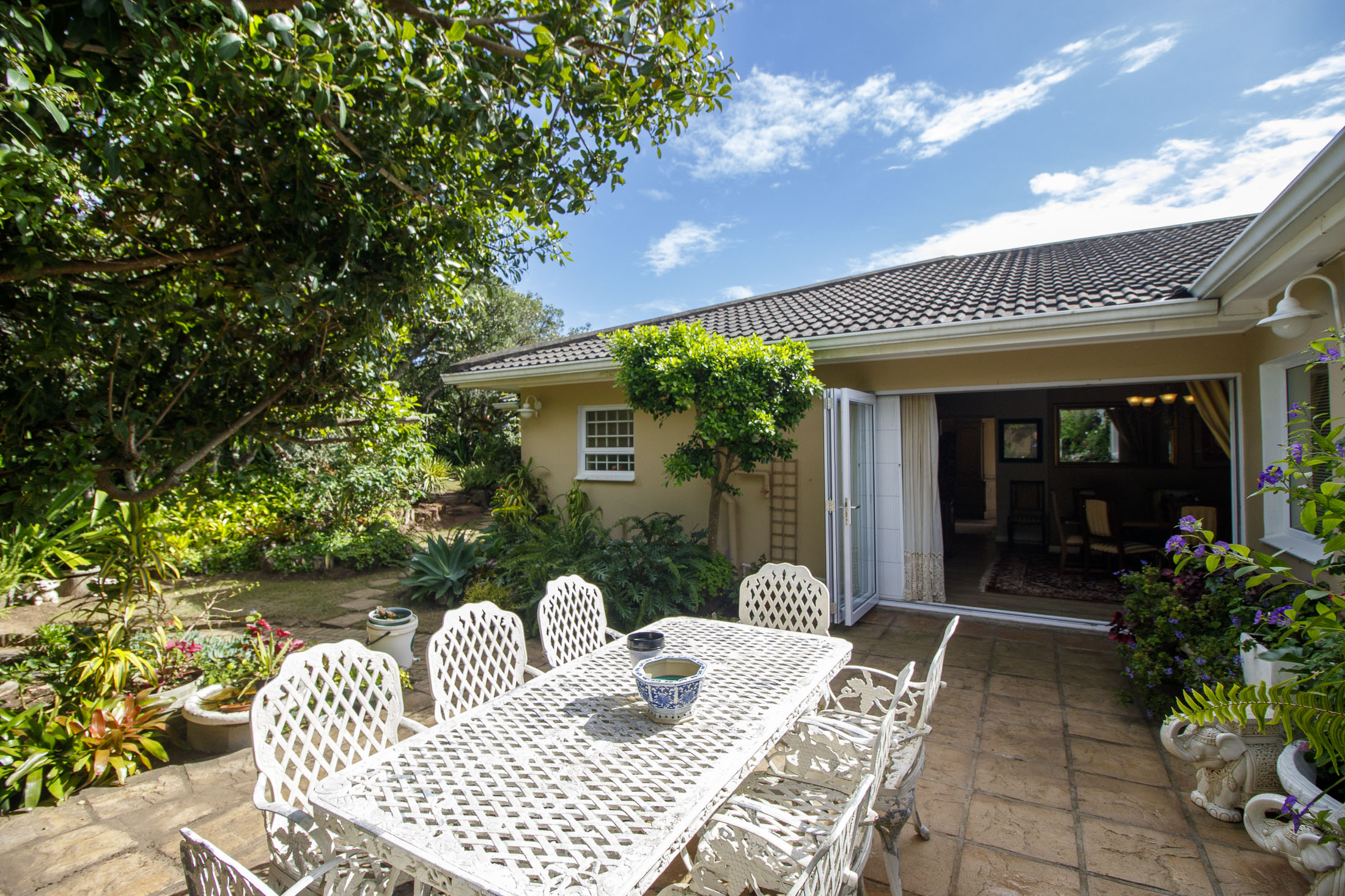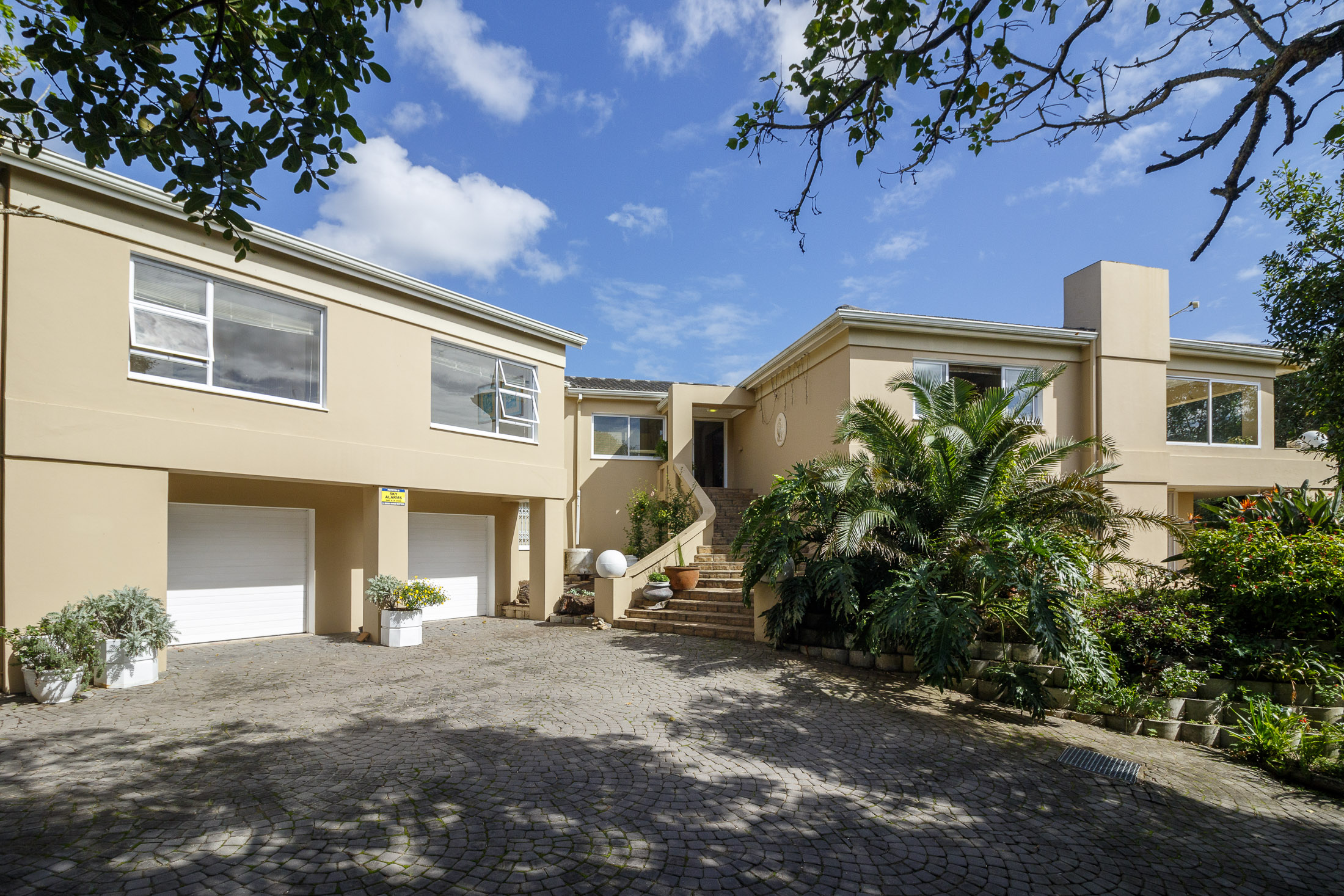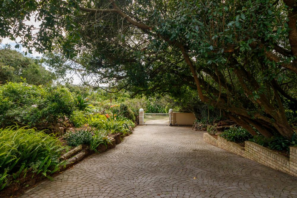 Embark on a serene journey into this cul-de-sac, where tranquility awaits. Nestled within, a beautiful home is surrounded by an exquisite, landscaped garden, creating a peaceful haven. Approach the property via an automated gate that opens to a delightful garden and a paved driveway with ample parking. Ascend the stairs to the front door, where a welcoming entrance foyer leads to the spacious lounge, dining room, and kitchen. The seamless open-plan design effortlessly integrates the dining room with a sheltered patio and garden. On one side, the lounge extends via stack doors to a north-facing garden, while on the other, folding stack doors give way to a partially covered, east-facing patio with a built-in gas braai, offering versatility and comfort. Here, you can sit outdoors, enjoying attractive views over the marina and surrounding tree tops. The modern, well-appointed kitchen boasts granite countertops and features sliding windows that open onto the patio. Additional features in the kitchen include an undercounter oven, both gas and electric hobs, an extractor, and a scullery concealed from sight. The master bedroom is carpeted, with an entire wall of cupboards and a full en suite bathroom. Bi-folding doors frame garden views and give access to the well-manicured garden, complete with a stunning water feature and private seating area. A second bedroom on the same level has its own en suite bathroom and opens via sliding doors to the garden. For those who need to work from home, a study situated just inside the front door affords a private workspace. The ground floor of this home has two separate en suite bedrooms, both with their own access from the garden. These two rooms are ideal for guests who require privacy, outside of the main house, where they can come and go without disturbing anyone upstairs. As you explore the property further, you'll find a charming self-contained flat with its own private patio and entrance, perfect for accommodating guests or generating rental income. This generously proportioned unit comprises an open-plan living room and kitchen, two bedrooms, and a full bathroom shared by both bedrooms. The expansive garden has so many interesting corners to explore, with pathways flanked by shrubs and groundcovers with much of the garden shaded by mature trees. Two garages with automated doors and a workshop provide secure parking for vehicles and a place to tinker, while a further two open garages afford additional undercover parking. An added advantage is a 40,000-litre underground rainwater reservoir, which is filtered and plumbed to the house. There are also several rainwater tanks with a total capacity of 25,000 litres for garden use. Complete with excellent security measures, this home provides both comfort and practicality.
