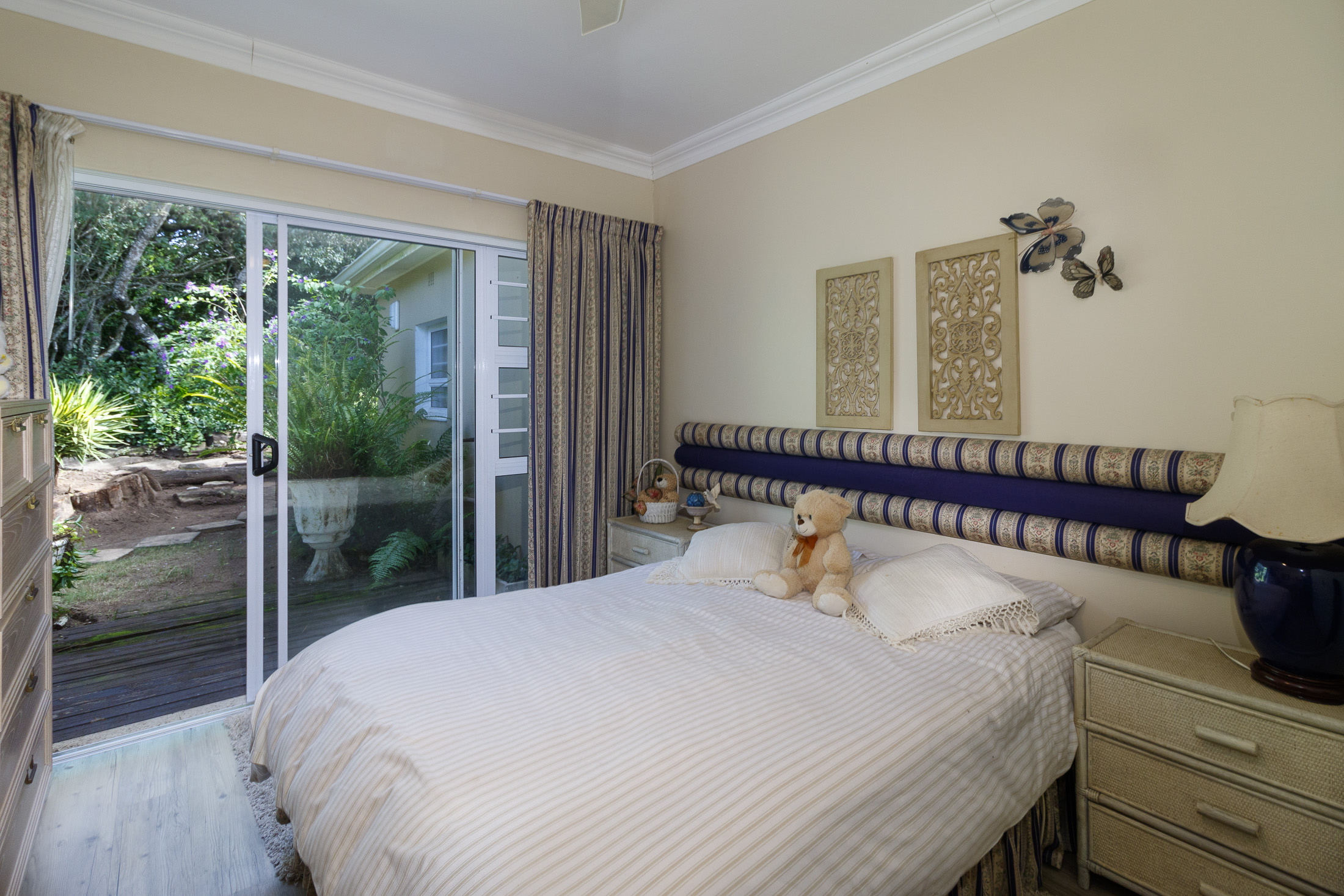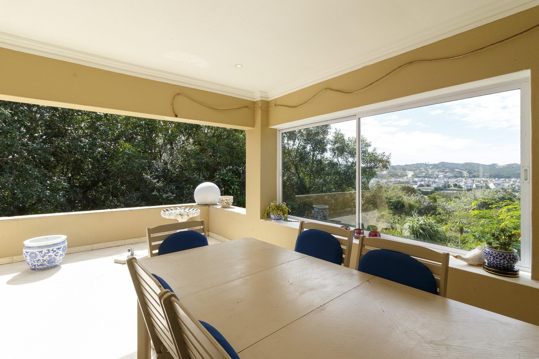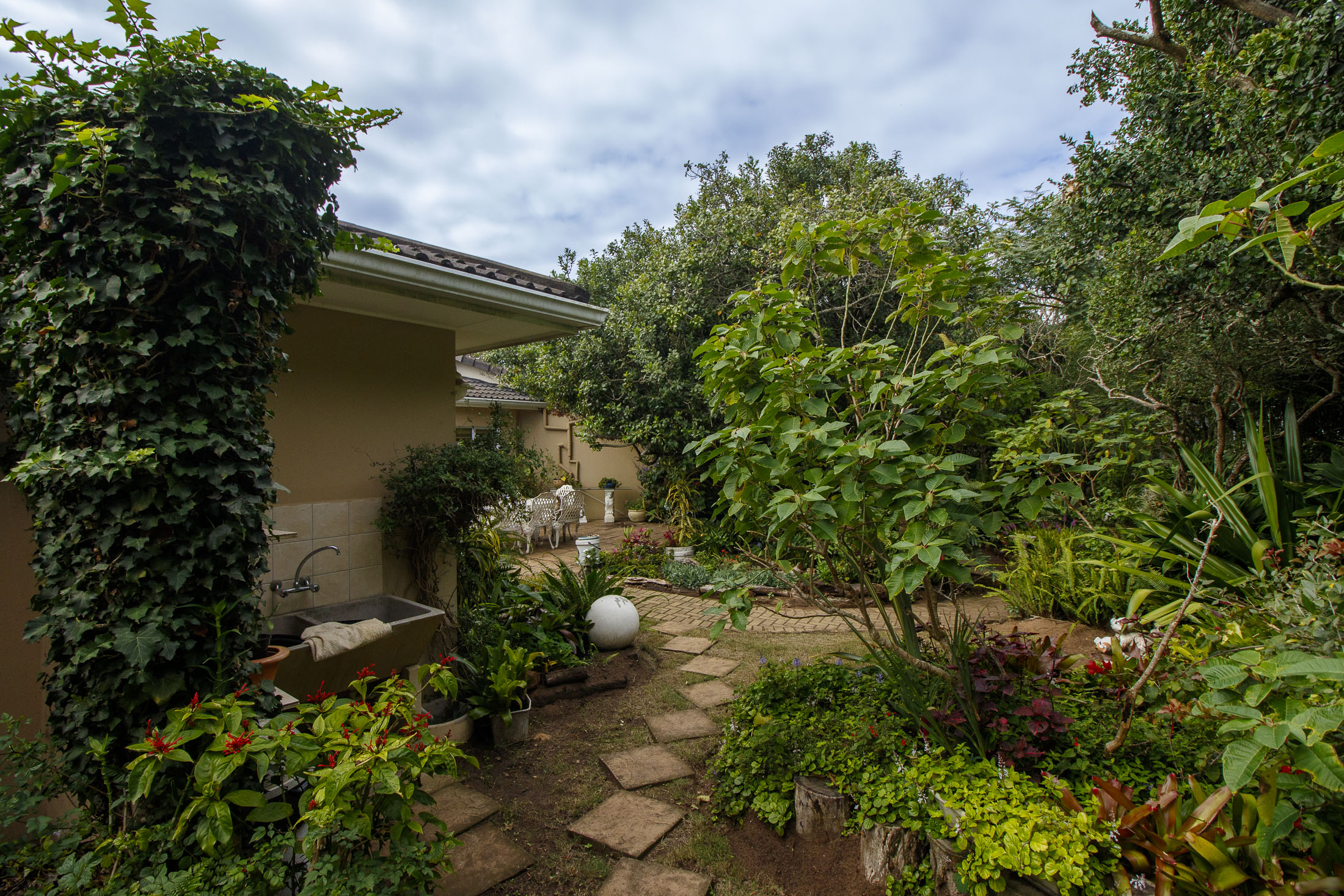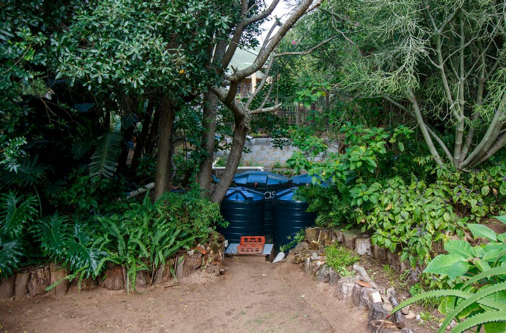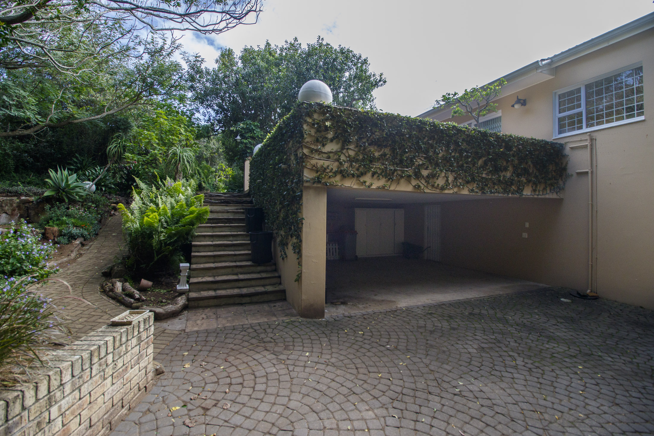 Embark on a serene journey into this cul-de-sac, where tranquility awaits. Nestled within, a beautiful home is surrounded by an exquisite, landscaped garden, creating a peaceful haven. Approach the property via an automated gate that opens to a delightful garden and a paved driveway with ample parking. Ascend the stairs to the front door, where a welcoming entrance foyer leads to the spacious lounge, dining room, and kitchen. The seamless open-plan design effortlessly integrates the dining room with a sheltered patio and garden. On one side, the lounge extends via stack doors to a north-facing garden, while on the other, folding stack doors give way to a partially covered, east-facing patio with a built-in gas braai, offering versatility and comfort. Here, you can sit outdoors, enjoying attractive views over the marina and surrounding tree tops. The modern, well-appointed kitchen boasts granite countertops and features sliding windows that open onto the patio. Additional features in the kitchen include an undercounter oven, both gas and electric hobs, an extractor, and a scullery concealed from sight. The master bedroom is carpeted, with an entire wall of cupboards and a full en suite bathroom. Bi-folding doors frame garden views and give access to the well-manicured garden, complete with a stunning water feature and private seating area. A second bedroom on the same level has its own en suite bathroom and opens via sliding doors to the garden. For those who need to work from home, a study situated just inside the front door affords a private workspace. The ground floor of this home has two separate en suite bedrooms, both with their own access from the garden. These two rooms are ideal for guests who require privacy, outside of the main house, where they can come and go without disturbing anyone upstairs. As you explore the property further, you'll find a charming self-contained flat with its own private patio and entrance, perfect for accommodating guests or generating rental income. This generously proportioned unit comprises an open-plan living room and kitchen, two bedrooms, and a full bathroom shared by both bedrooms. The expansive garden has so many interesting corners to explore, with pathways flanked by shrubs and groundcovers with much of the garden shaded by mature trees. Two garages with automated doors and a workshop provide secure parking for vehicles and a place to tinker, while a further two open garages afford additional undercover parking. An added advantage is a 40,000-litre underground rainwater reservoir, which is filtered and plumbed to the house. There are also several rainwater tanks with a total capacity of 25,000 litres for garden use. Complete with excellent security measures, this home provides both comfort and practicality.