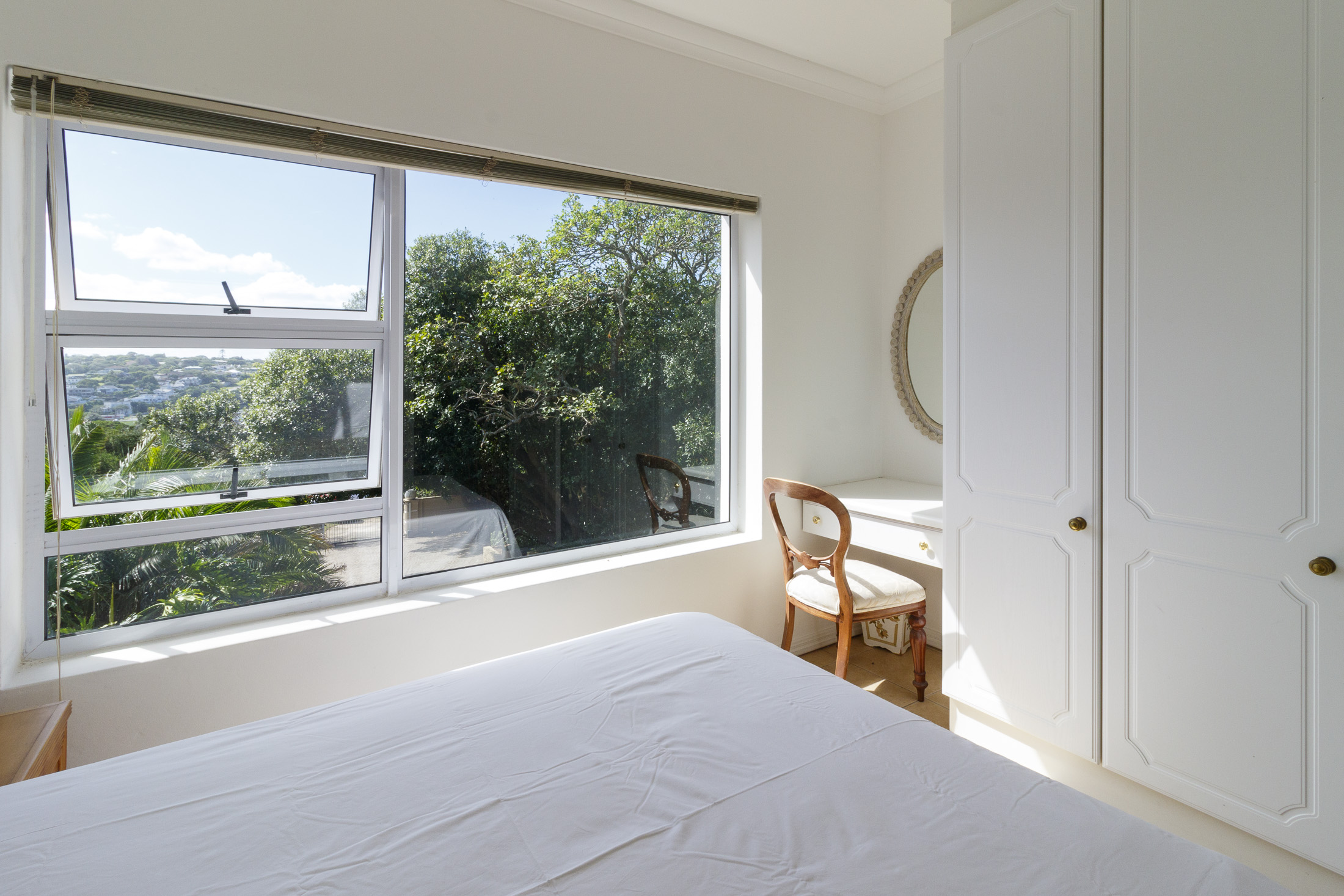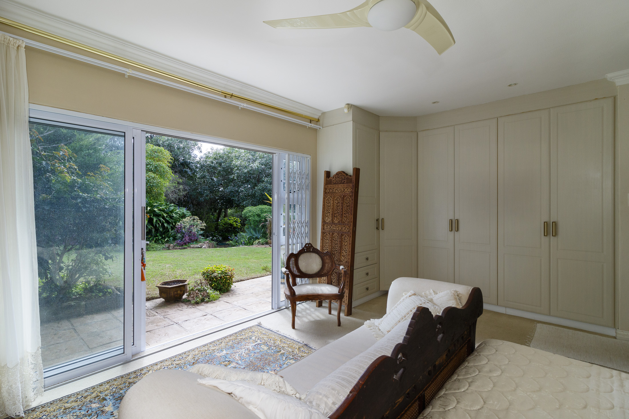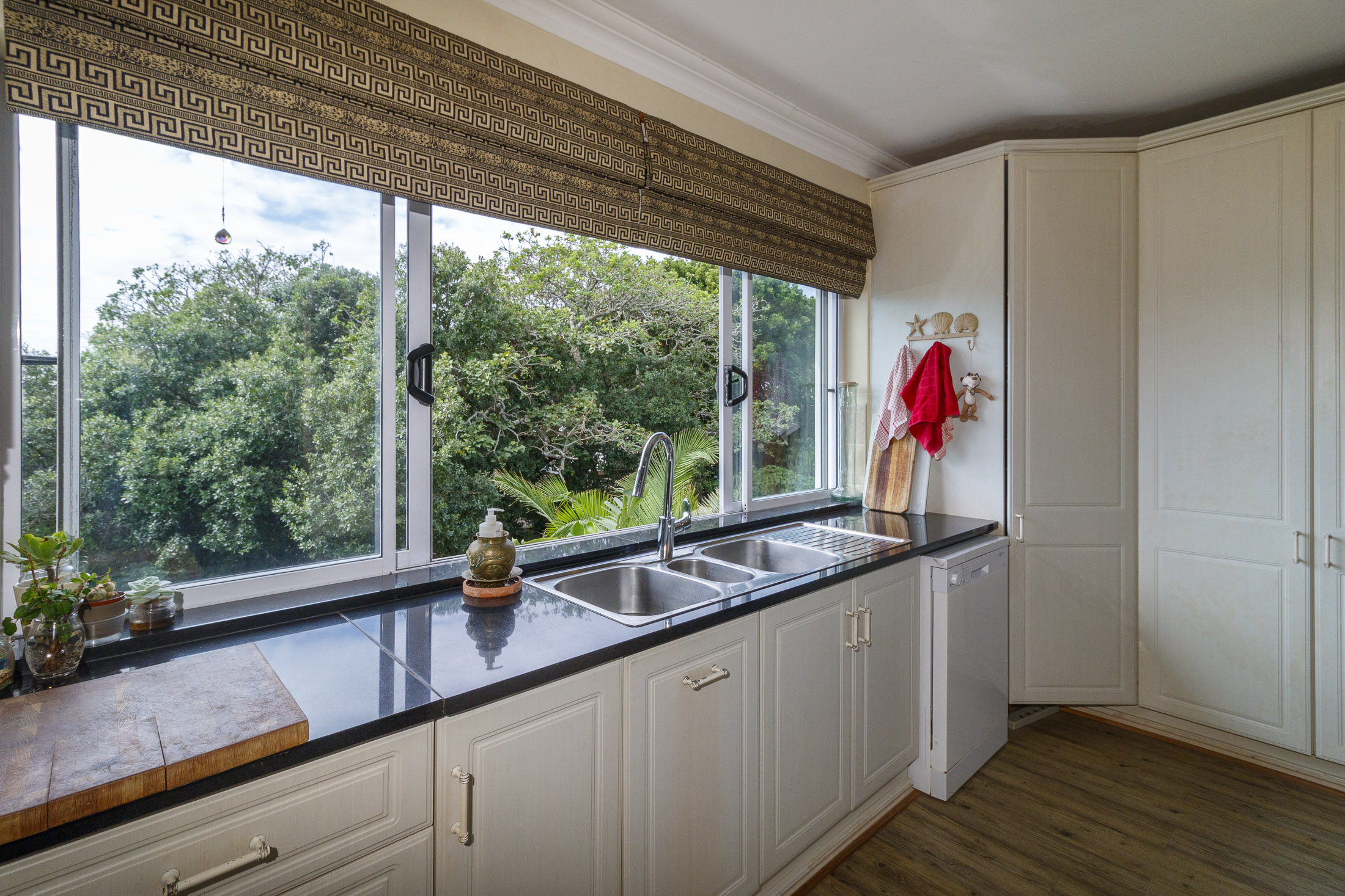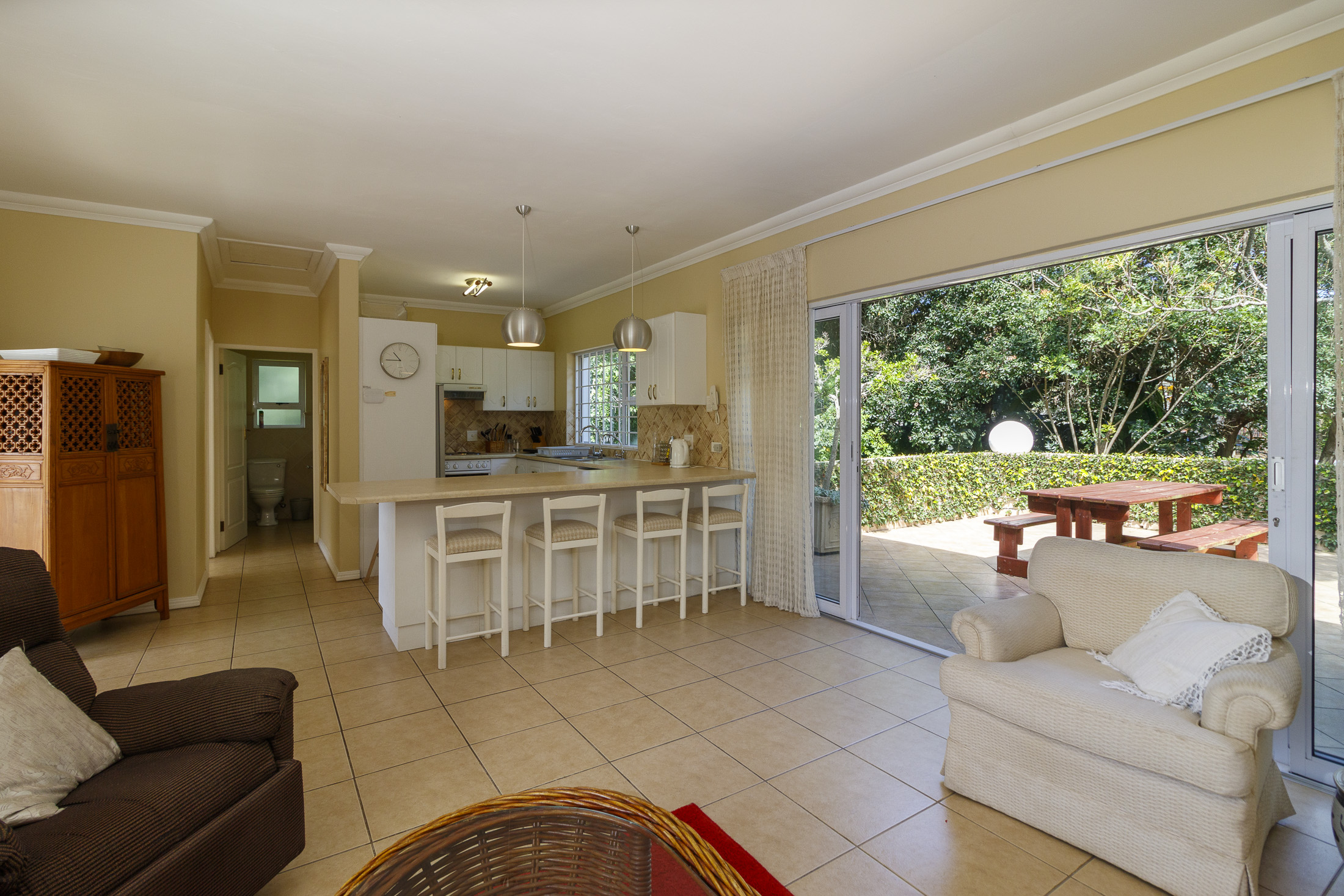 Embark on a serene journey into this cul-de-sac, where tranquility awaits. Nestled within, a beautiful home is surrounded by an exquisite, landscaped garden, creating a peaceful haven. Approach the property via an automated gate that opens to a delightful garden and a paved driveway with ample parking. Ascend the stairs to the front door, where a welcoming entrance foyer leads to the spacious lounge, dining room, and kitchen. The seamless open-plan design effortlessly integrates the dining room with a sheltered patio and garden. On one side, the lounge extends via stack doors to a north-facing garden, while on the other, folding stack doors give way to a partially covered, east-facing patio with a built-in gas braai, offering versatility and comfort. Here, you can sit outdoors, enjoying attractive views over the marina and surrounding tree tops. The modern, well-appointed kitchen boasts granite countertops and features sliding windows that open onto the patio. Additional features in the kitchen include an undercounter oven, both gas and electric hobs, an extractor, and a scullery concealed from sight. The master bedroom is carpeted, with an entire wall of cupboards and a full en suite bathroom. Bi-folding doors frame garden views and give access to the well-manicured garden, complete with a stunning water feature and private seating area. A second bedroom on the same level has its own en suite bathroom and opens via sliding doors to the garden. For those who need to work from home, a study situated just inside the front door affords a private workspace. The ground floor of this home has two separate en suite bedrooms, both with their own access from the garden. These two rooms are ideal for guests who require privacy, outside of the main house, where they can come and go without disturbing anyone upstairs. As you explore the property further, you'll find a charming self-contained flat with its own private patio and entrance, perfect for accommodating guests or generating rental income. This generously proportioned unit comprises an open-plan living room and kitchen, two bedrooms, and a full bathroom shared by both bedrooms. The expansive garden has so many interesting corners to explore, with pathways flanked by shrubs and groundcovers with much of the garden shaded by mature trees. Two garages with automated doors and a workshop provide secure parking for vehicles and a place to tinker, while a further two open garages afford additional undercover parking. An added advantage is a 40,000-litre underground rainwater reservoir, which is filtered and plumbed to the house. There are also several rainwater tanks with a total capacity of 25,000 litres for garden use. Complete with excellent security measures, this home provides both comfort and practicality.