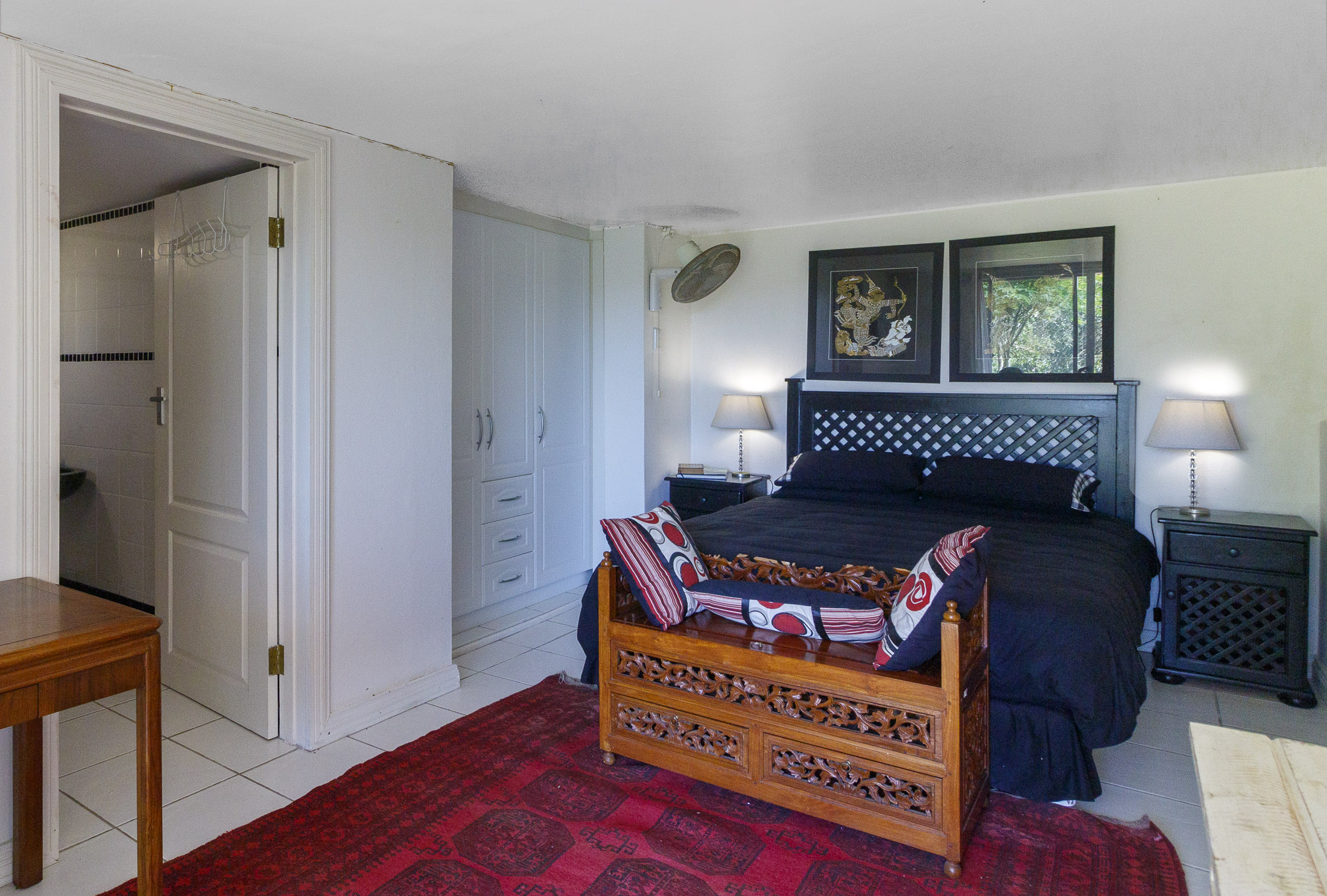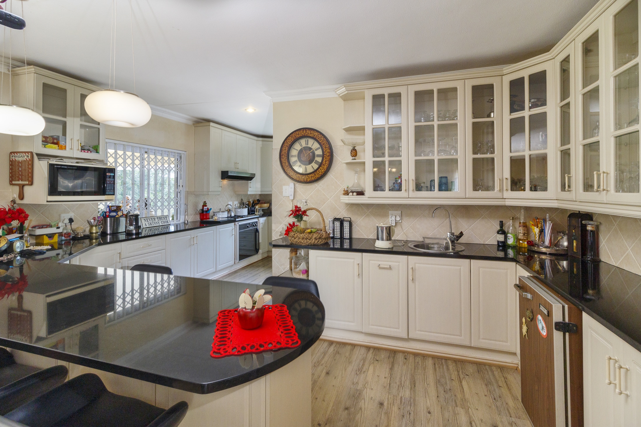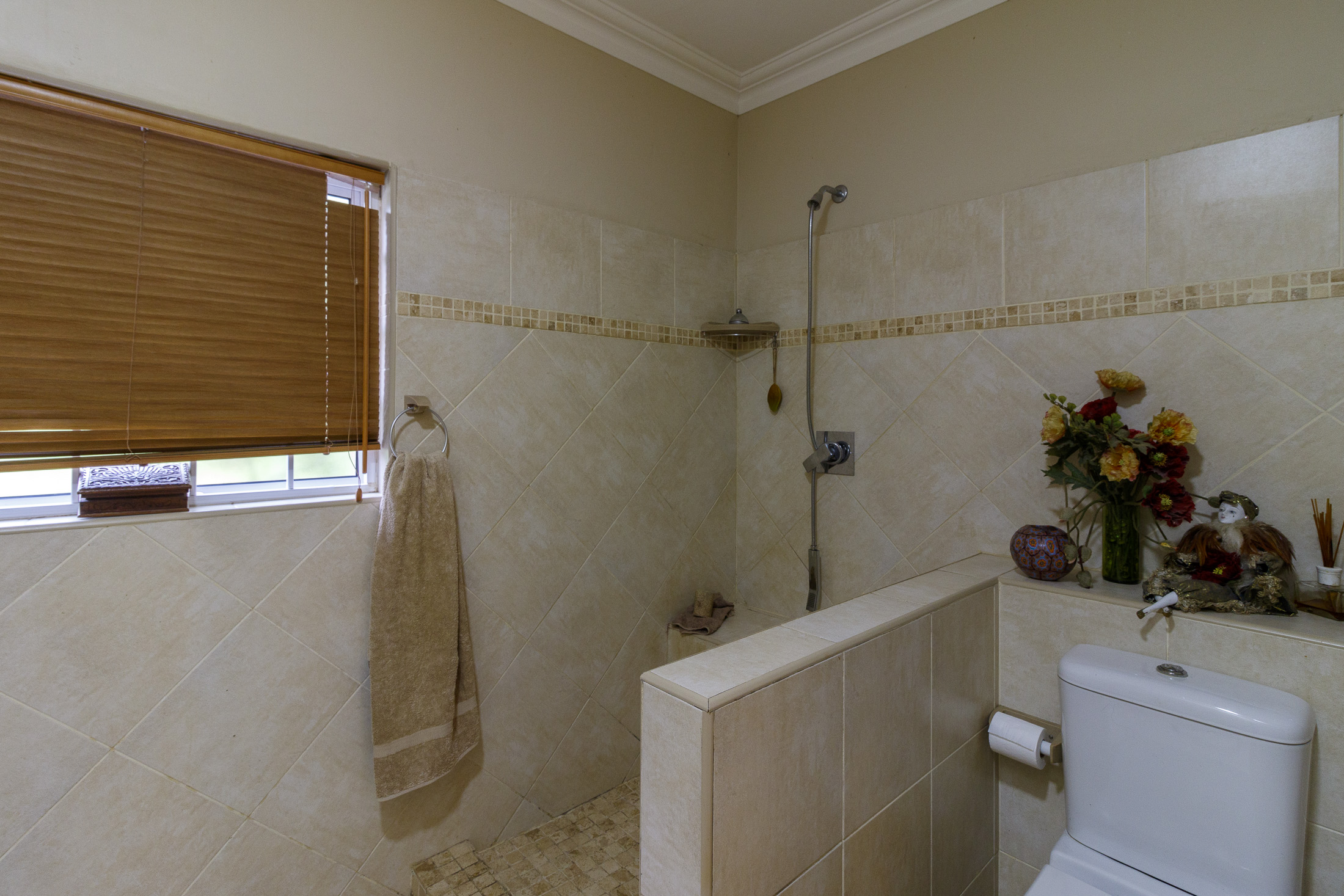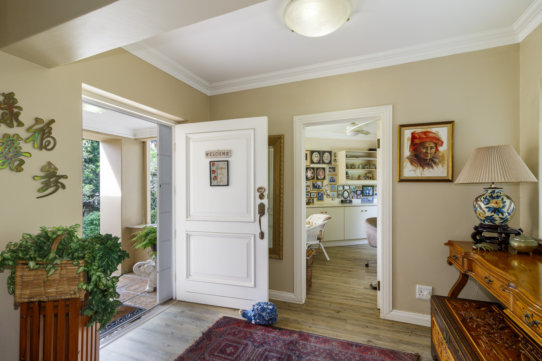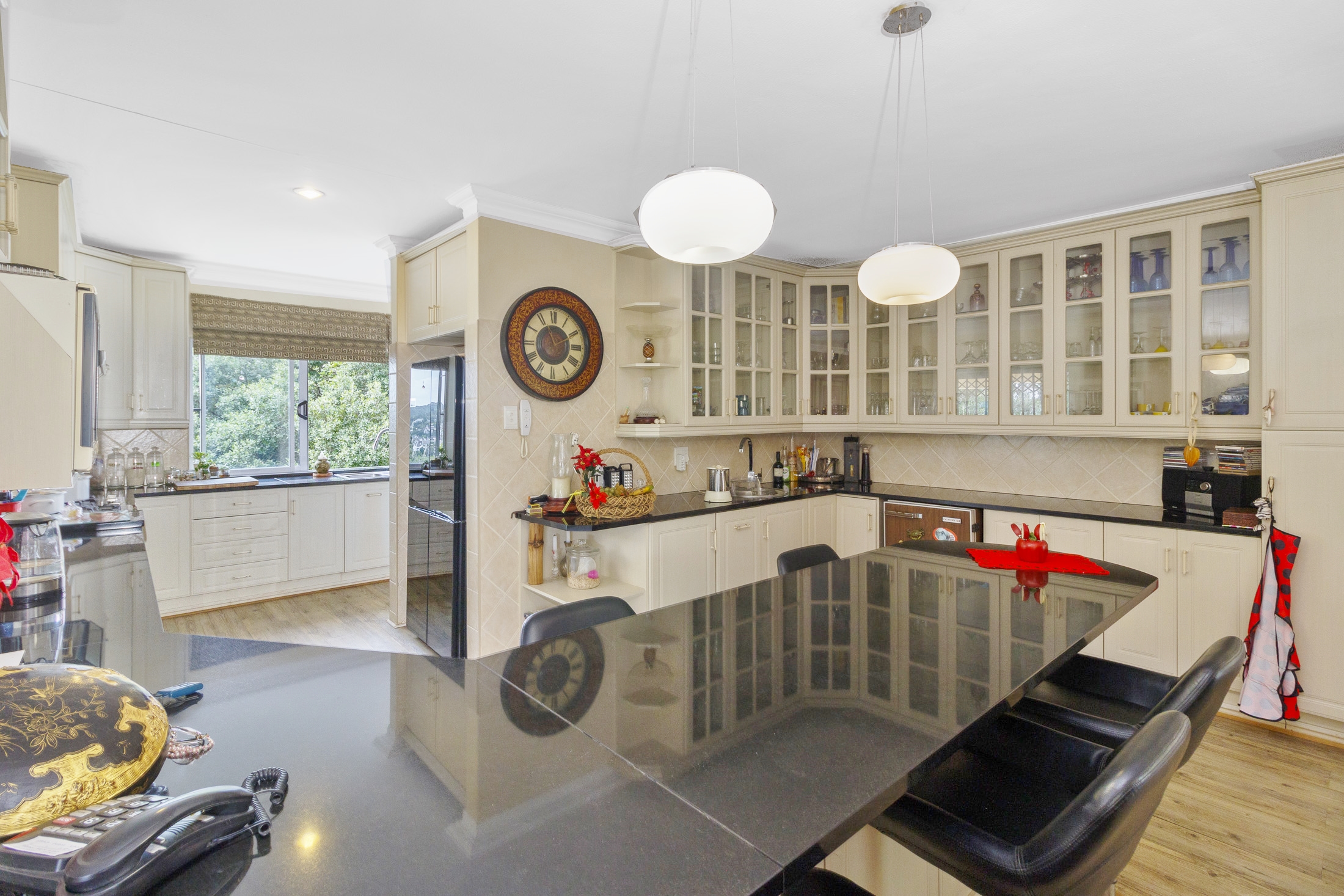 Embark on a serene journey into this cul-de-sac, where tranquility awaits. Nestled within, a beautiful home is surrounded by an exquisite, landscaped garden, creating a peaceful haven. Approach the property via an automated gate that opens to a delightful garden and a paved driveway with ample parking. Ascend the stairs to the front door, where a welcoming entrance foyer leads to the spacious lounge, dining room, and kitchen. The seamless open-plan design effortlessly integrates the dining room with a sheltered patio and garden. On one side, the lounge extends via stack doors to a north-facing garden, while on the other, folding stack doors give way to a partially covered, east-facing patio with a built-in gas braai, offering versatility and comfort. Here, you can sit outdoors, enjoying attractive views over the marina and surrounding tree tops. The modern, well-appointed kitchen boasts granite countertops and features sliding windows that open onto the patio. Additional features in the kitchen include an undercounter oven, both gas and electric hobs, an extractor, and a scullery concealed from sight. The master bedroom is carpeted, with an entire wall of cupboards and a full en suite bathroom. Bi-folding doors frame garden views and give access to the well-manicured garden, complete with a stunning water feature and private seating area. A second bedroom on the same level has its own en suite bathroom and opens via sliding doors to the garden. For those who need to work from home, a study situated just inside the front door affords a private workspace. The ground floor of this home has two separate en suite bedrooms, both with their own access from the garden. These two rooms are ideal for guests who require privacy, outside of the main house, where they can come and go without disturbing anyone upstairs. As you explore the property further, you'll find a charming self-contained flat with its own private patio and entrance, perfect for accommodating guests or generating rental income. This generously proportioned unit comprises an open-plan living room and kitchen, two bedrooms, and a full bathroom shared by both bedrooms. The expansive garden has so many interesting corners to explore, with pathways flanked by shrubs and groundcovers with much of the garden shaded by mature trees. Two garages with automated doors and a workshop provide secure parking for vehicles and a place to tinker, while a further two open garages afford additional undercover parking. An added advantage is a 40,000-litre underground rainwater reservoir, which is filtered and plumbed to the house. There are also several rainwater tanks with a total capacity of 25,000 litres for garden use. Complete with excellent security measures, this home provides both comfort and practicality.