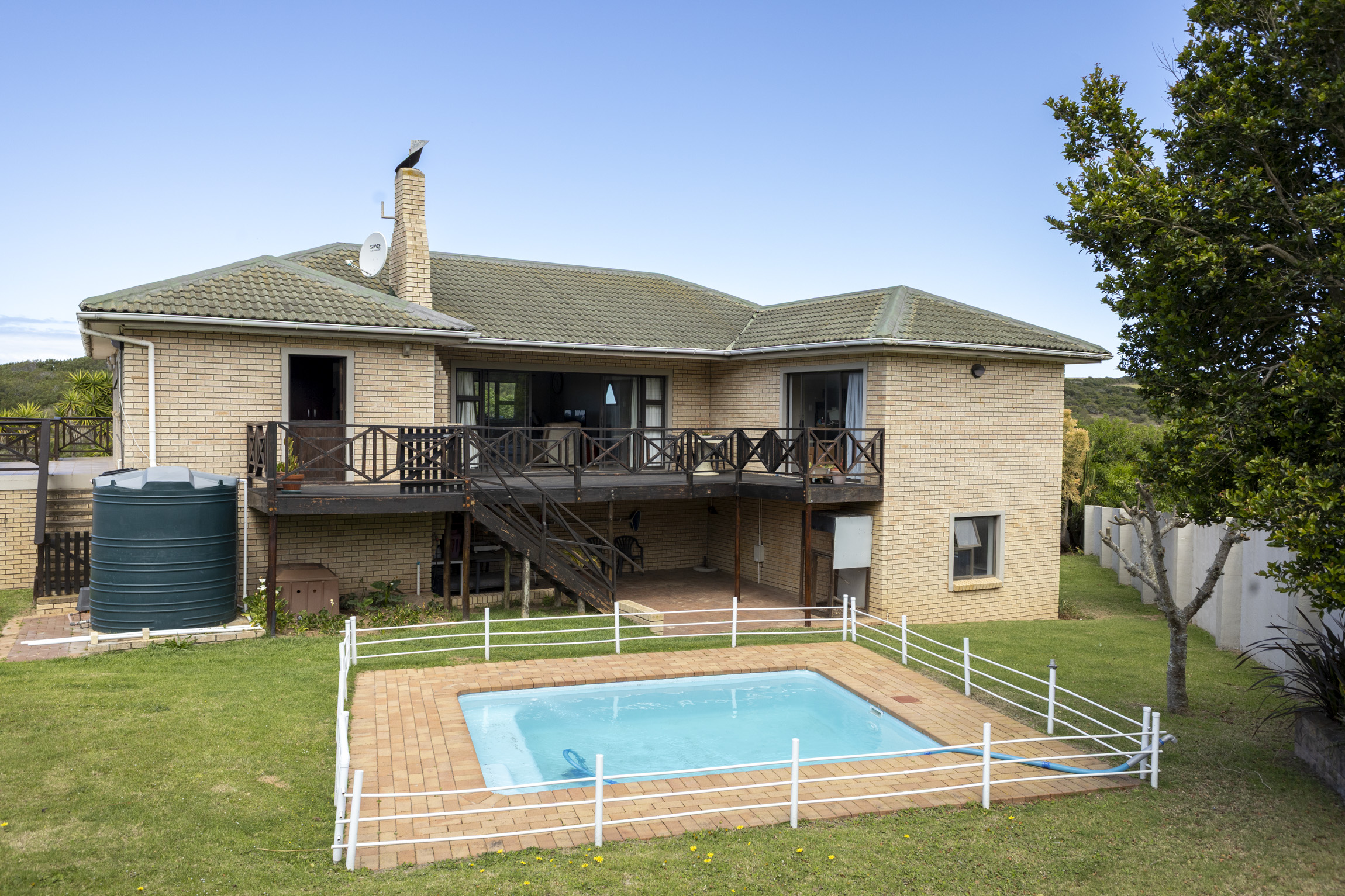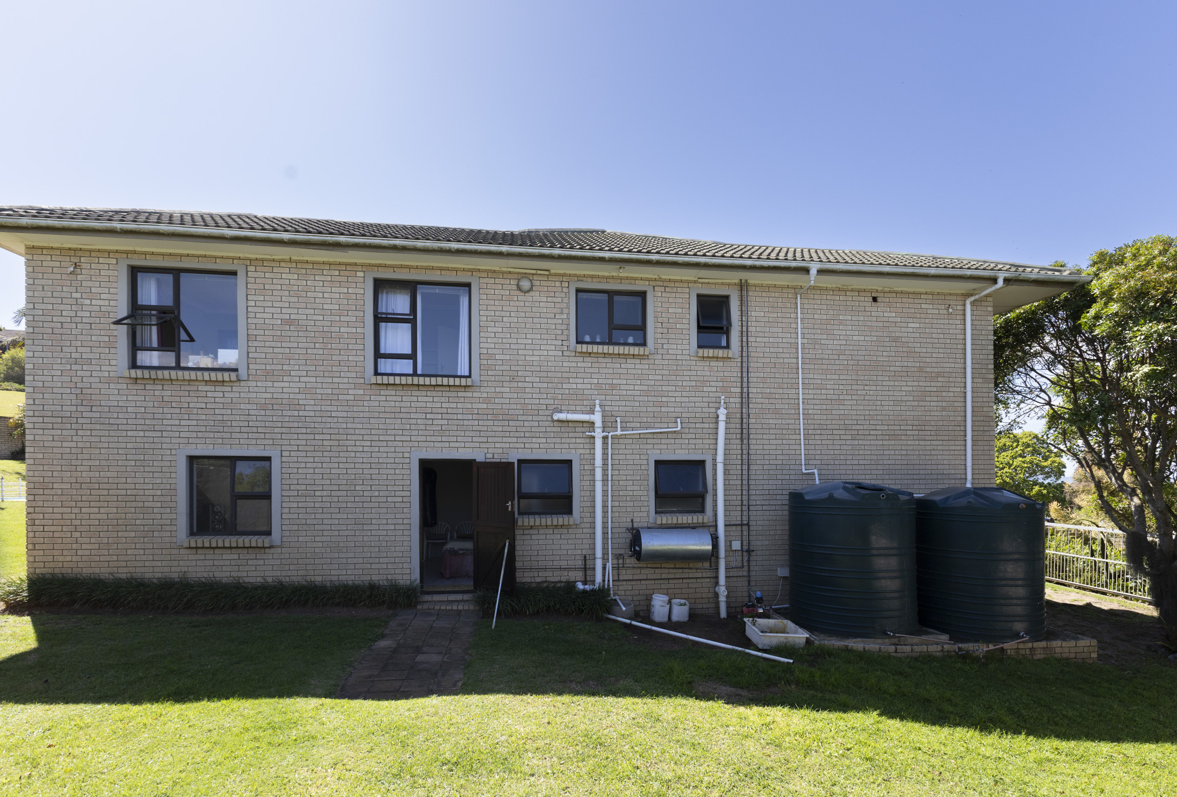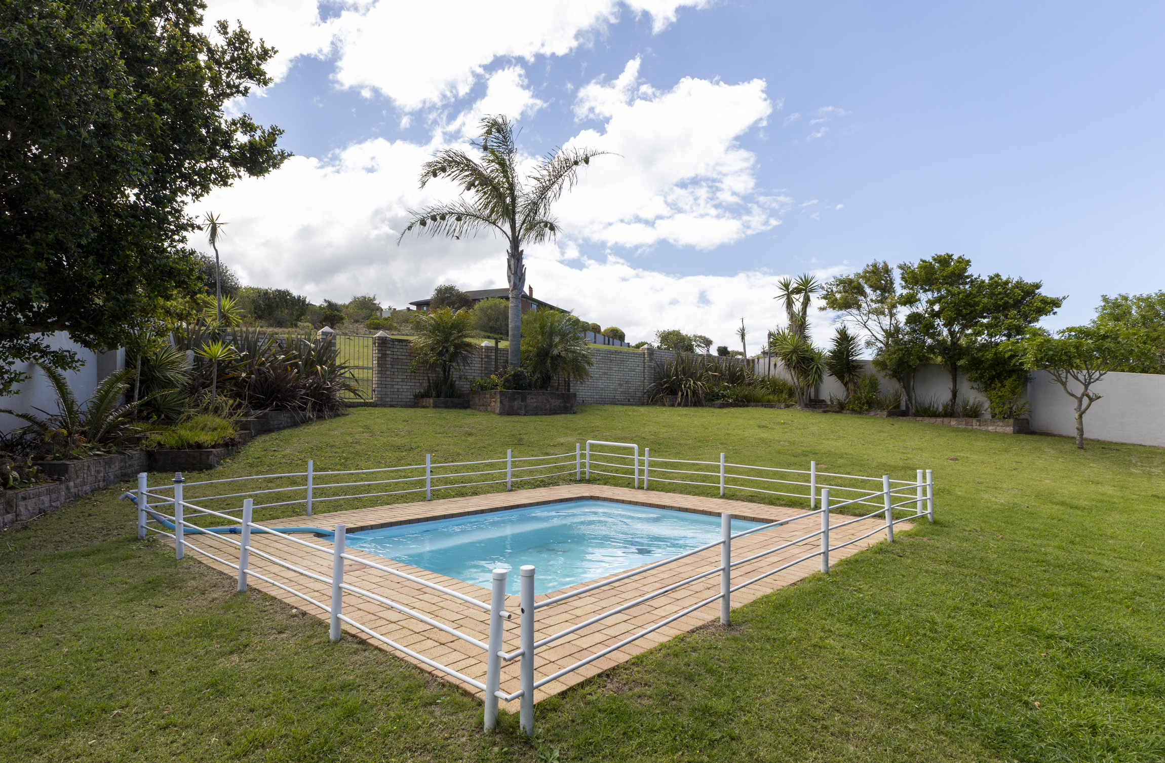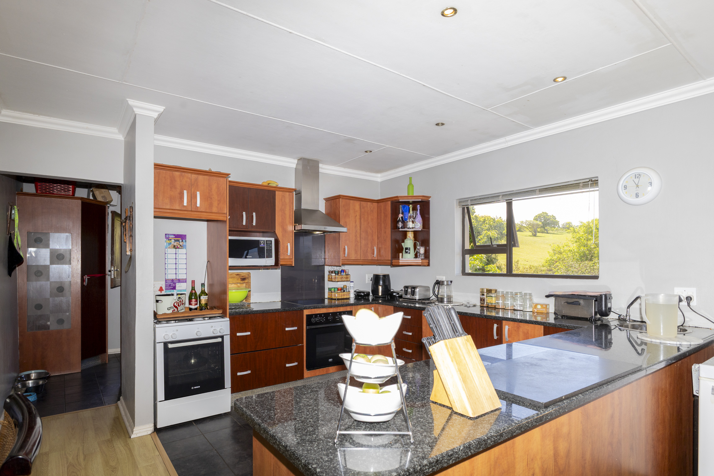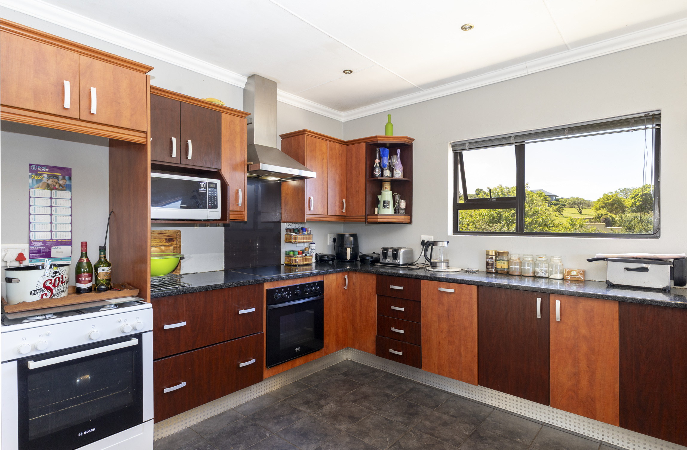Situated within the secure Umdoni Downs estate in Port Alfred, this four-bedroom facebrick home offers a delightful blend of distant sea views and rolling countryside scenery. Its rural charm is perfectly balanced with the convenience of nearby amenities. Upon entering through the staircase entrance foyer, you'll be welcomed into a light-filled open-plan living area. The lounge seamlessly extends to two patios—one on the west, providing ocean vistas, and the other to the east, where a built-in braai invites alfresco dining. The well-appointed kitchen, finished in rich cherrywood-toned melamine and complemented by sleek granite countertops, is ideal for both everyday meals and entertaining. The master bedroom, featuring an en suite bathroom that spans one side of the room, offers privacy and comfort. Two additional family bedrooms on this level share a well-designed bathroom. On the lower level, a fourth bedroom, also en suite, ensures flexible accommodation options. A double garage provides secure parking for two vehicles, while storage space, comprising two interleading rooms, adds a versatile space, complete with a bathroom. This space is currently used as a storeroom/workshop, but could be a single storeroom and domestic quarters if required. The outdoor space is equally inviting, with a sparkling swimming pool offering a tranquil retreat in the back garden. A gate leads directly to the communal park, adding to the charm of this serene estate. Practical features such as backup rainwater, an alarm system, and an automated entrance gate ensure peace of mind for residents.