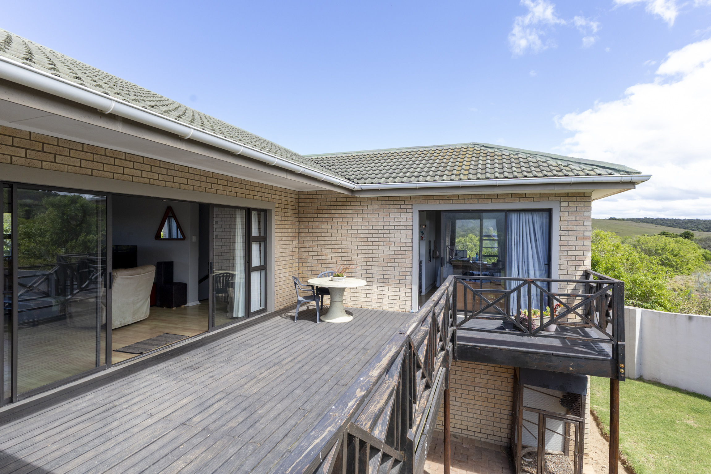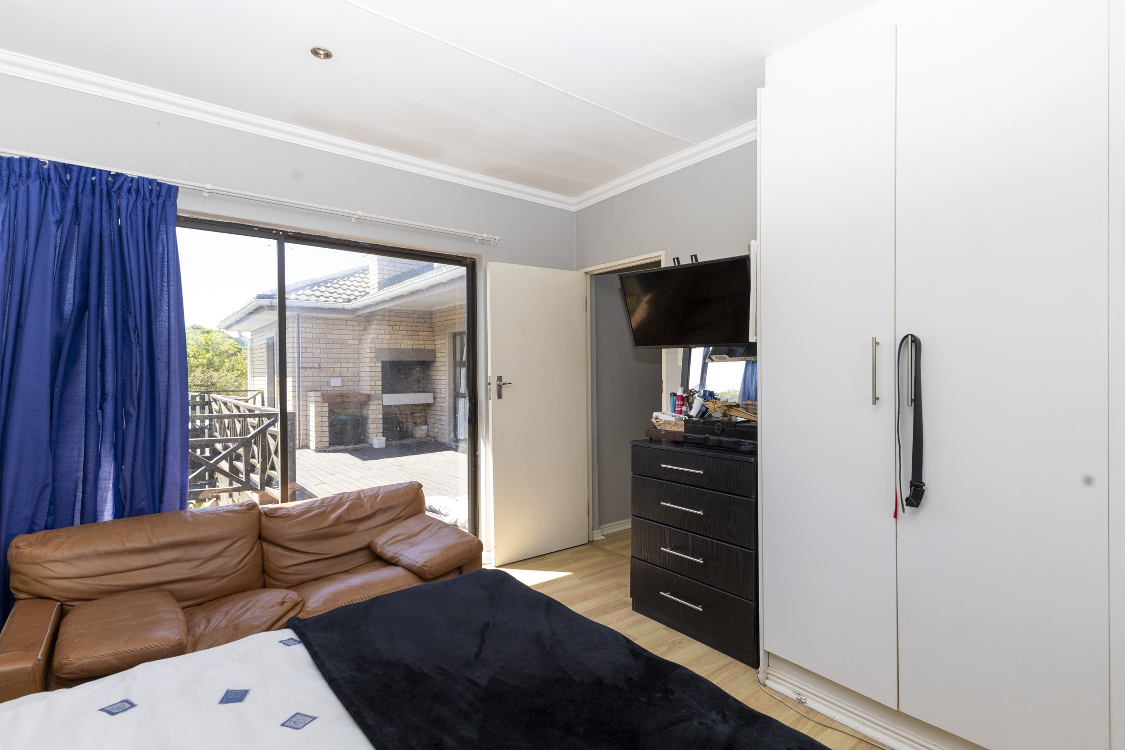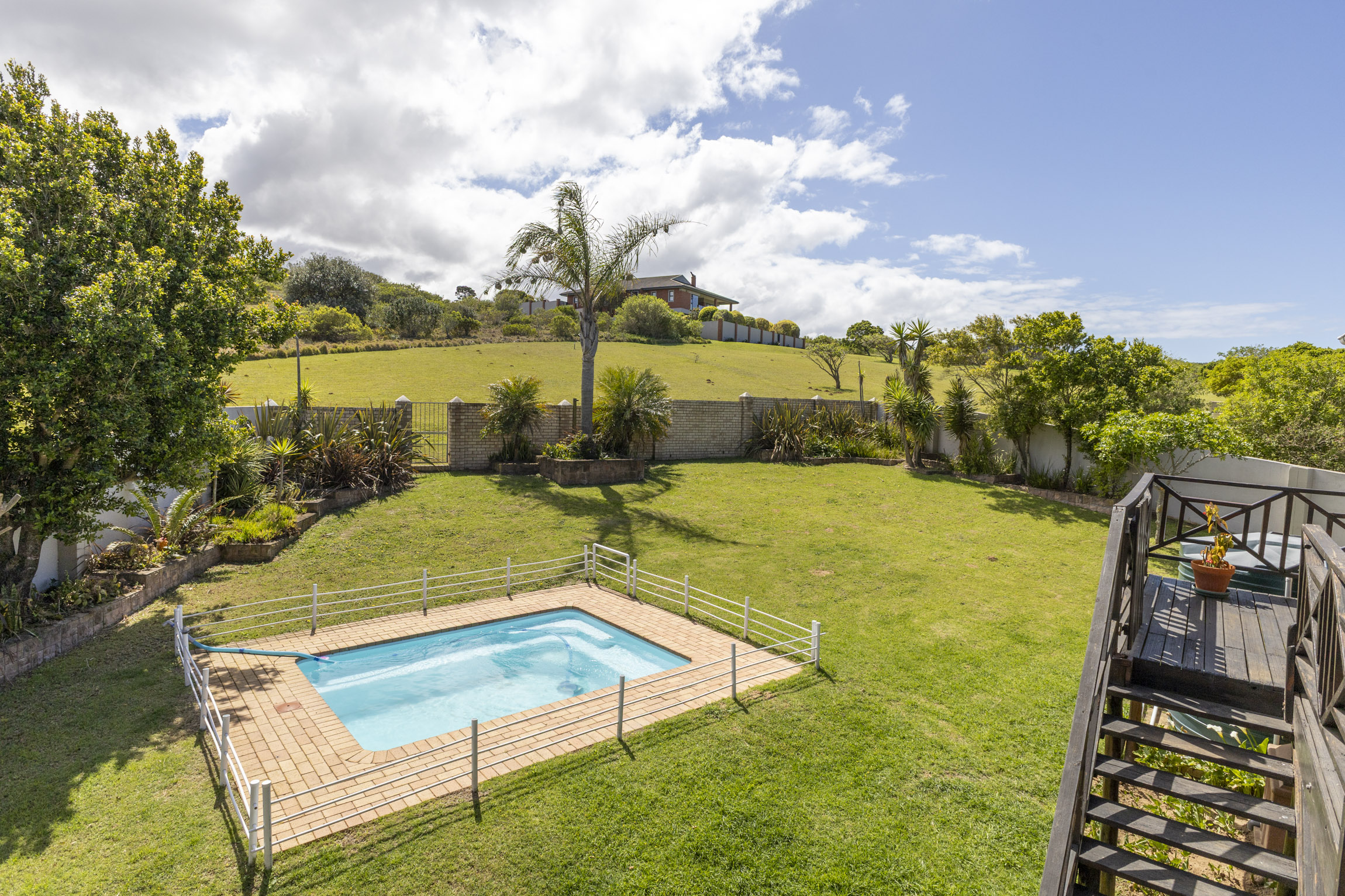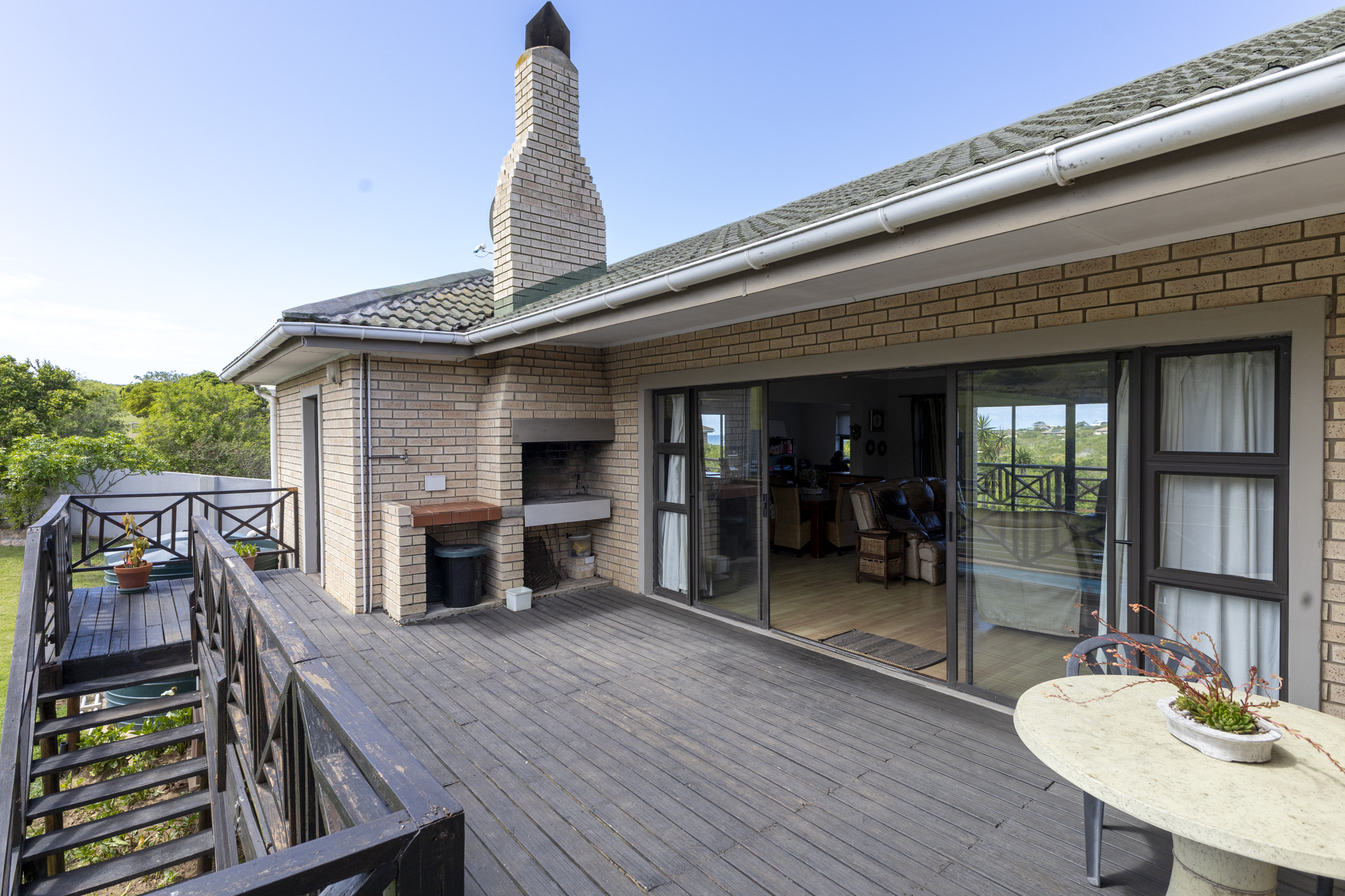 Situated within the secure Umdoni Downs estate in Port Alfred, this four-bedroom facebrick home offers a delightful blend of distant sea views and rolling countryside scenery. Its rural charm is perfectly balanced with the convenience of nearby amenities. Upon entering through the staircase entrance foyer, you'll be welcomed into a light-filled open-plan living area. The lounge seamlessly extends to two patios—one on the west, providing ocean vistas, and the other to the east, where a built-in braai invites alfresco dining. The well-appointed kitchen, finished in rich cherrywood-toned melamine and complemented by sleek granite countertops, is ideal for both everyday meals and entertaining. The master bedroom, featuring an en suite bathroom that spans one side of the room, offers privacy and comfort. Two additional family bedrooms on this level share a well-designed bathroom. On the lower level, a fourth bedroom, also en suite, ensures flexible accommodation options. A double garage provides secure parking for two vehicles, while storage space, comprising two interleading rooms, adds a versatile space, complete with a bathroom. This space is currently used as a storeroom/workshop, but could be a single storeroom and domestic quarters if required. The outdoor space is equally inviting, with a sparkling swimming pool offering a tranquil retreat in the back garden. A gate leads directly to the communal park, adding to the charm of this serene estate. Practical features such as backup rainwater, an alarm system, and an automated entrance gate ensure peace of mind for residents.