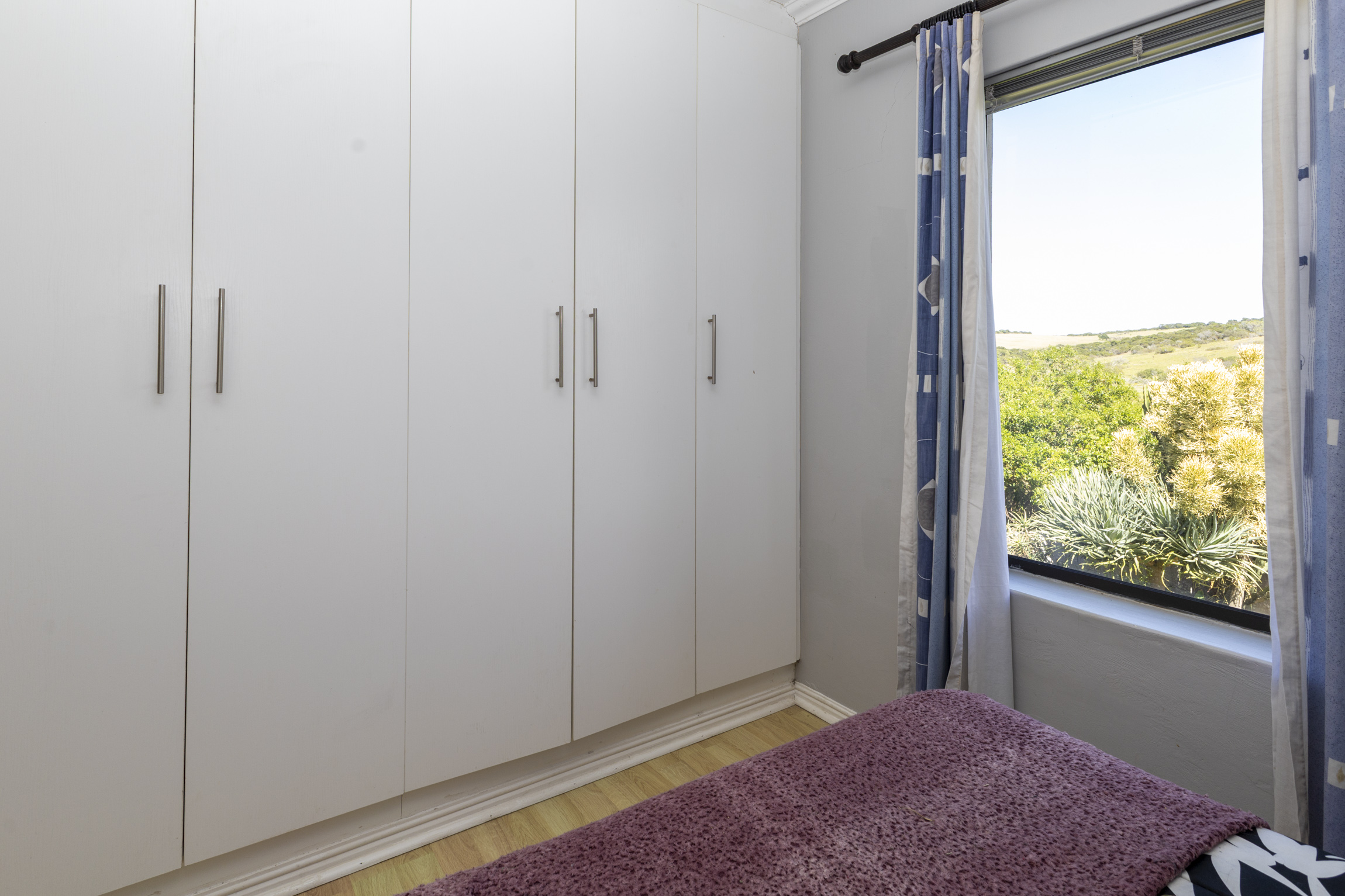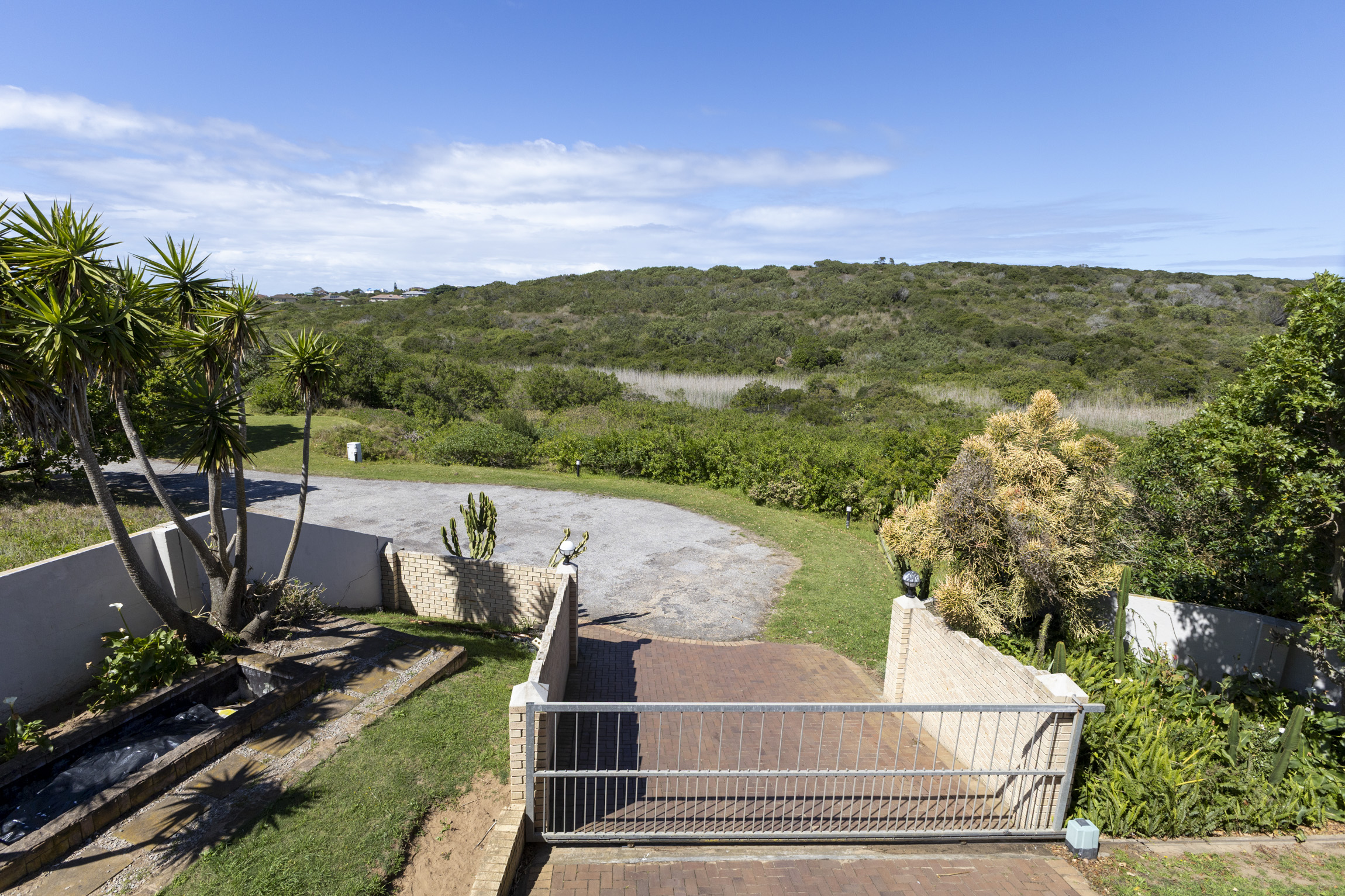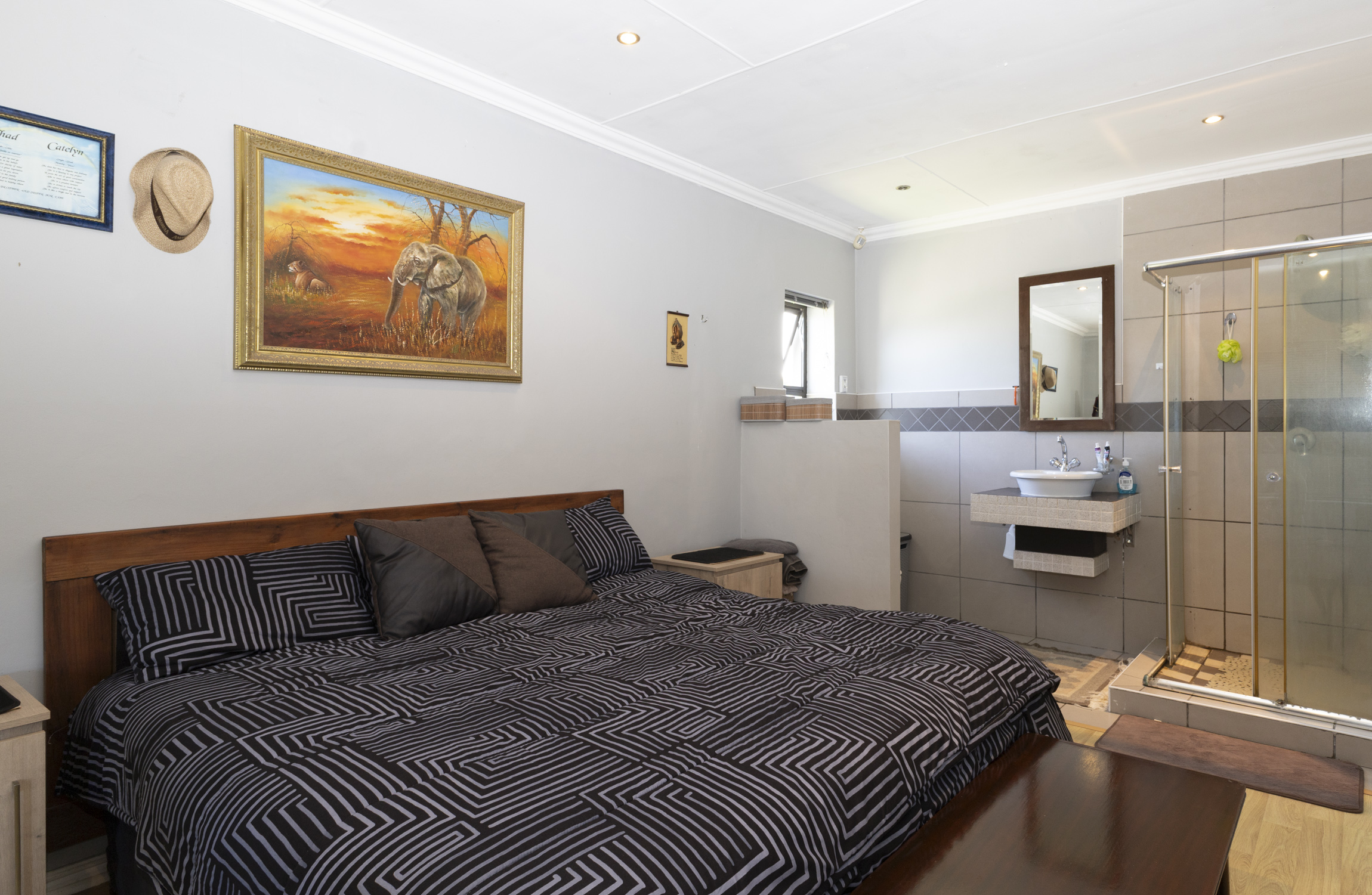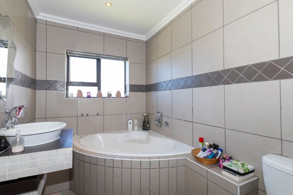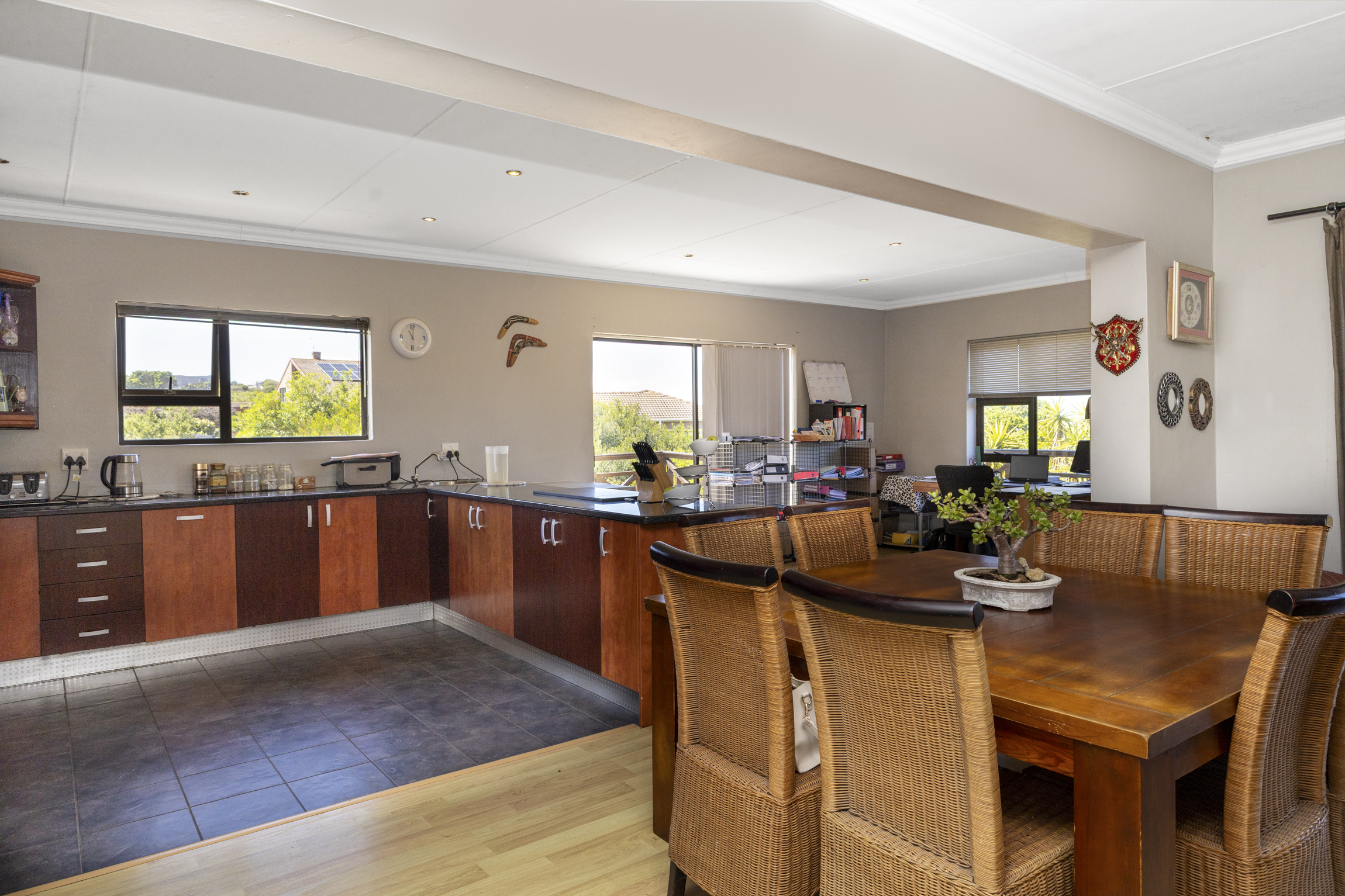 Situated within the secure Umdoni Downs estate in Port Alfred, this four-bedroom facebrick home offers a delightful blend of distant sea views and rolling countryside scenery. Its rural charm is perfectly balanced with the convenience of nearby amenities. Upon entering through the staircase entrance foyer, you'll be welcomed into a light-filled open-plan living area. The lounge seamlessly extends to two patios—one on the west, providing ocean vistas, and the other to the east, where a built-in braai invites alfresco dining. The well-appointed kitchen, finished in rich cherrywood-toned melamine and complemented by sleek granite countertops, is ideal for both everyday meals and entertaining. The master bedroom, featuring an en suite bathroom that spans one side of the room, offers privacy and comfort. Two additional family bedrooms on this level share a well-designed bathroom. On the lower level, a fourth bedroom, also en suite, ensures flexible accommodation options. A double garage provides secure parking for two vehicles, while storage space, comprising two interleading rooms, adds a versatile space, complete with a bathroom. This space is currently used as a storeroom/workshop, but could be a single storeroom and domestic quarters if required. The outdoor space is equally inviting, with a sparkling swimming pool offering a tranquil retreat in the back garden. A gate leads directly to the communal park, adding to the charm of this serene estate. Practical features such as backup rainwater, an alarm system, and an automated entrance gate ensure peace of mind for residents.