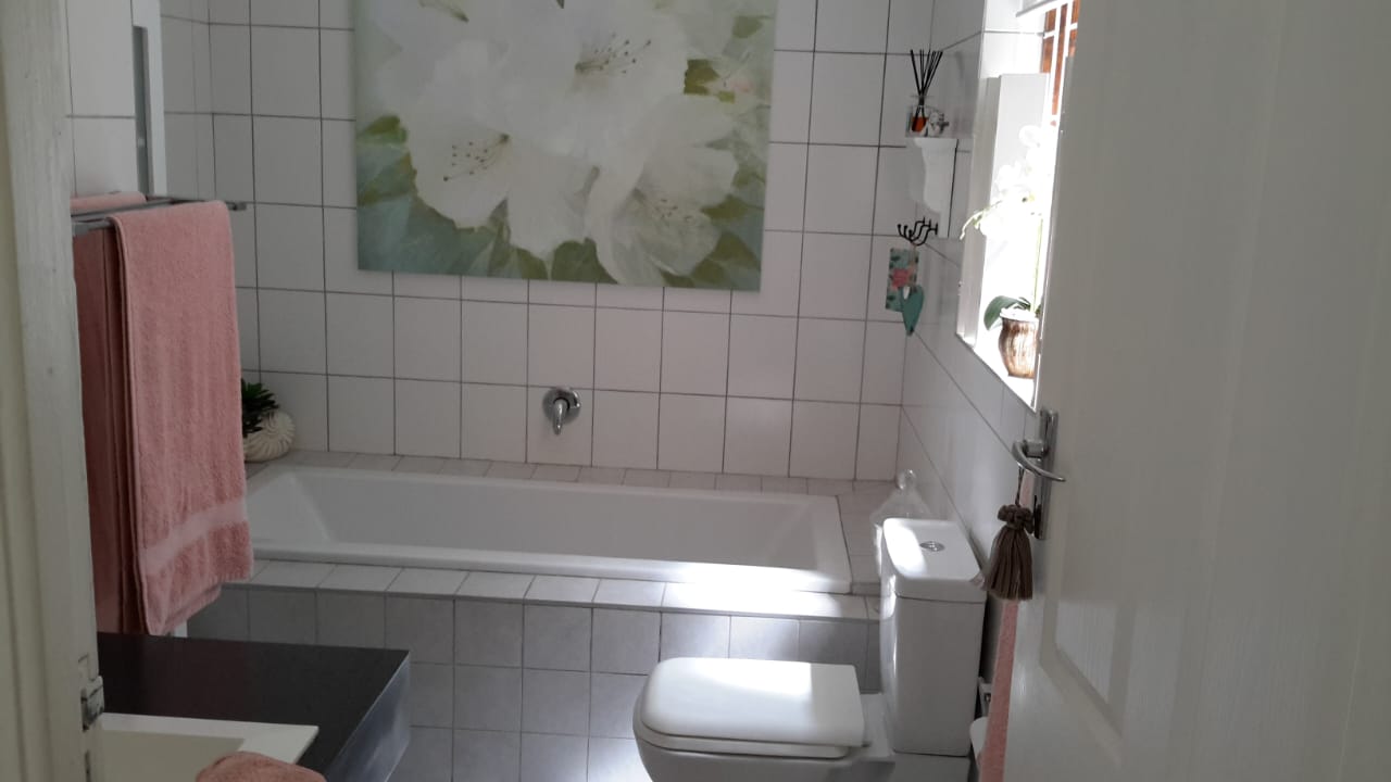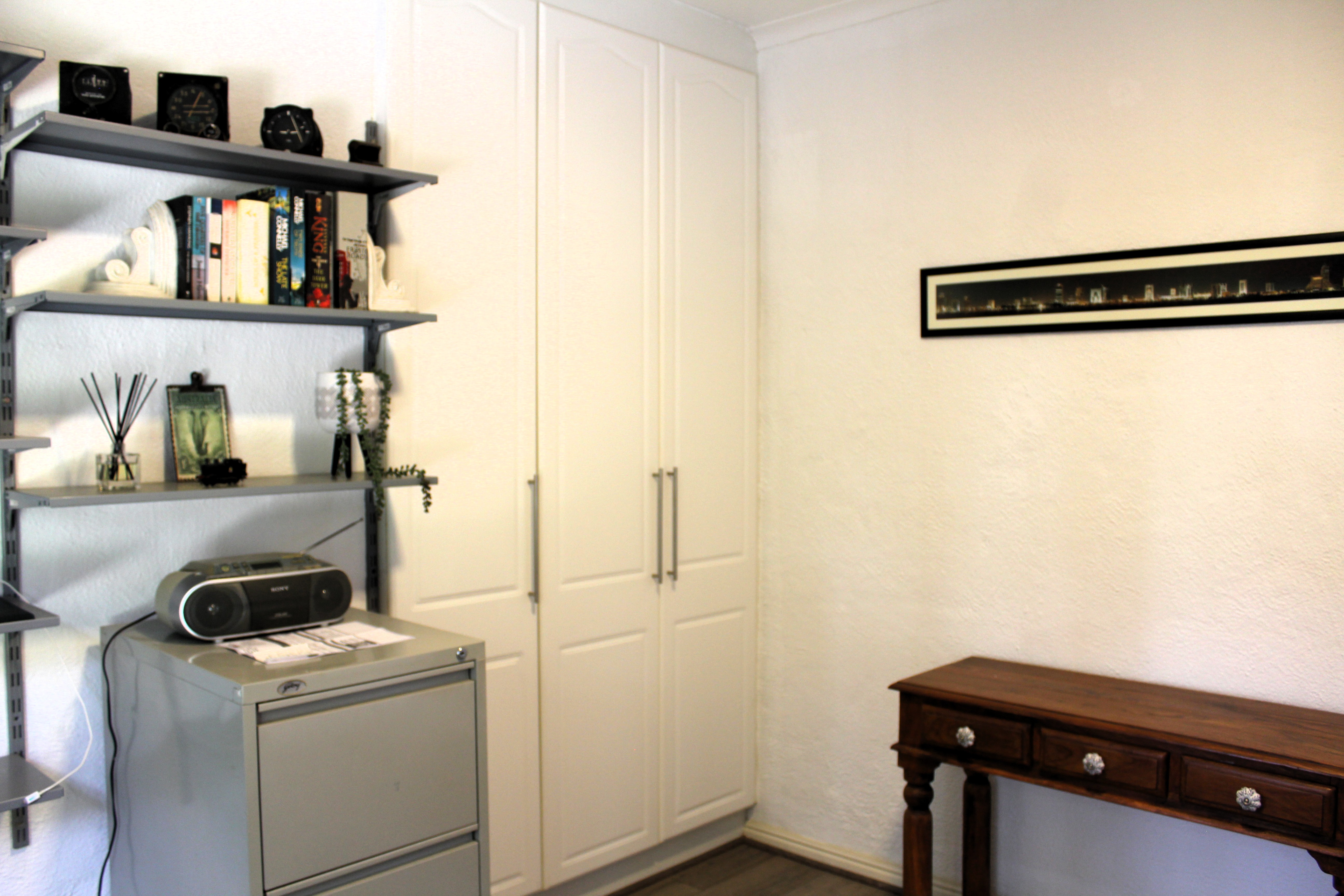 The generously sized main bedroom includes ample built in cupboards and direct access to the front garden, while the en-suite bathroom features a spacious bath for unwinding. Two additional guest bedrooms, both fitted with built in cupboards, provide comfortable accommodation for family or visitors. A guest bathroom with a shower adds further convenience.