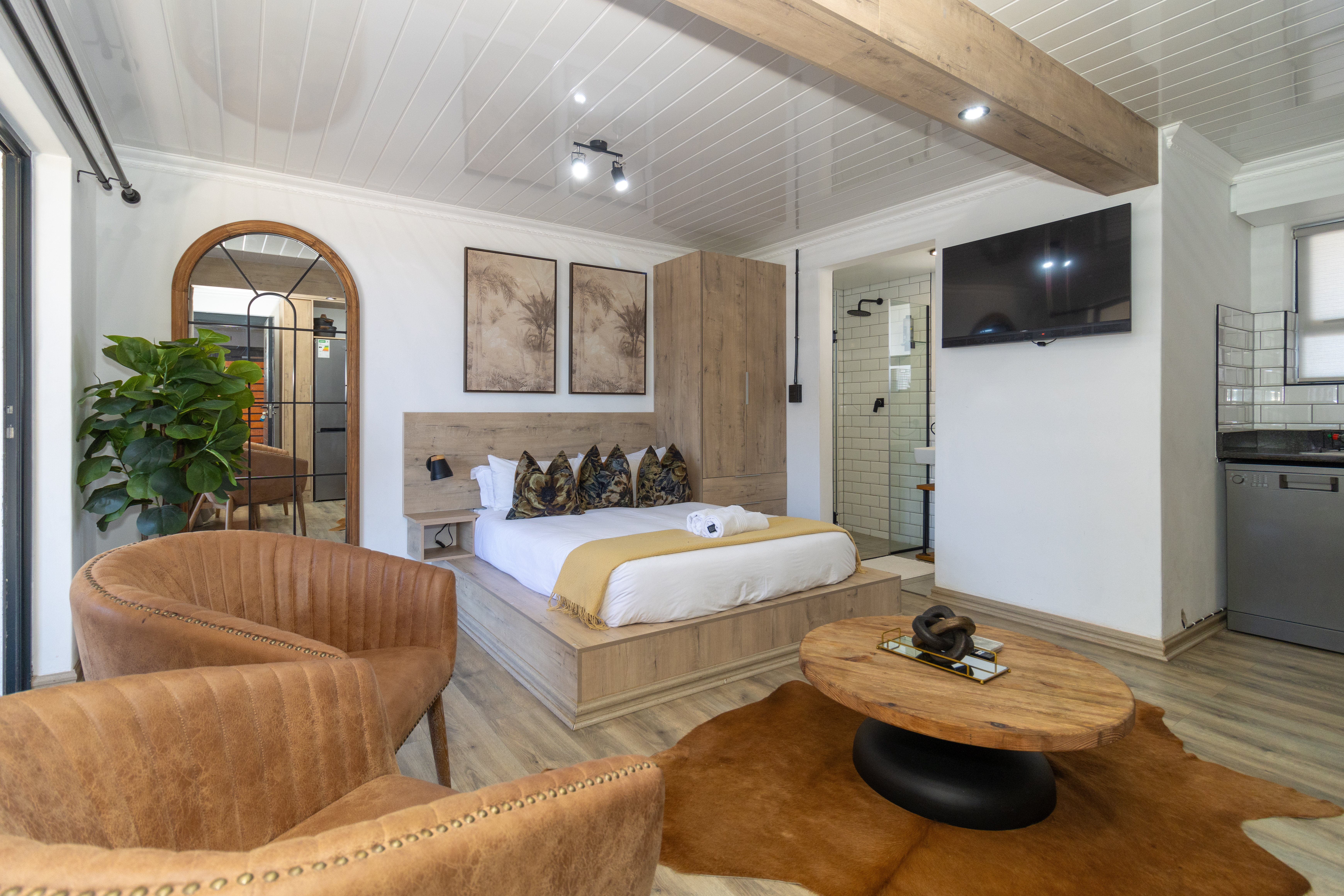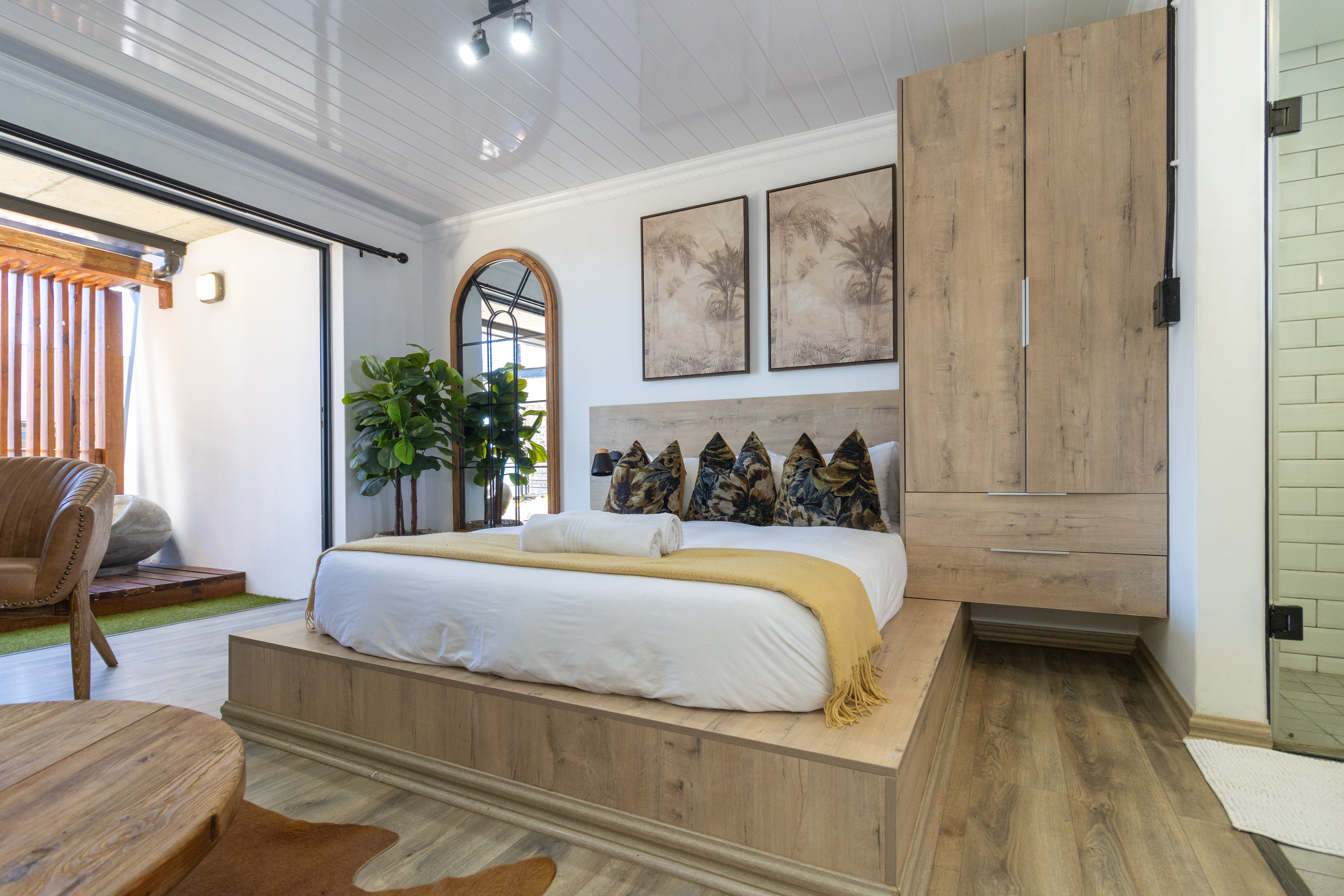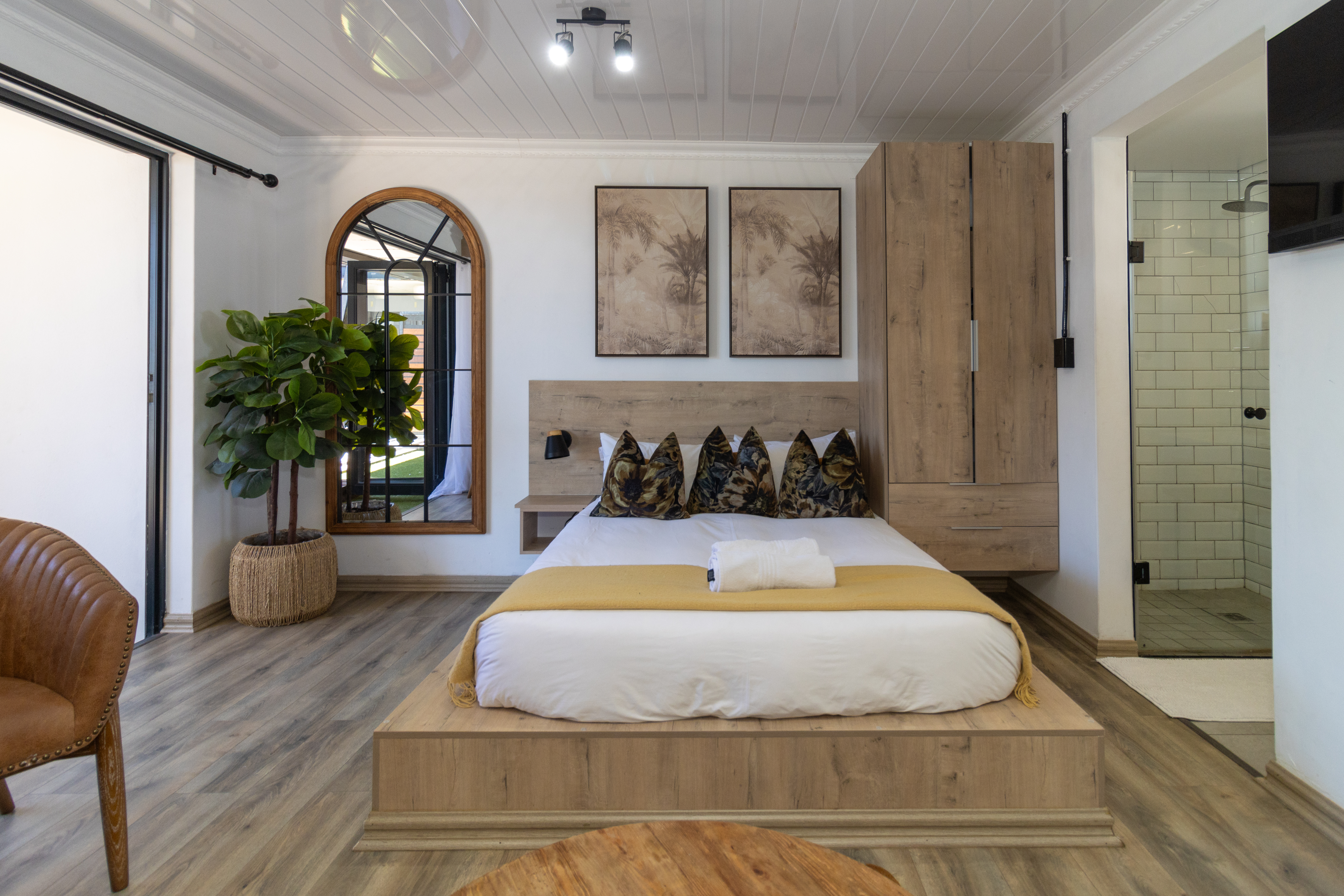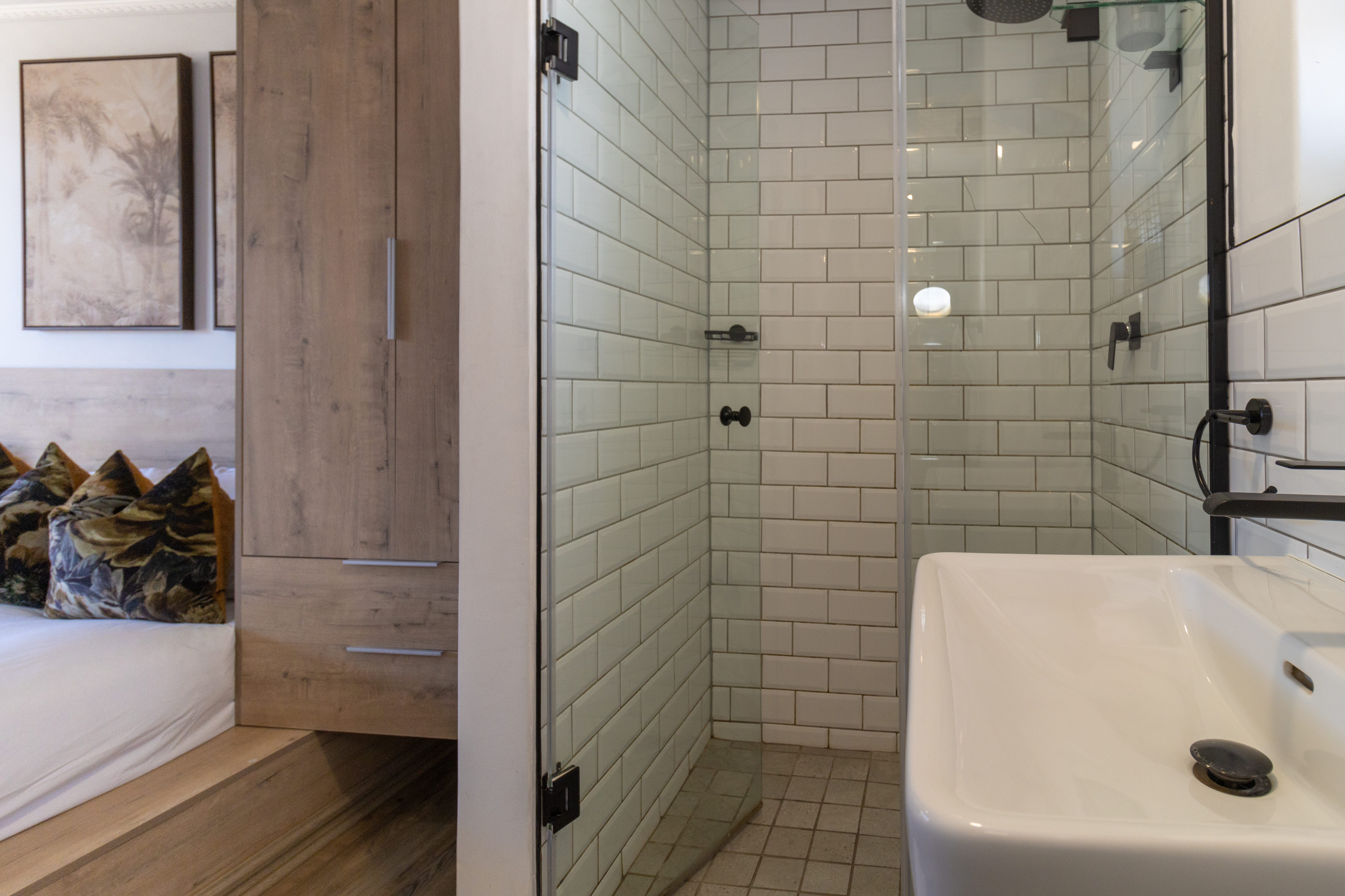 The sleeping area is tastefully appointed with built-in storage and elegant finishes, creating a calm and relaxing atmosphere. The modern bathroom complements the aesthetic beautifully, featuring a contemporary open-concept shower and clean, refined finishes.