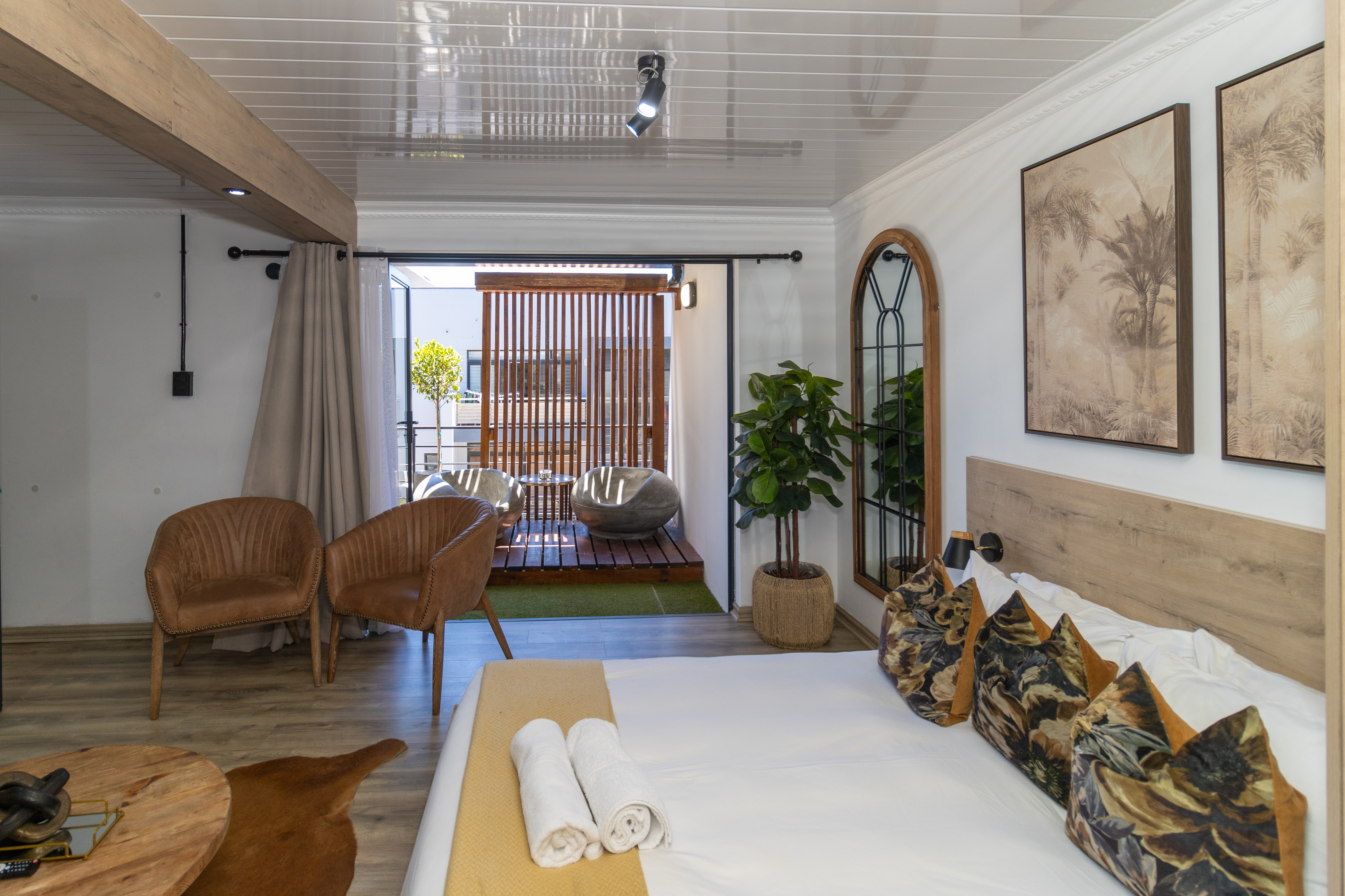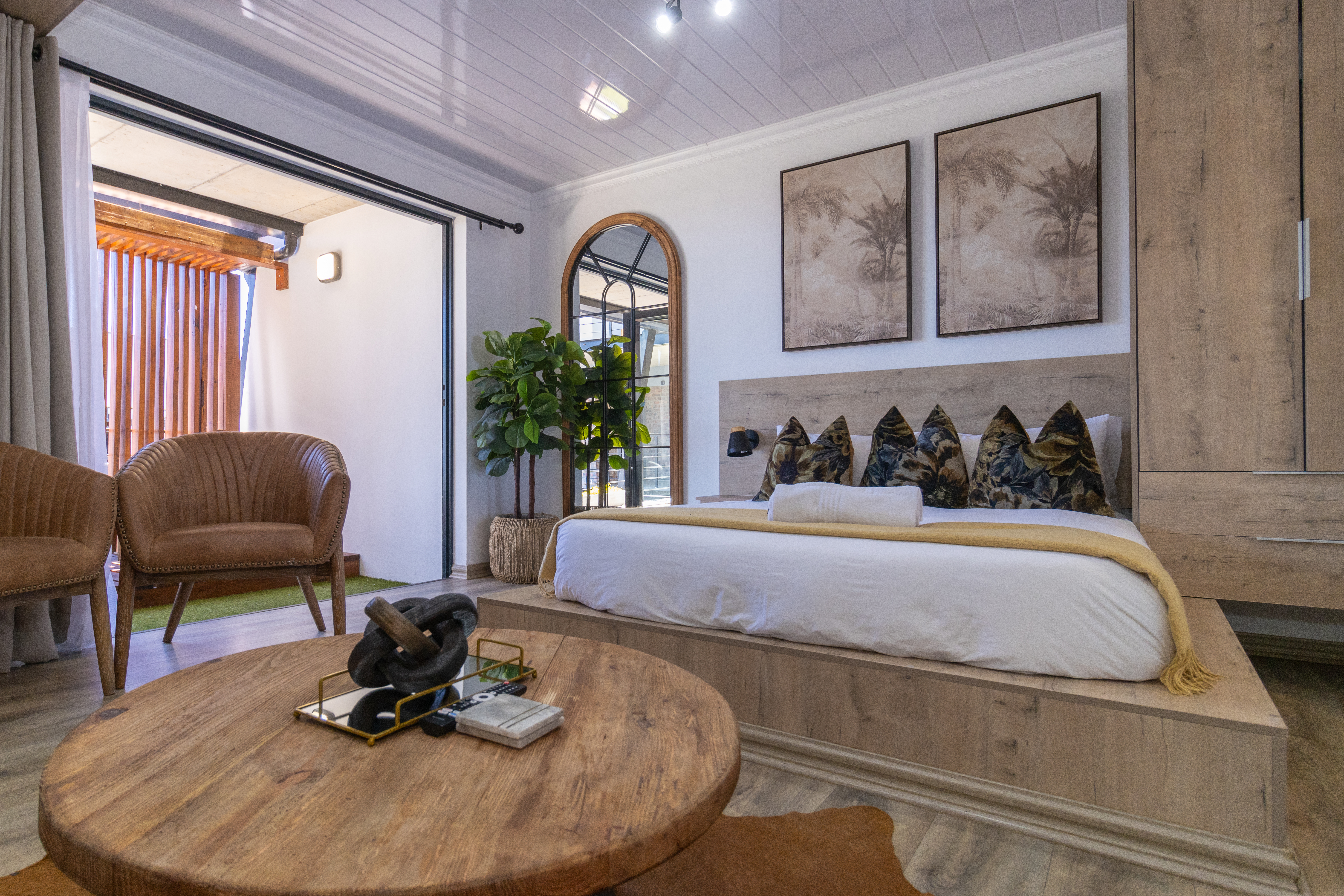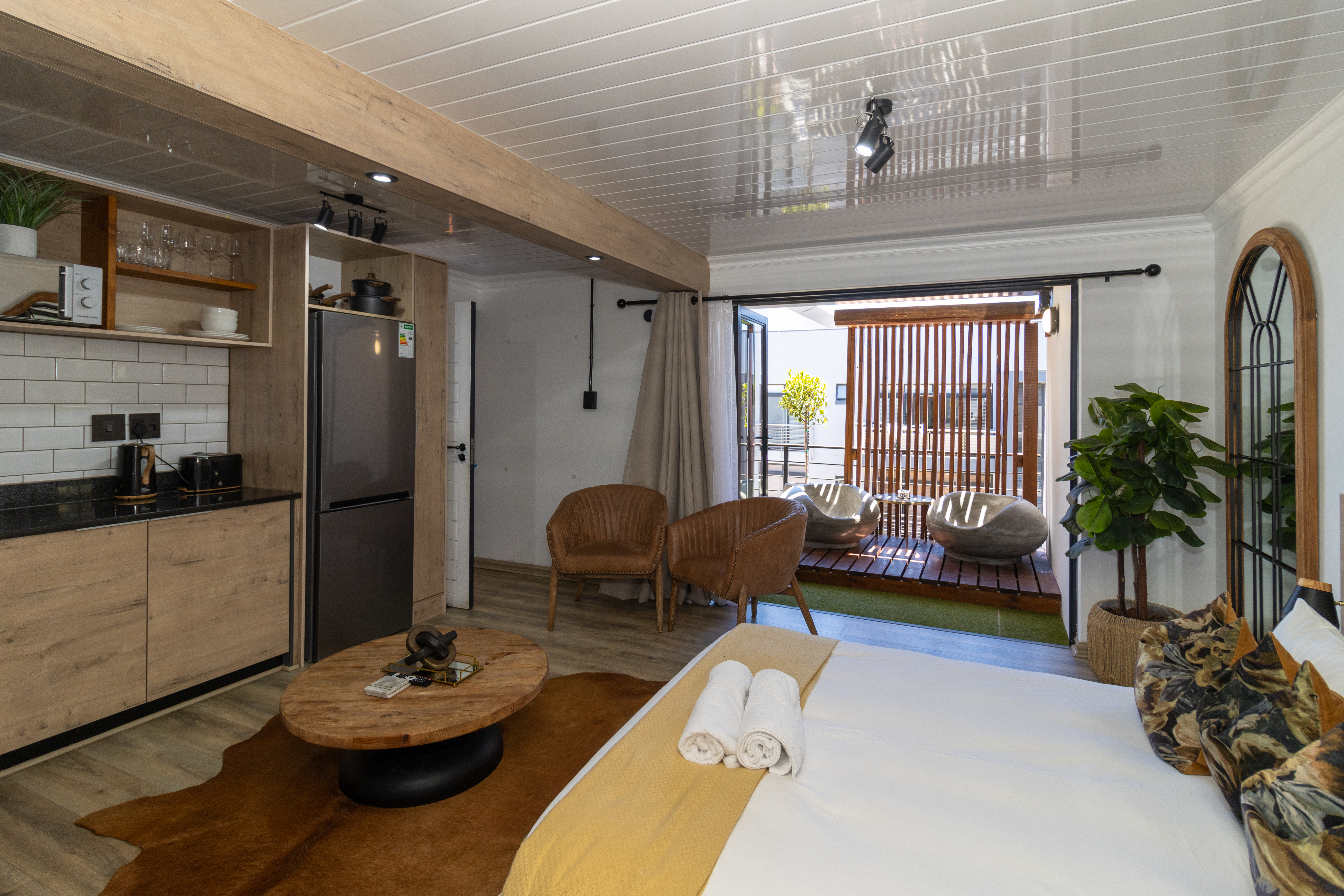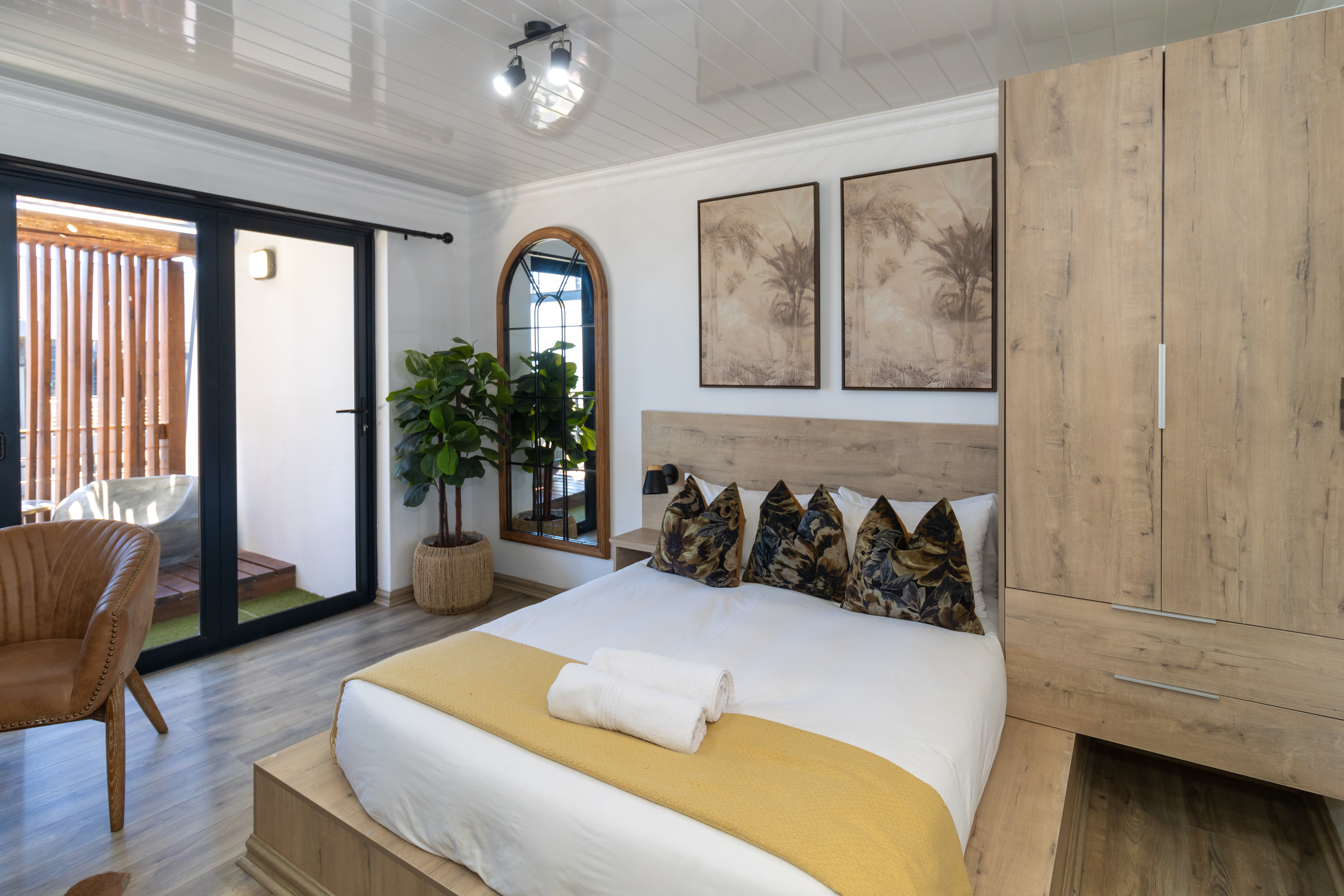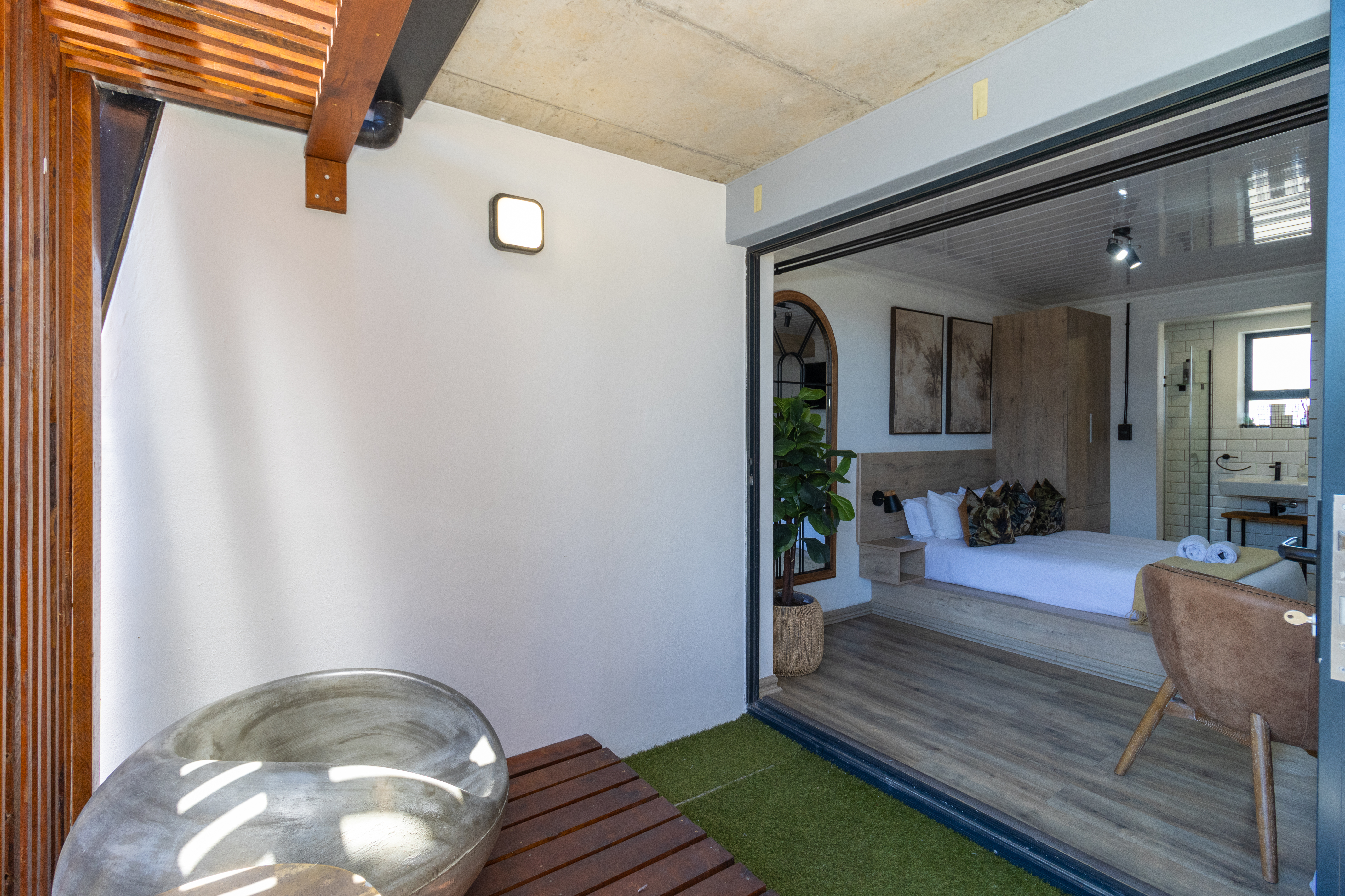The sleeping area is tastefully appointed with built-in storage and elegant finishes, creating a calm and relaxing atmosphere. The modern bathroom complements the aesthetic beautifully, featuring a contemporary open-concept shower and clean, refined finishes.