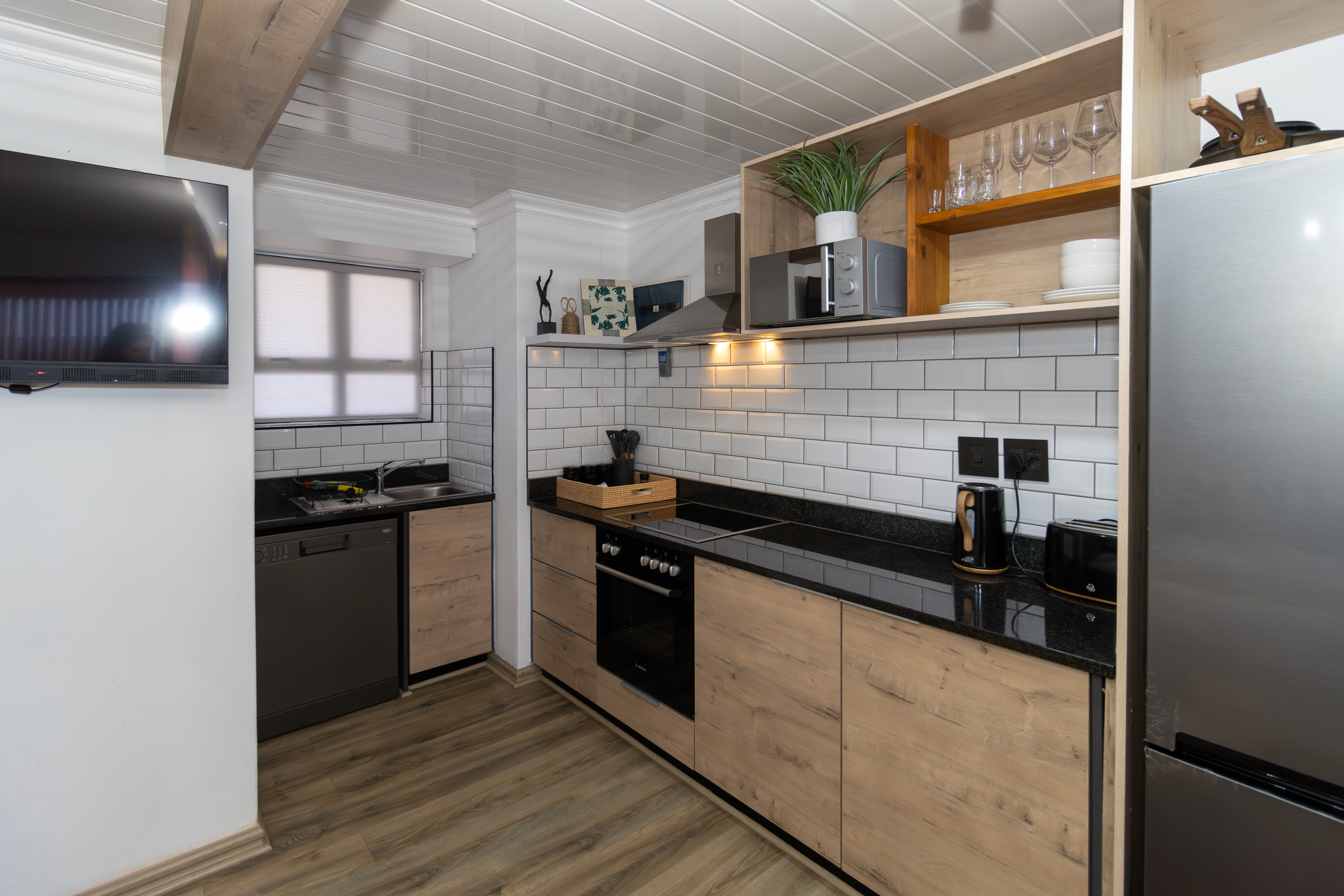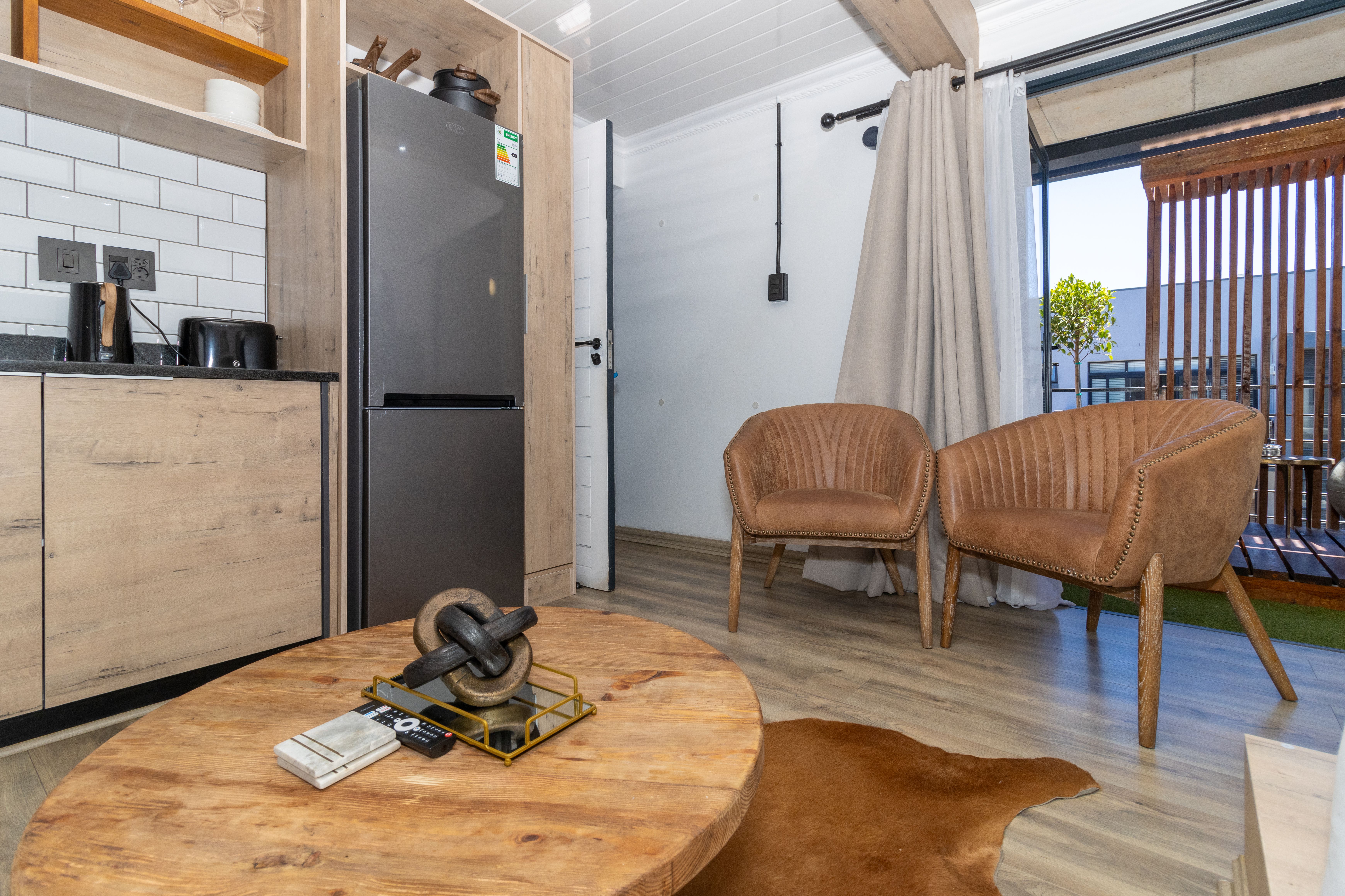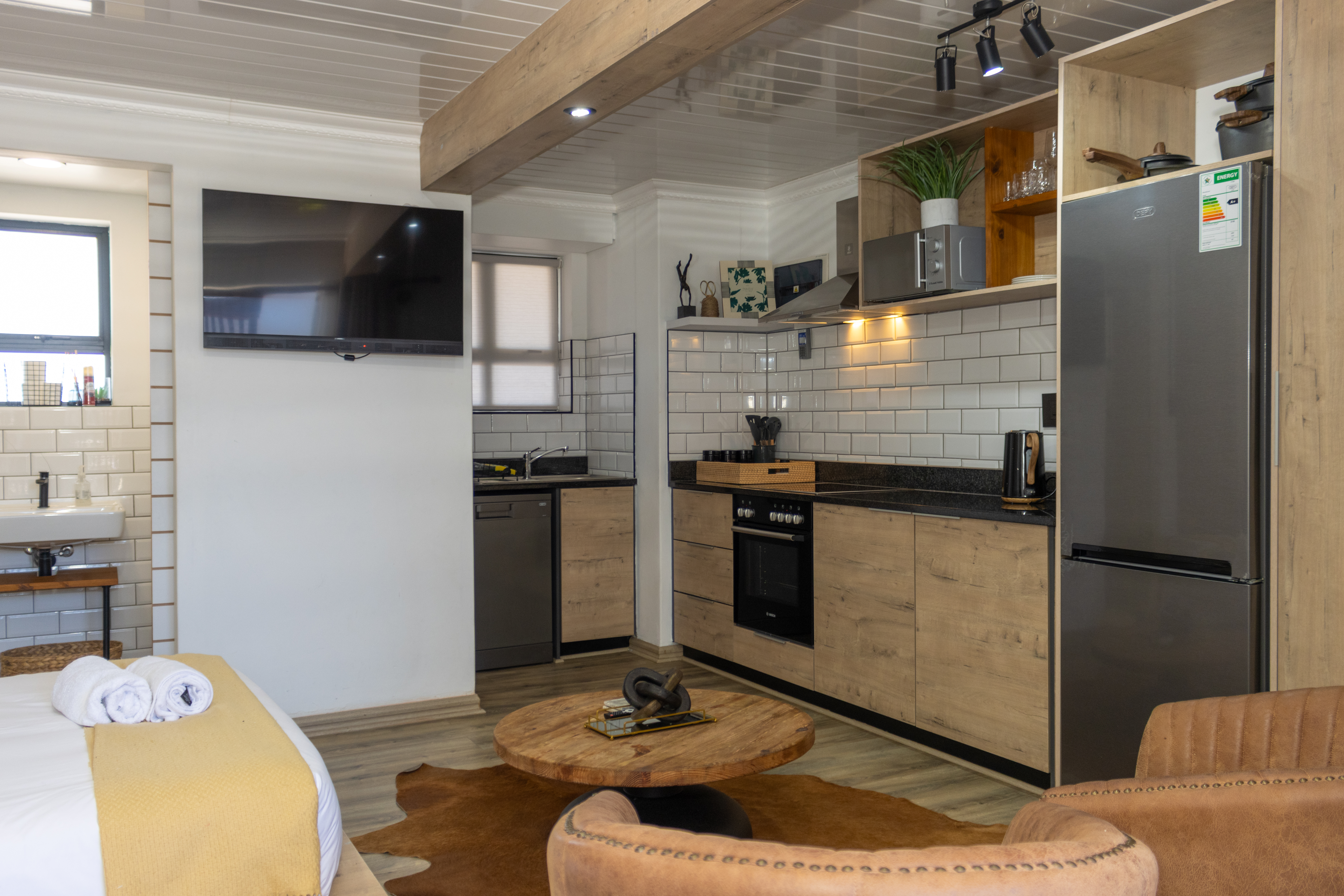 The open-plan layout seamlessly combines the kitchen, living, and sleeping areas, creating a light-filled space that maximises every square metre. The modern kitchen is finished with sleek cabinetry, subway-tile detailing, and quality appliances, all of which are included in the sale. Designed for both practicality and style, it flows effortlessly into the living area, which is comfortably furnished and complete with a wall-mounted television — making this apartment truly move-in ready.