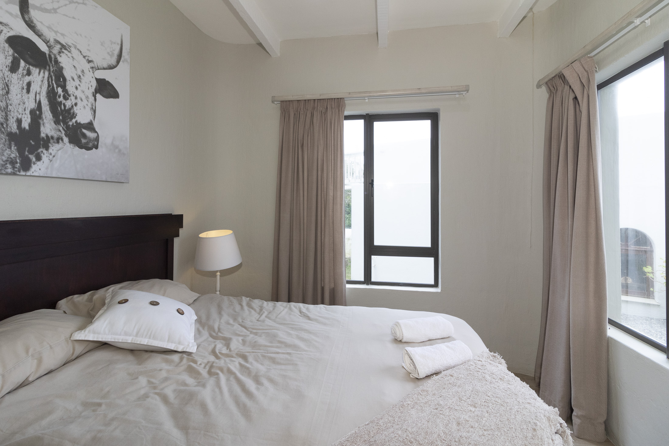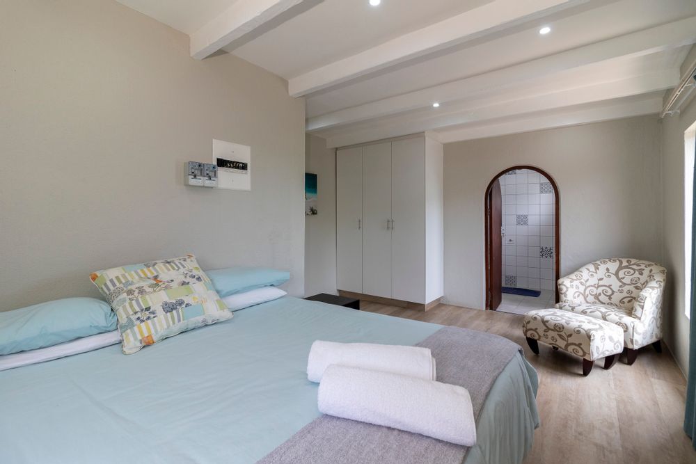 Upon entering the home you'll find an open-plan living area that seamlessly integrates the lounge, dining room, and kitchen with a scullery. A welcoming fireplace in the lounge adds warmth during chilly winter evenings. The main house comprises five bedrooms, two featuring en-suite bathrooms, while the remaining three share a common bathroom. Strategically positioned entertainment areas on the North, South, and West sides of the home provide options for hosting gatherings shielded from the elements. An indoor braai offers an alternative for unfavorable weather. Beneath one of the patios, a 20,000-liter water tank and additional rainwater tanks, connected through a pump system, cater to water needs throughout the property. Palisade and wood fencing enclose the entire premises.