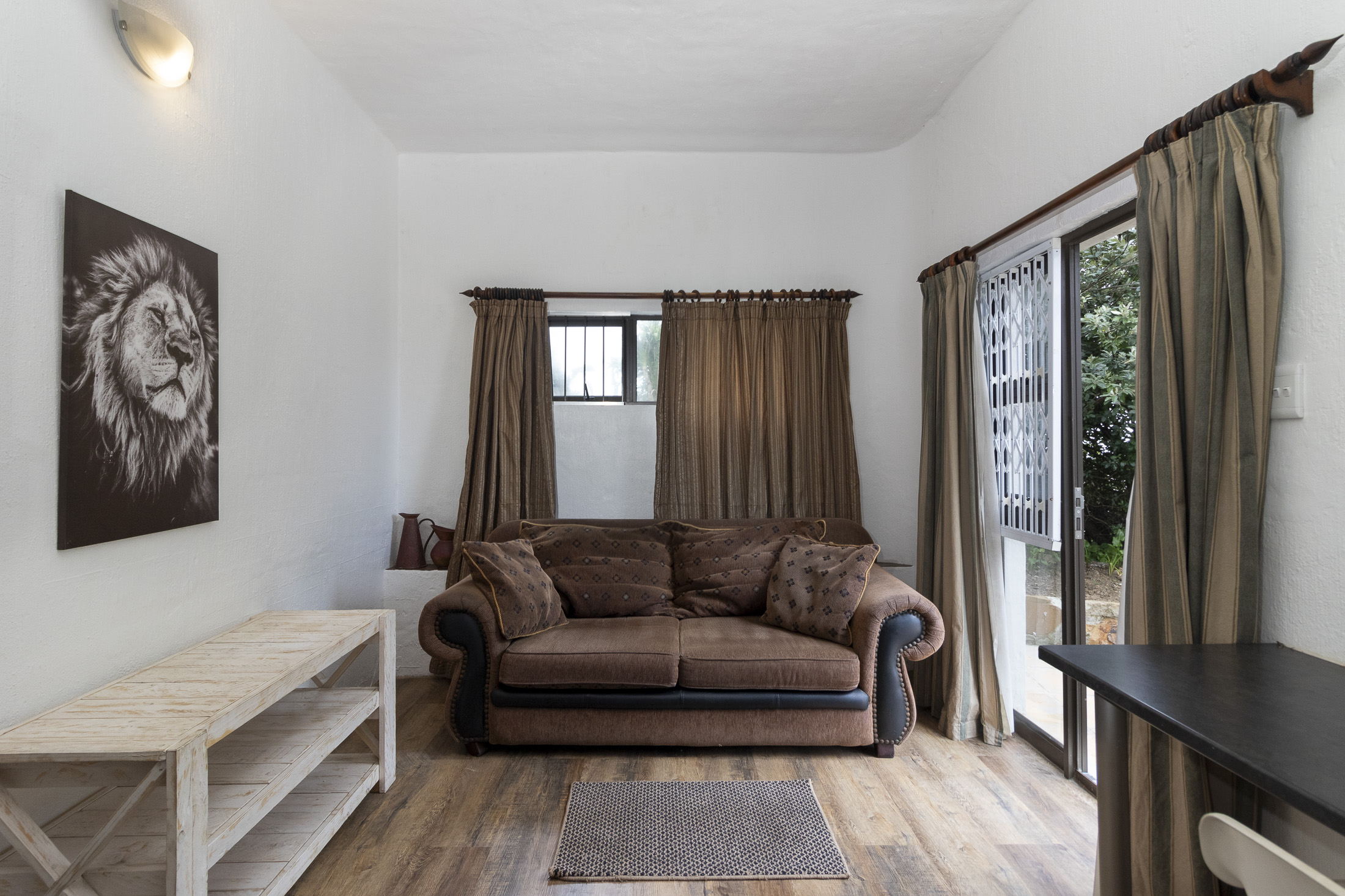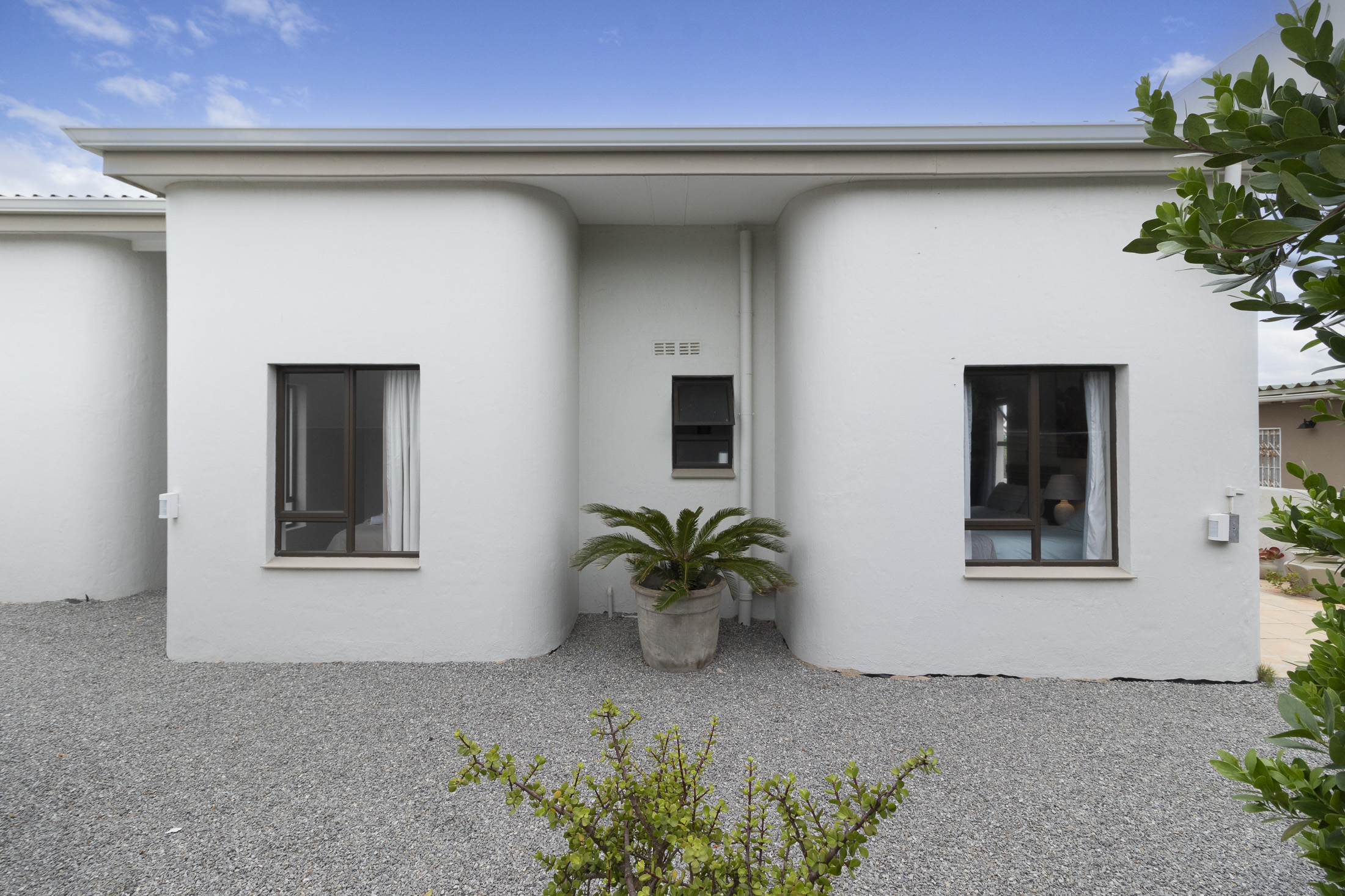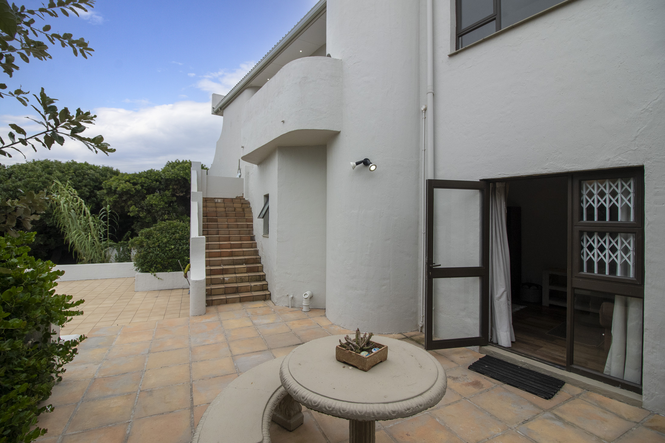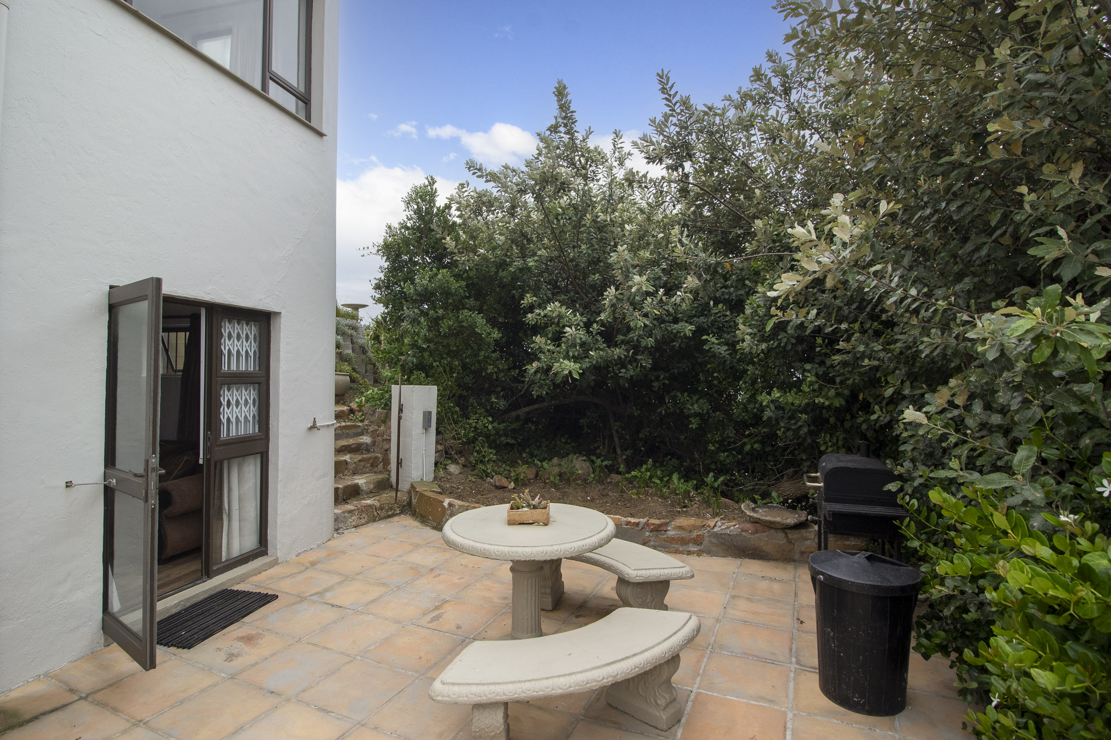 The separate entrance to the flatlet, accessible via Muirfield Avenue, leads to a double garage. This self-contained unit boasts a bedroom, bathroom, small lounge, compact kitchen, and a dedicated braai area.