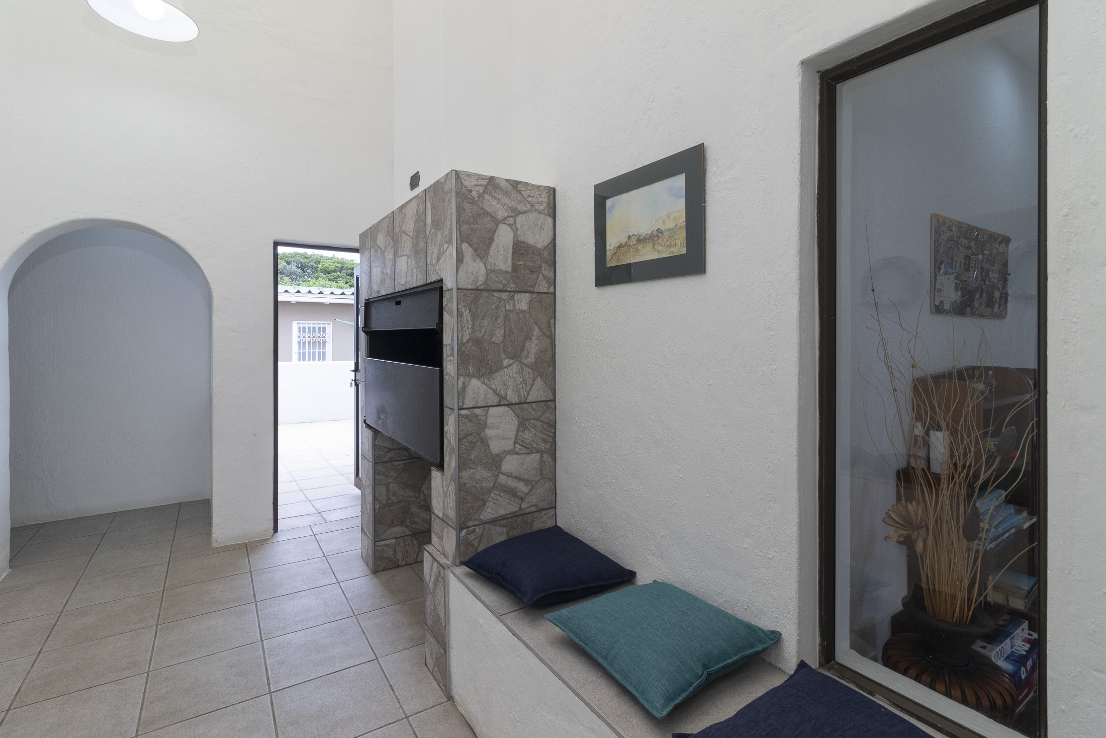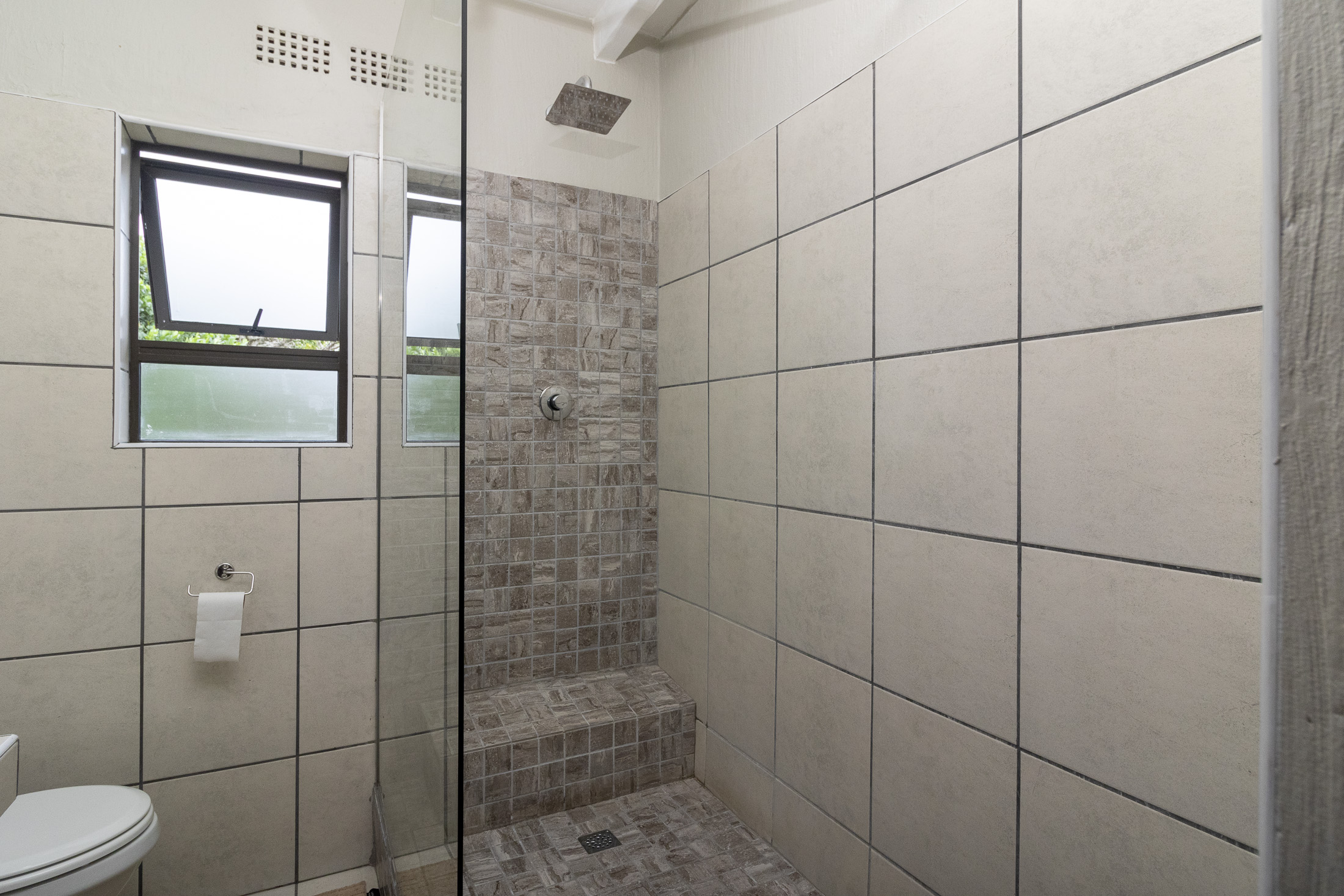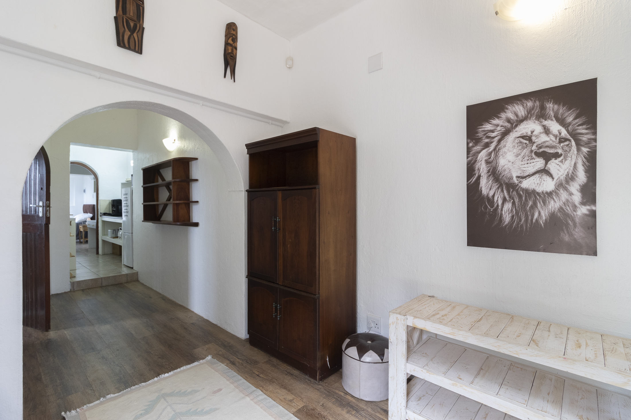 The separate entrance to the flatlet, accessible via Muirfield Avenue, leads to a double garage. This self-contained unit boasts a bedroom, bathroom, small lounge, compact kitchen, and a dedicated braai area.