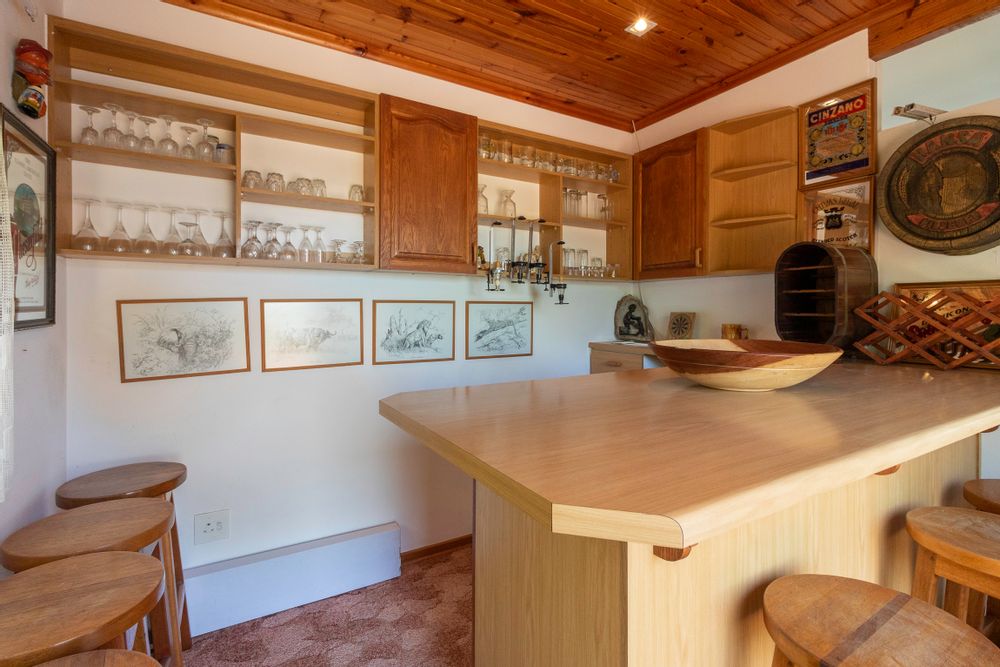 An indoor staircase at the rear of the home ascends to the second level of this expansive property. Here, you'll find a spacious lounge and dining area, enhanced by large windows and a balcony that frame breathtaking ocean views. A separate bar adjoins the lounge, seamlessly opening onto a wooden deck—an ideal spot for entertaining, especially when the southern winds sweep in from the sea.